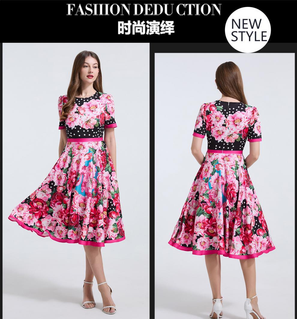 H-8212# 2025新款跨境春夏定位圆点条纹花朵印花裙 圆领修身高腰大摆连衣