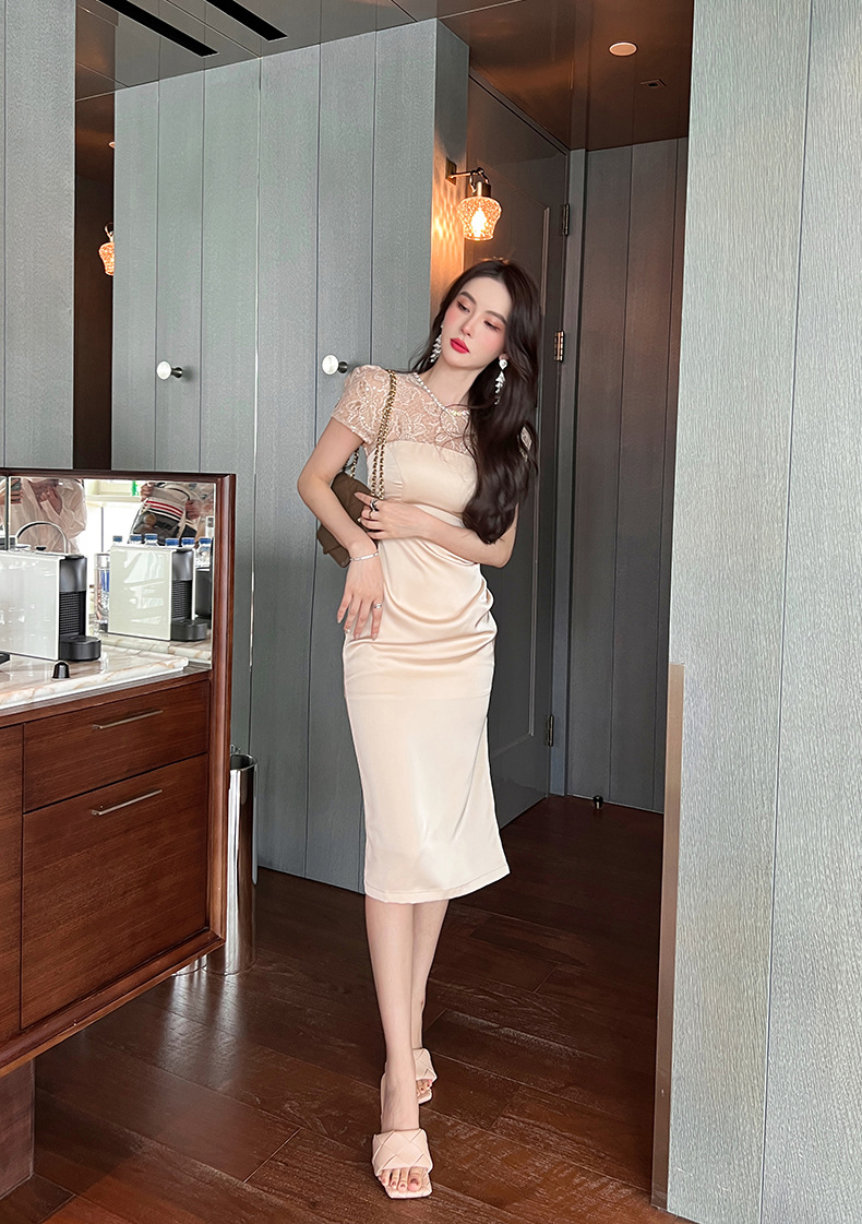C-2126# 2025夏季新款重工镶钻优雅气质蕾丝拼接修身缎面包臀连衣裙10079