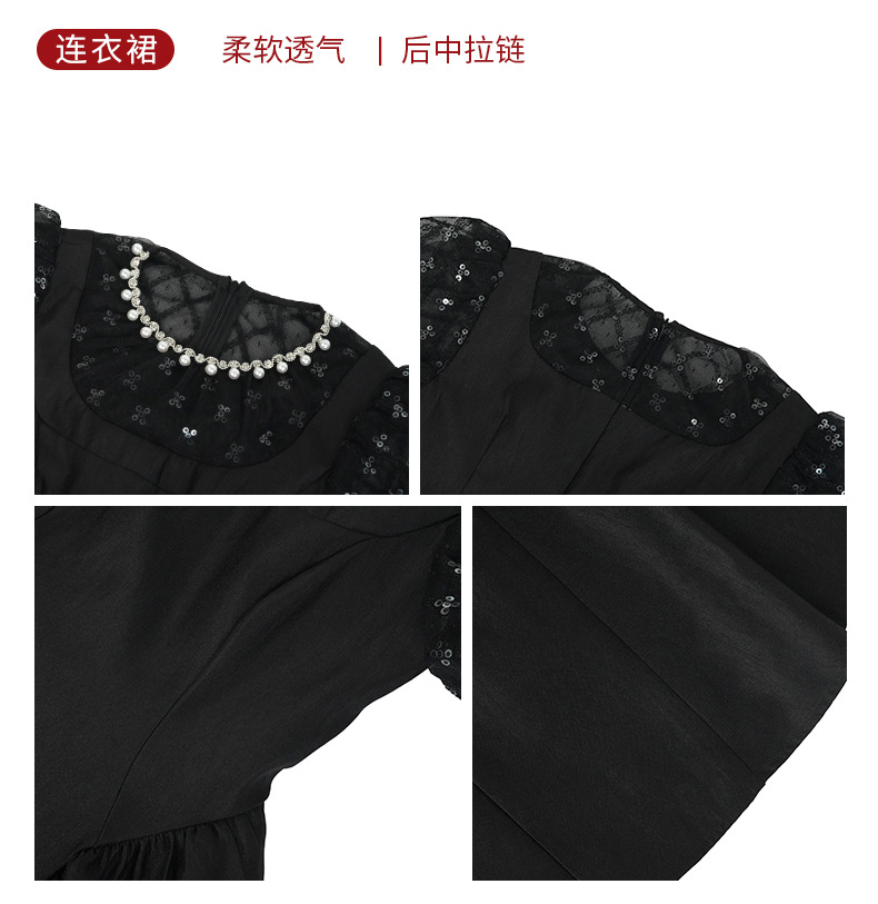 C-2155# 黑色收腰连衣裙女2025夏新款泡泡袖复古显瘦赫本风小黑裙45084