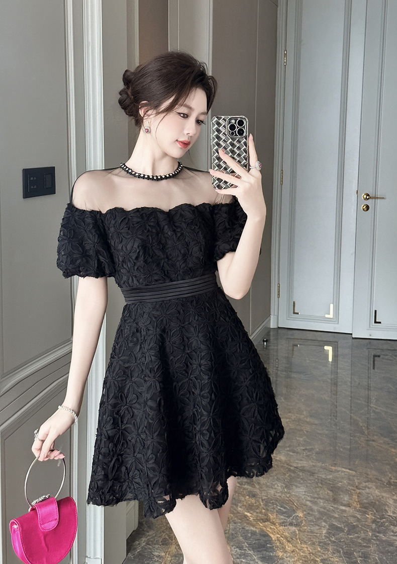 C-2180# 2025夏季新款女装名媛性感透视网纱拼接收腰a字蕾丝连衣裙21722