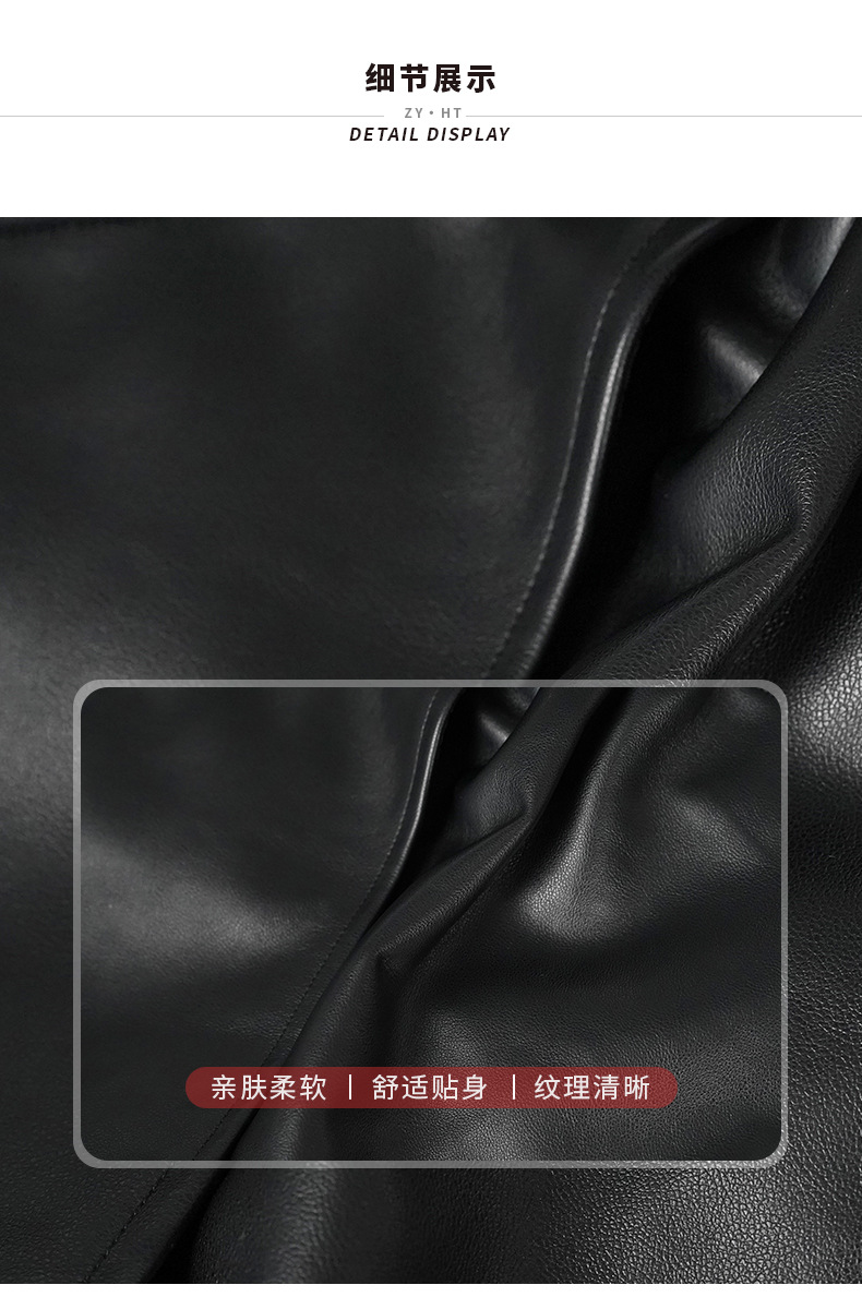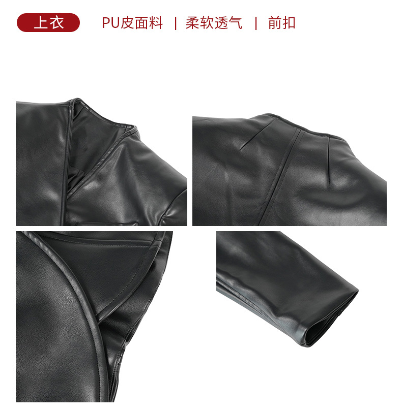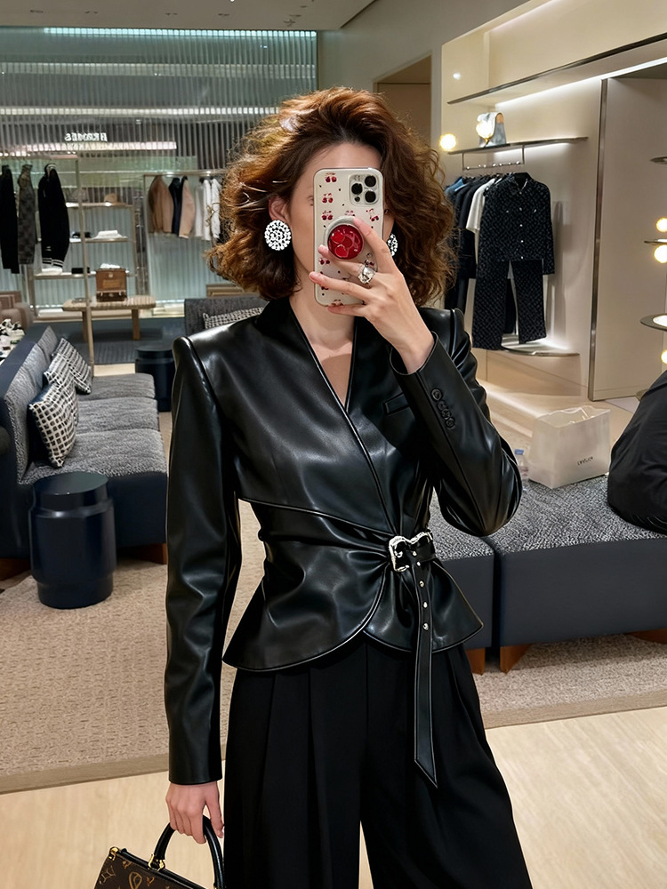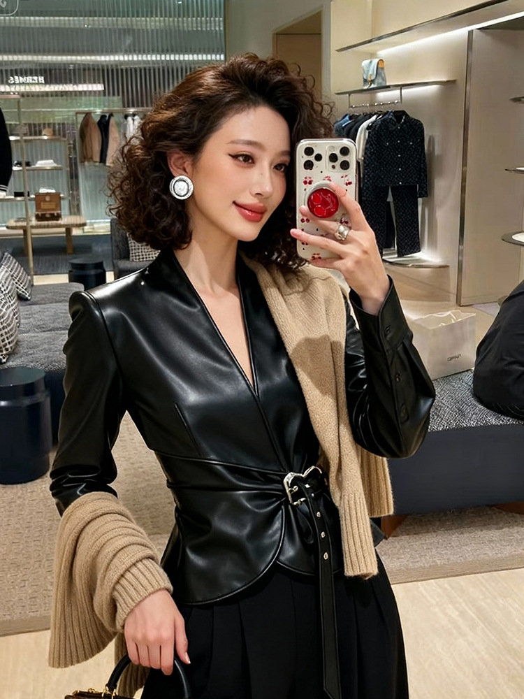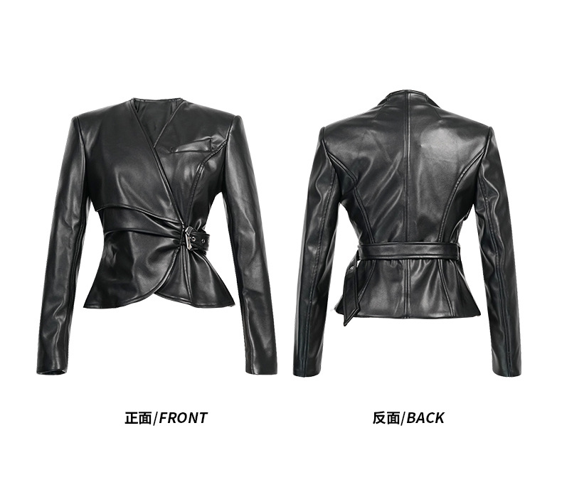 C-4641# 黑色收腰系带修身皮质外套女设计感机车短款长袖PU皮衣35392