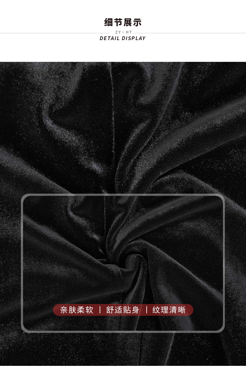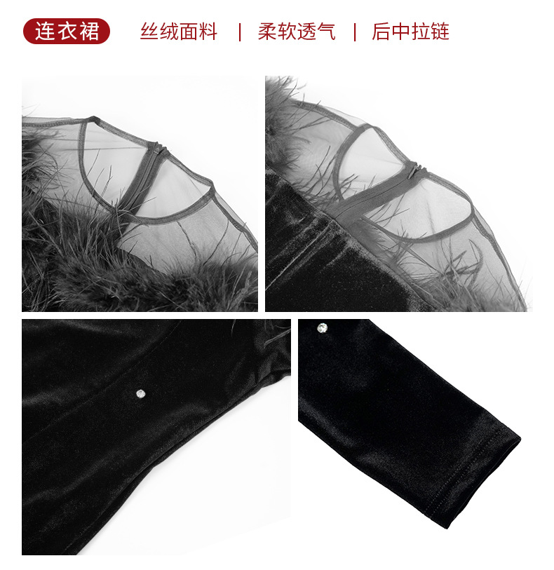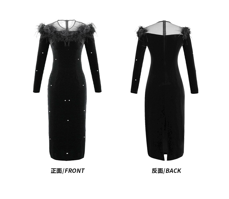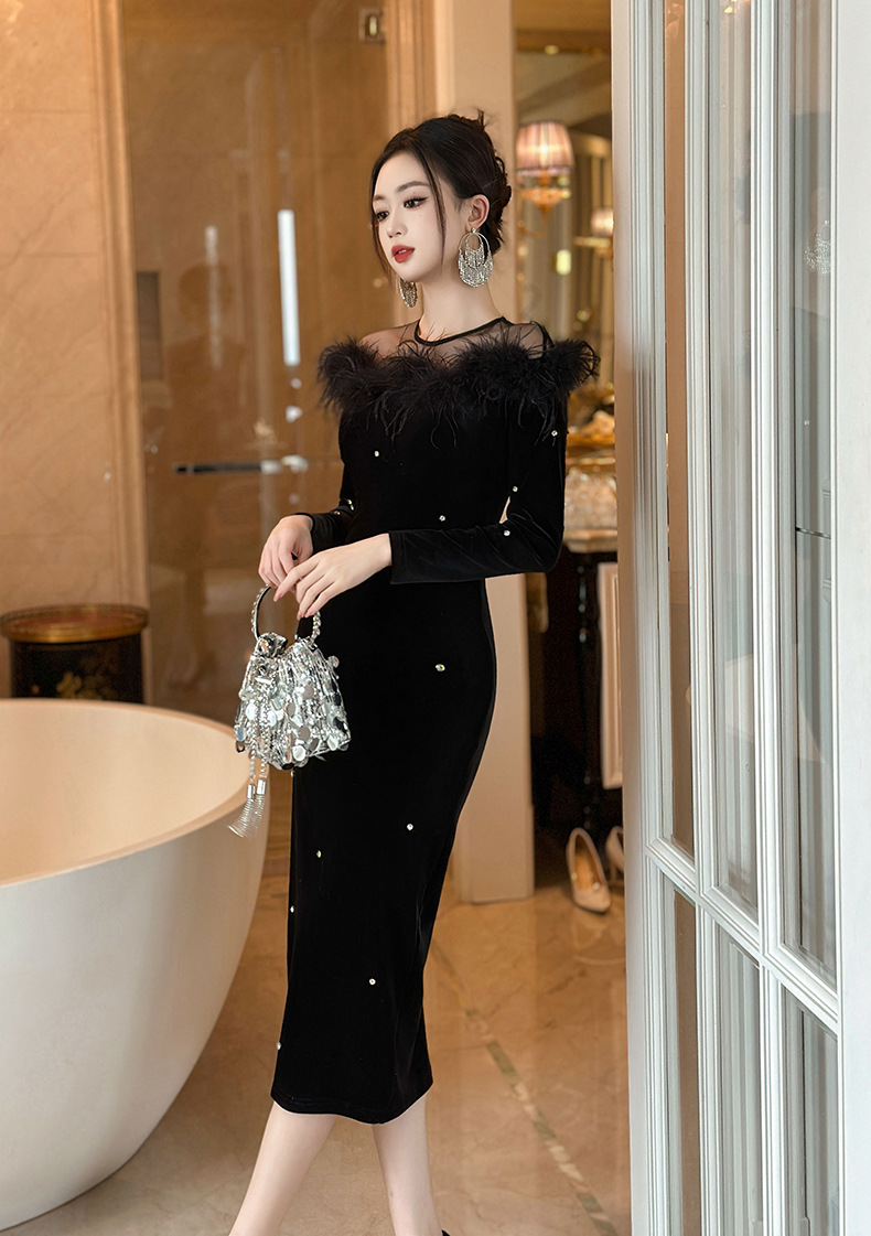 C-3105# 丝绒礼服裙2024春装新款名媛性感一字领毛边镶钻包臀连衣裙30674