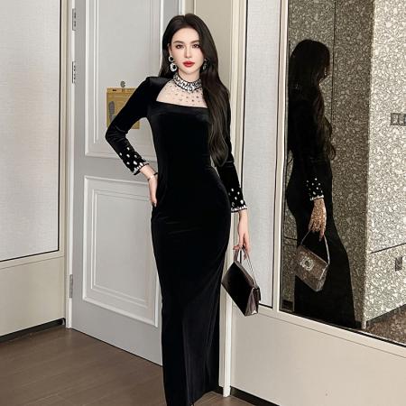 C-4637# 复古丝绒连衣裙...