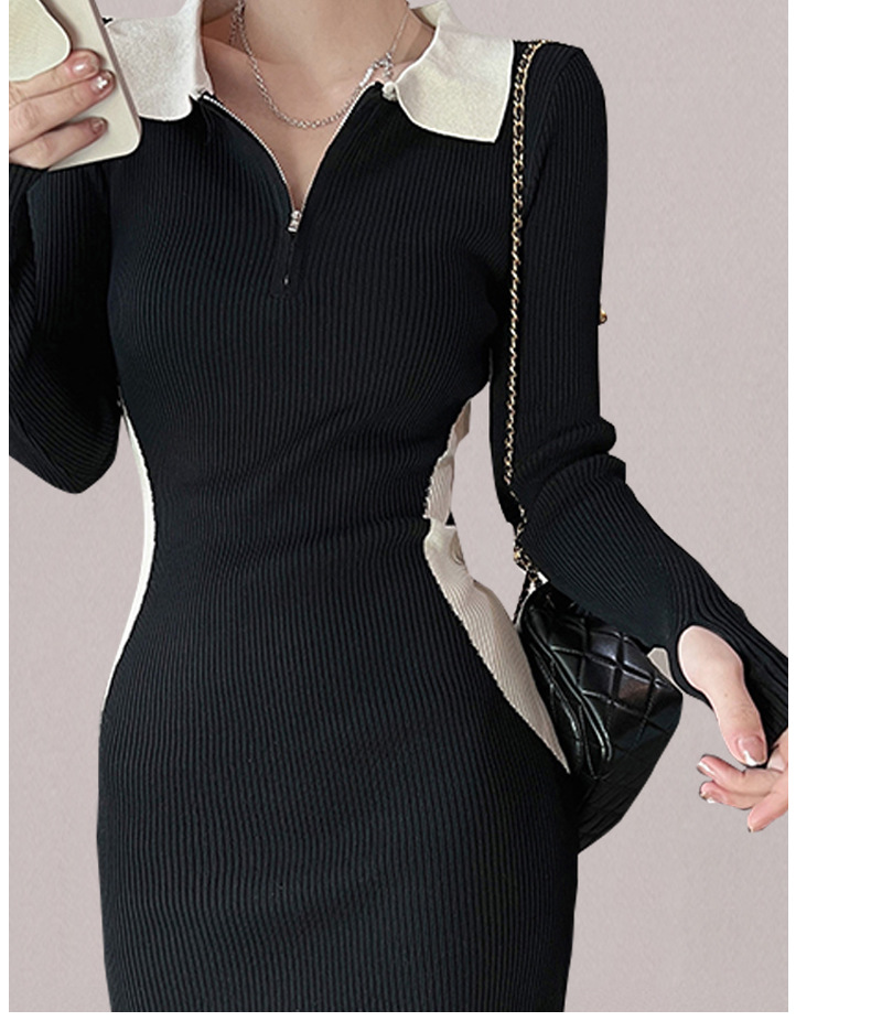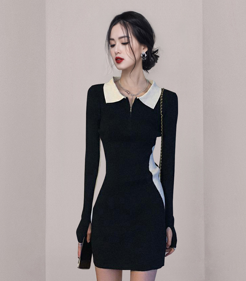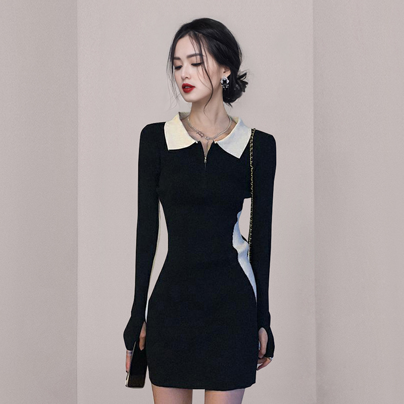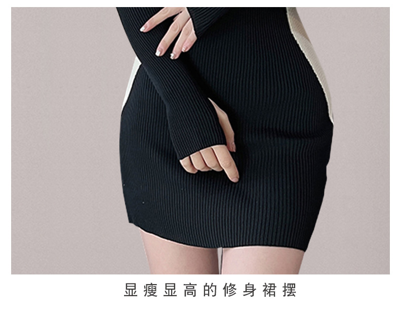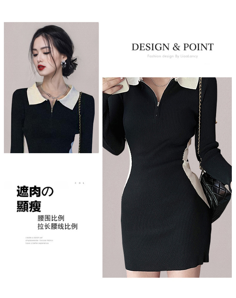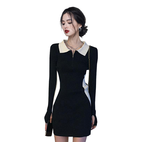 T-1144# 毛衣翻领连衣裙2022秋冬新款名媛长袖气质显瘦修身针织包臀一步裙