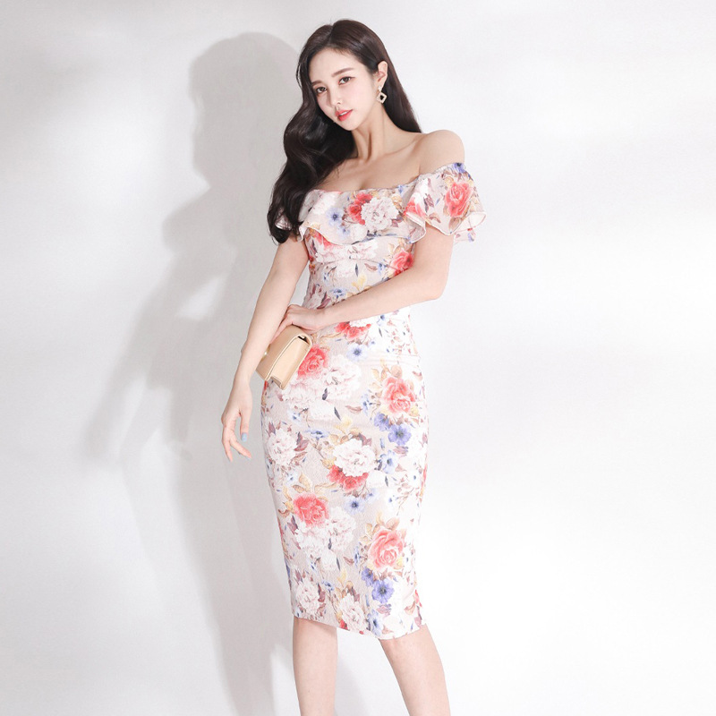 O-1460# 2023夏装韩版女神范气质性感一字领荷叶边修身复古印花包臀连衣裙
