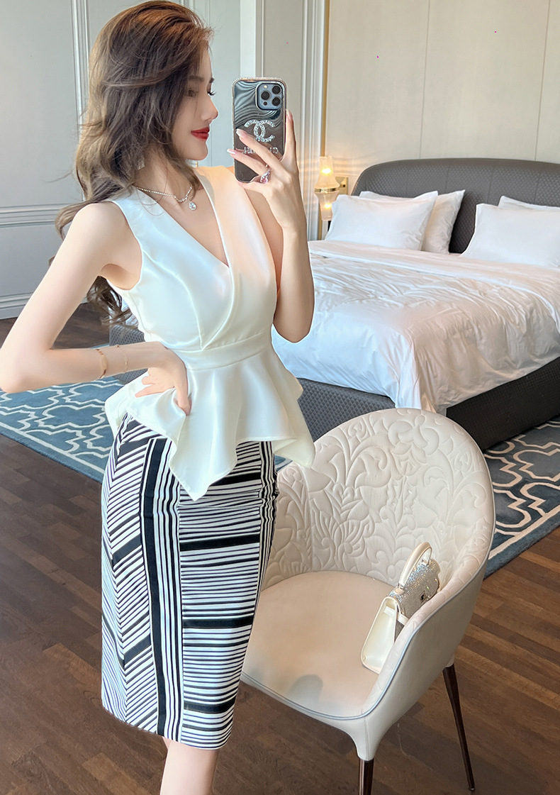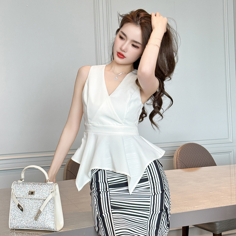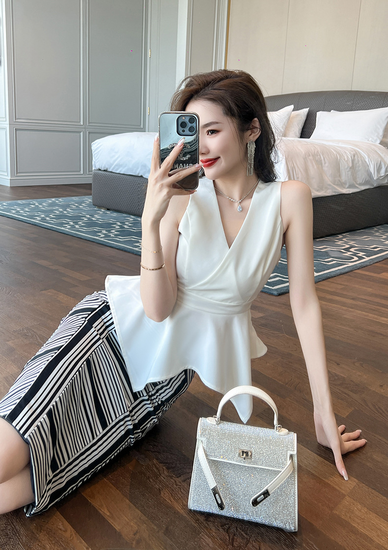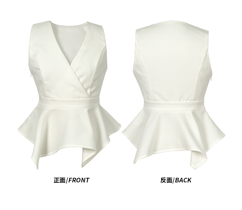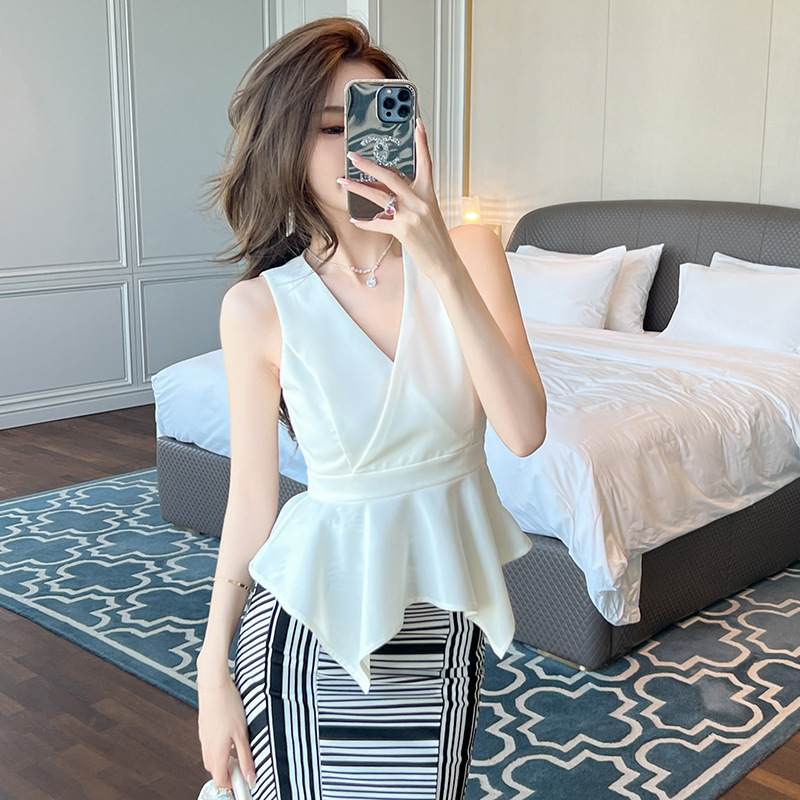 C-2486# 2023夏季新款女装法式气质V领收腰不规则上衣白色洋气衬衫20455