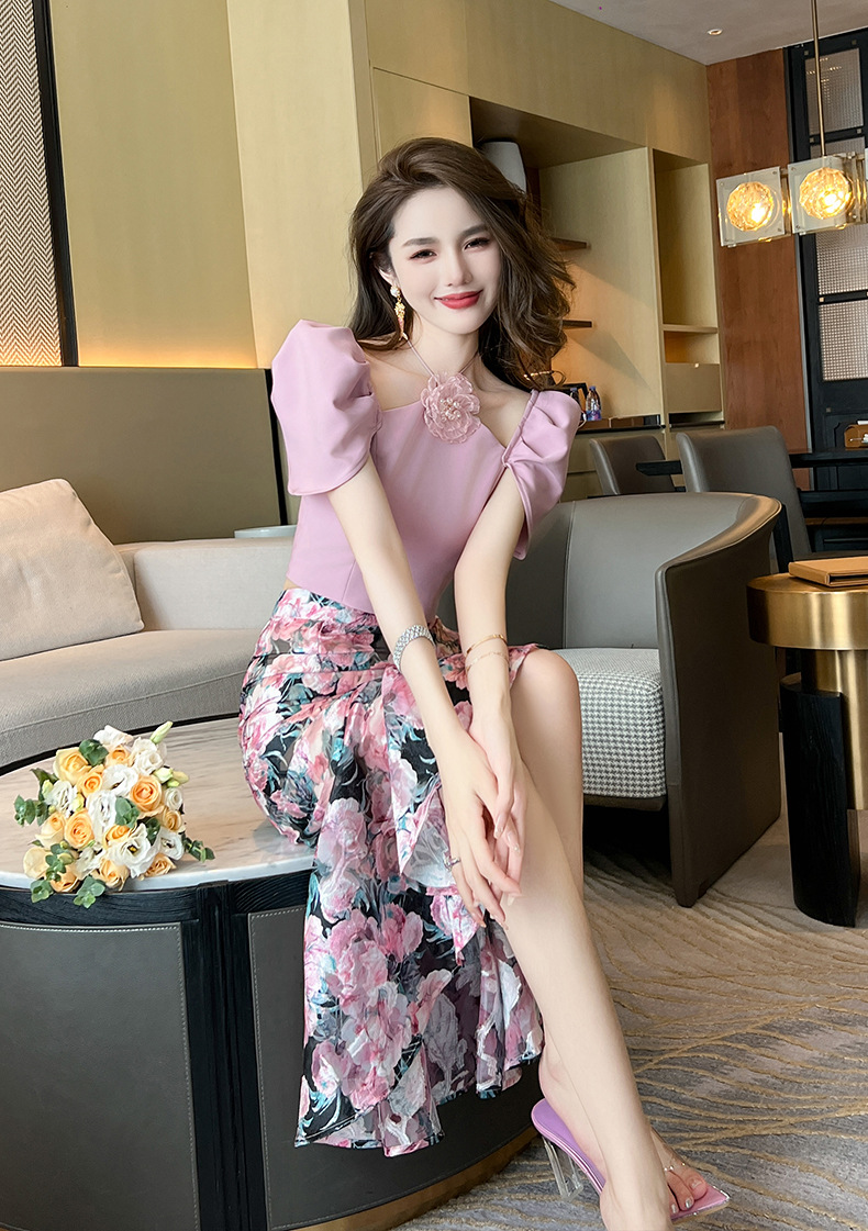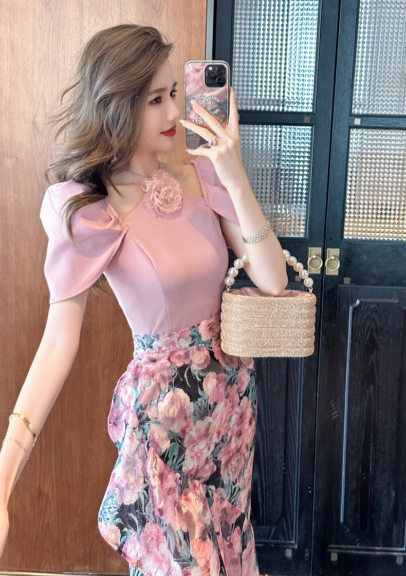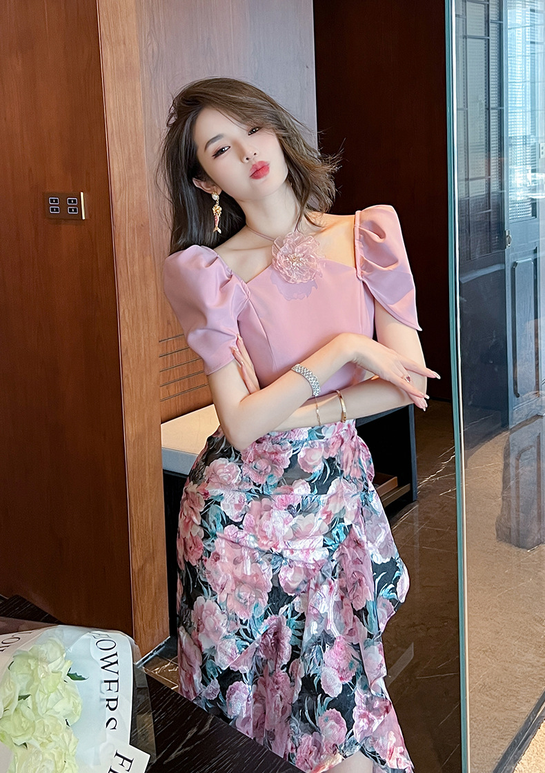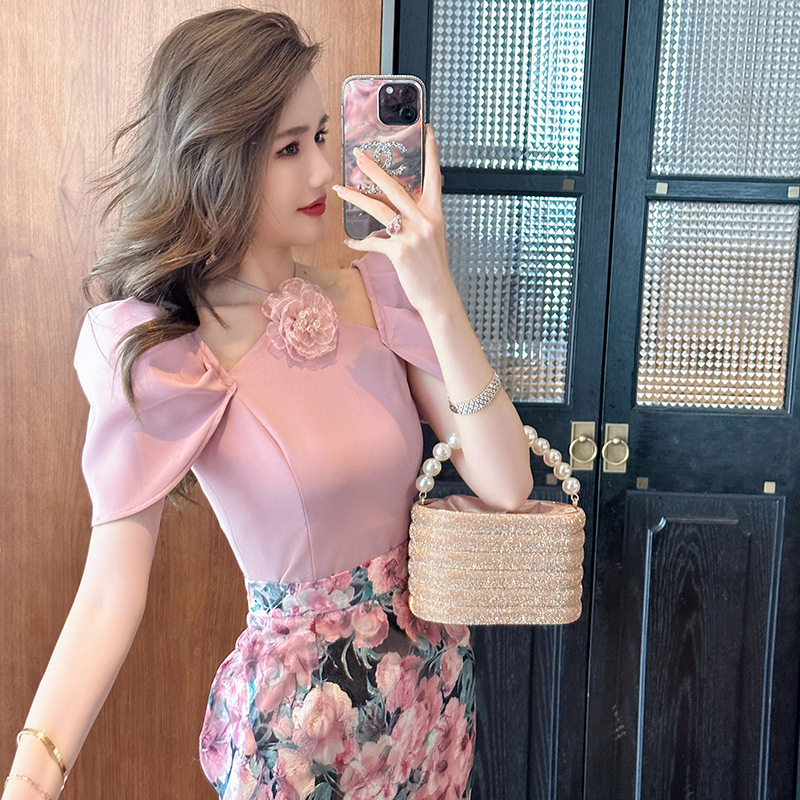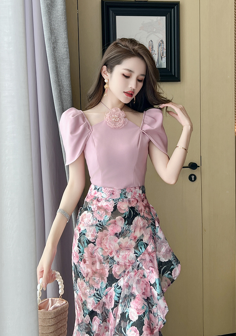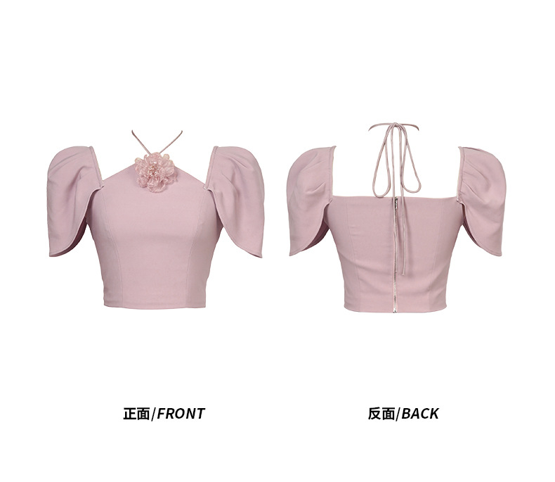 C-2618# 夏季新款名媛气质挂脖修身泡泡袖上衣粉色立体花朵短款小衫20572