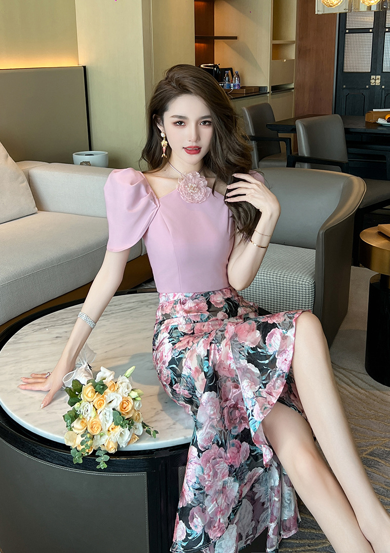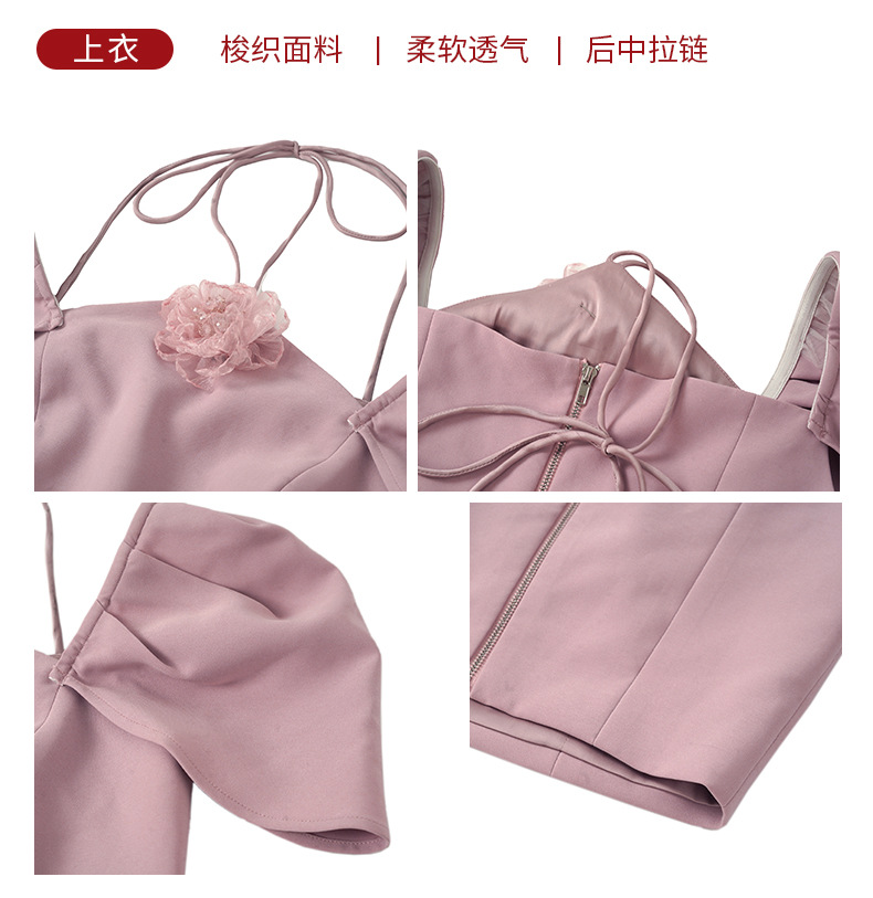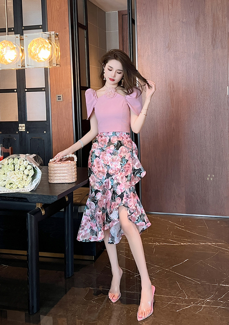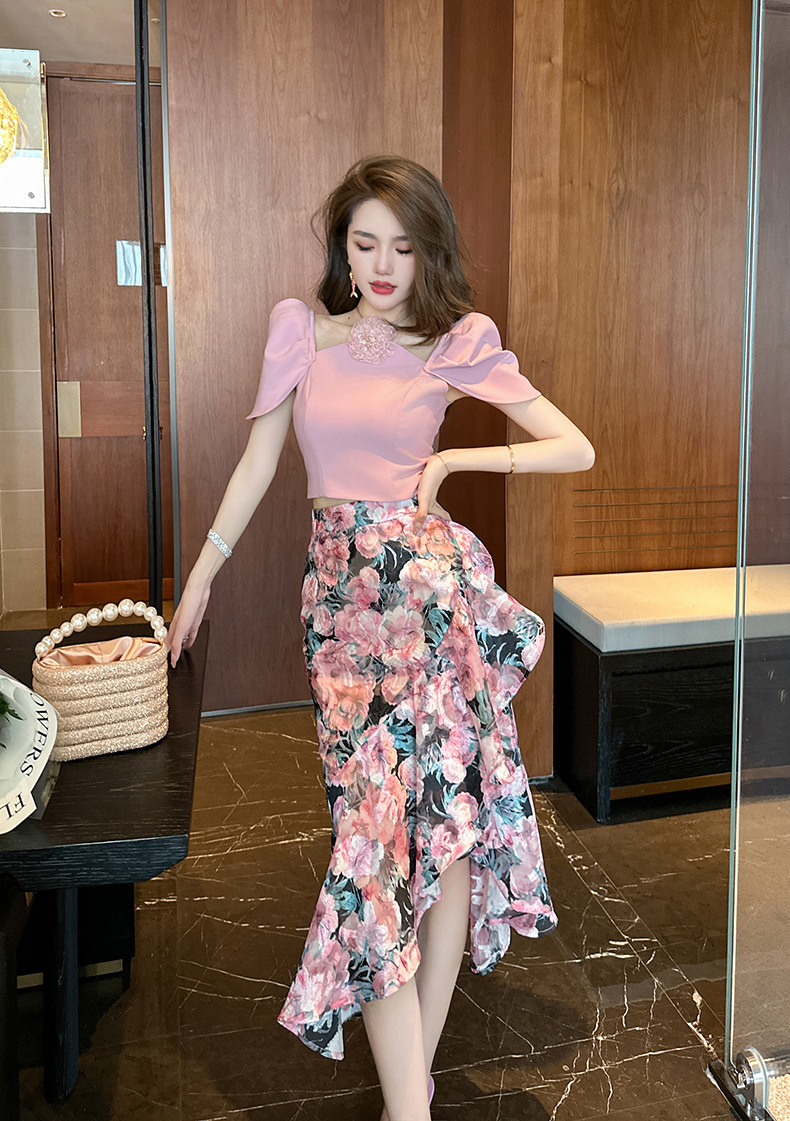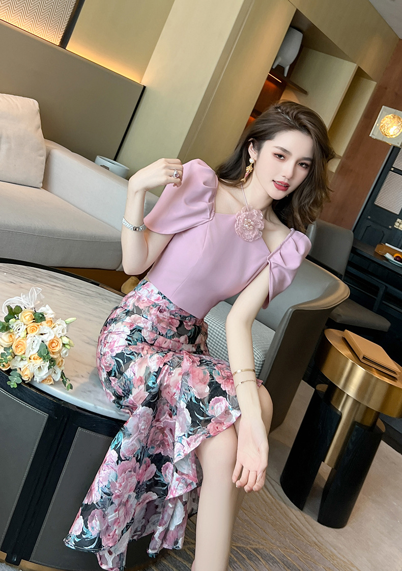 C-2618# 夏季新款名媛气质挂脖修身泡泡袖上衣粉色立体花朵短款小衫20572