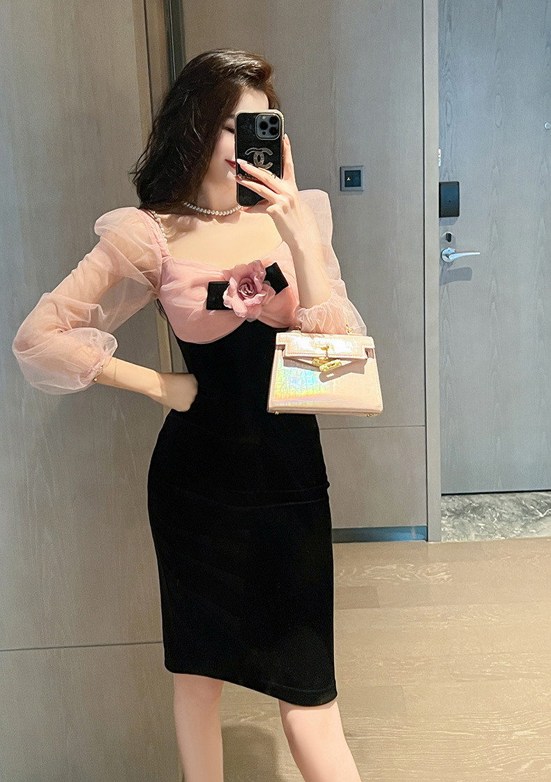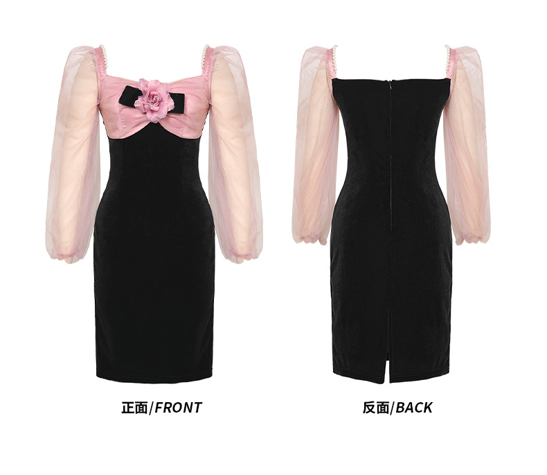 Home > 11月20日---女装新款 > C-2995# 年会小礼服裙2023秋冬装新款法式方领网纱玫瑰花修身连衣裙9707