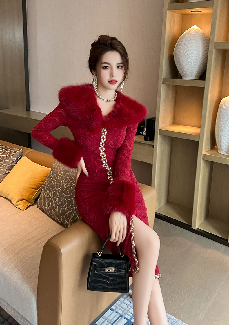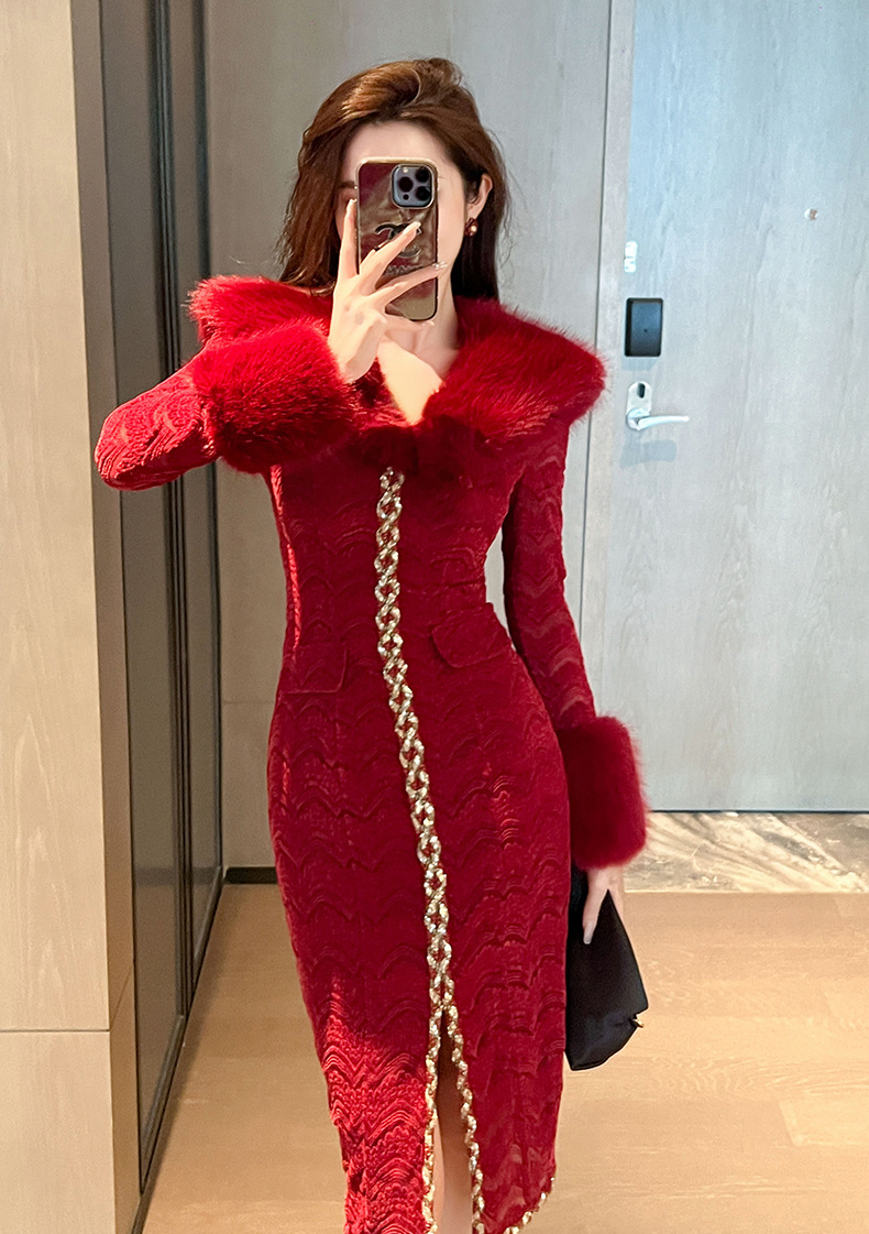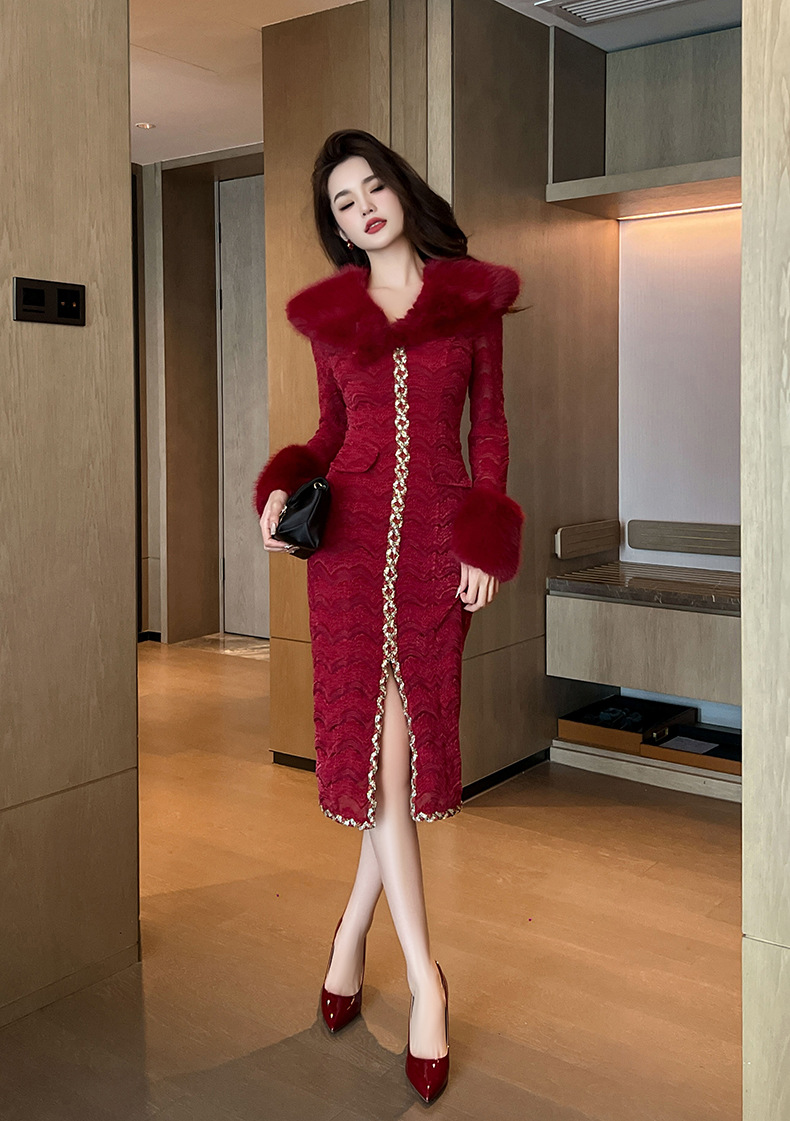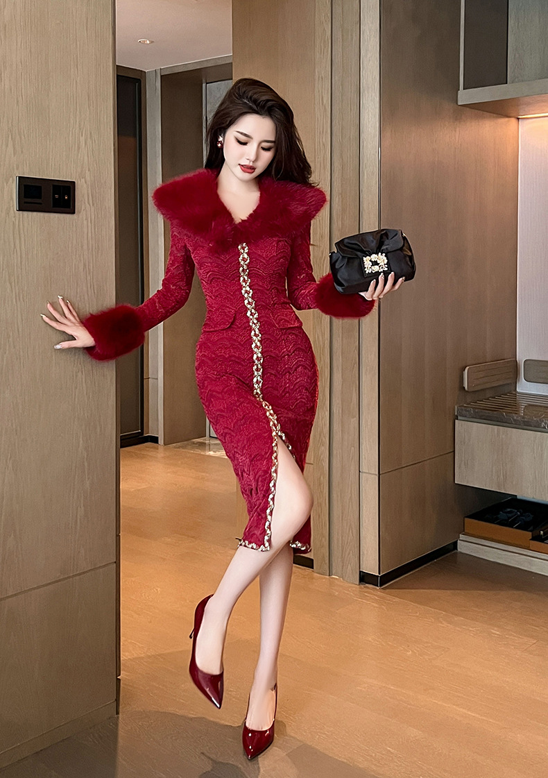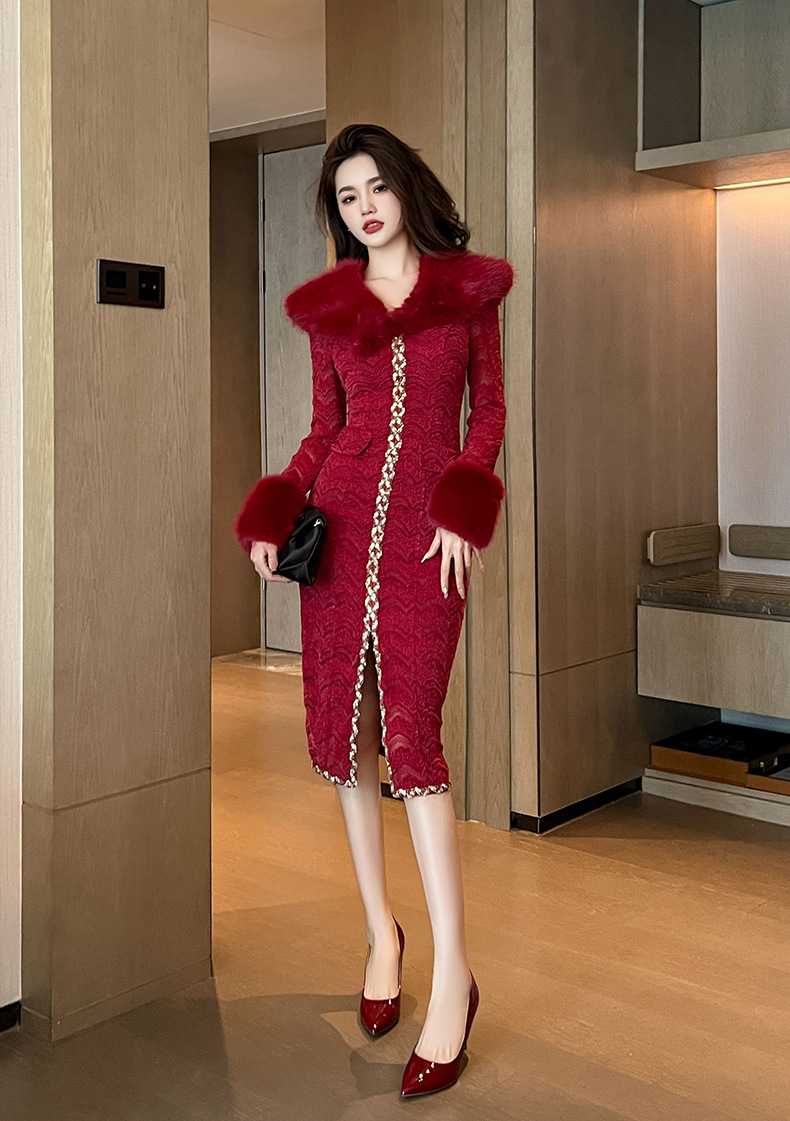 C-3150# 新年衣服2024春装新款女阔太气质洋气毛毛领修身红色连衣裙11227