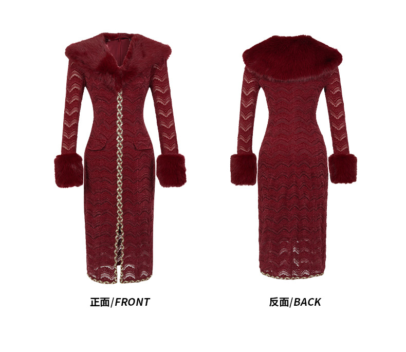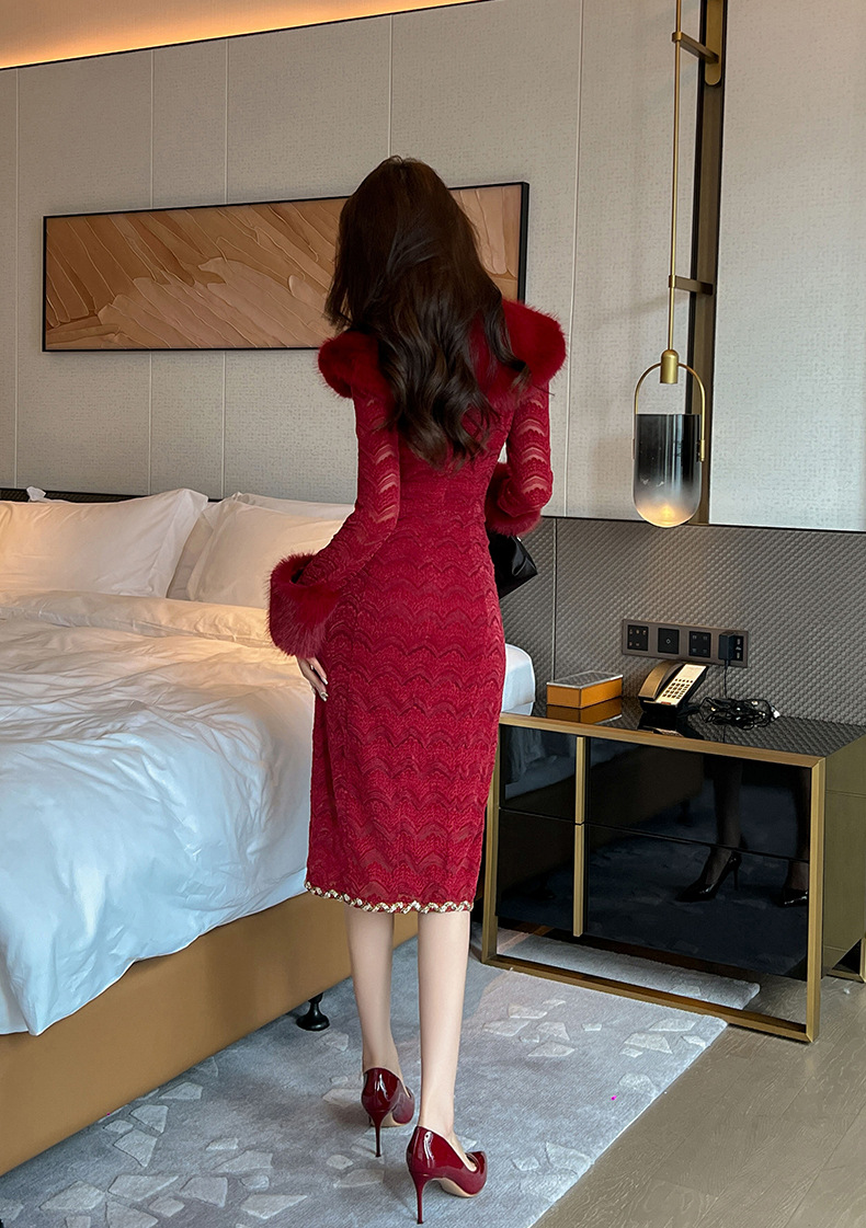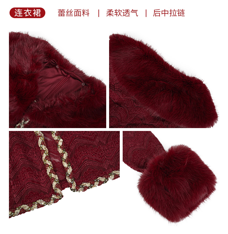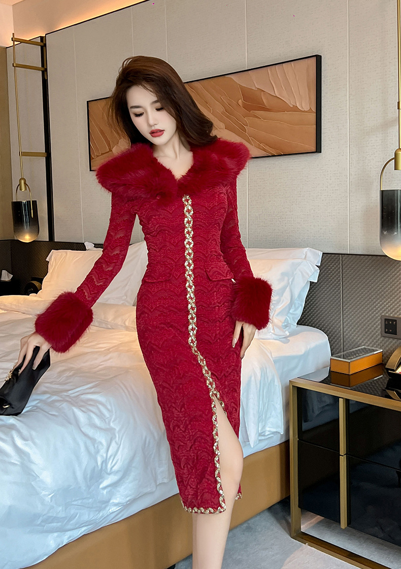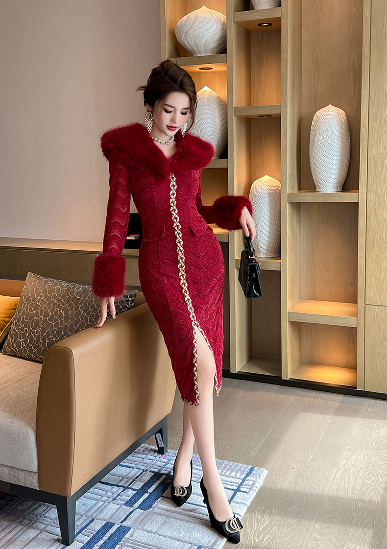 C-3150# 新年衣服2024春装新款女阔太气质洋气毛毛领修身红色连衣裙11227