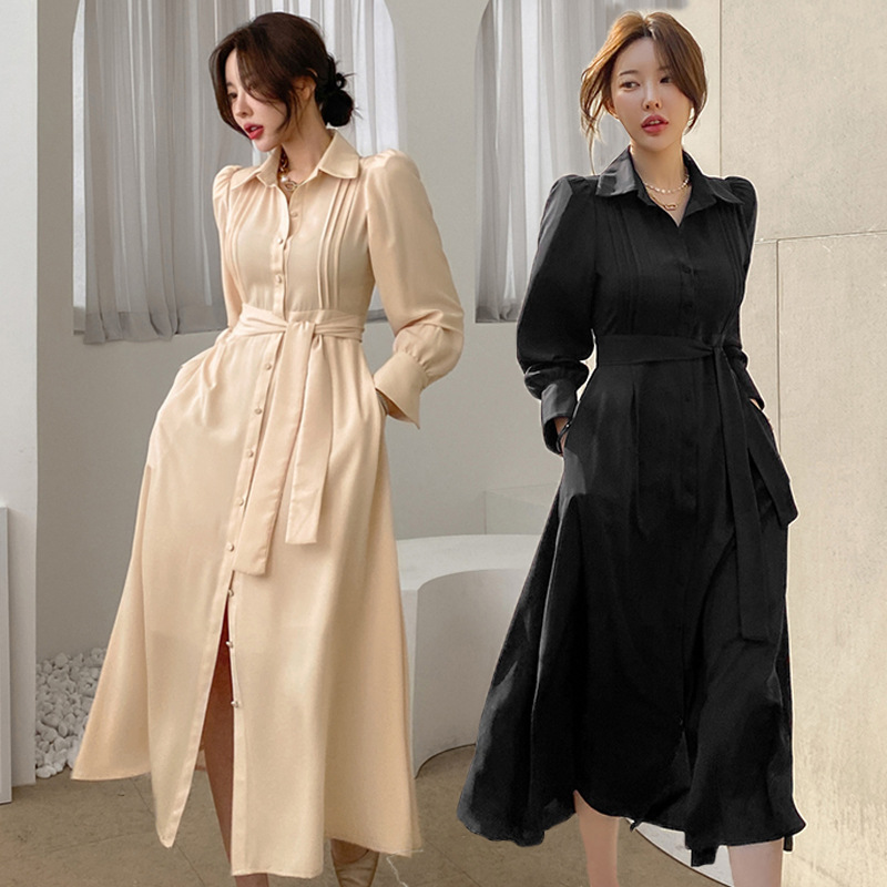S-6673# 2024春秋新款 日韩轻熟风POLO领高腰泡泡袖修身显瘦A字连衣裙7479