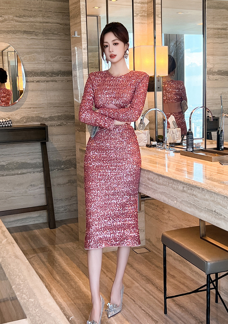 C-3583# 宴会礼服裙2024秋冬装新款女装法式圆领收腰包臀亮片连衣裙65127