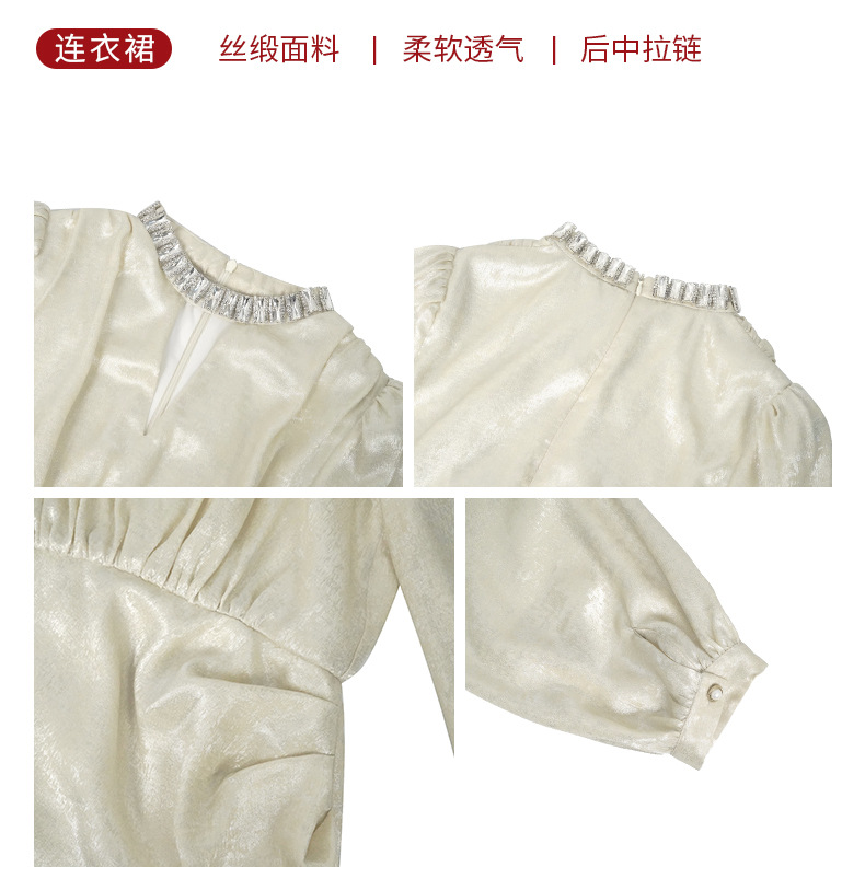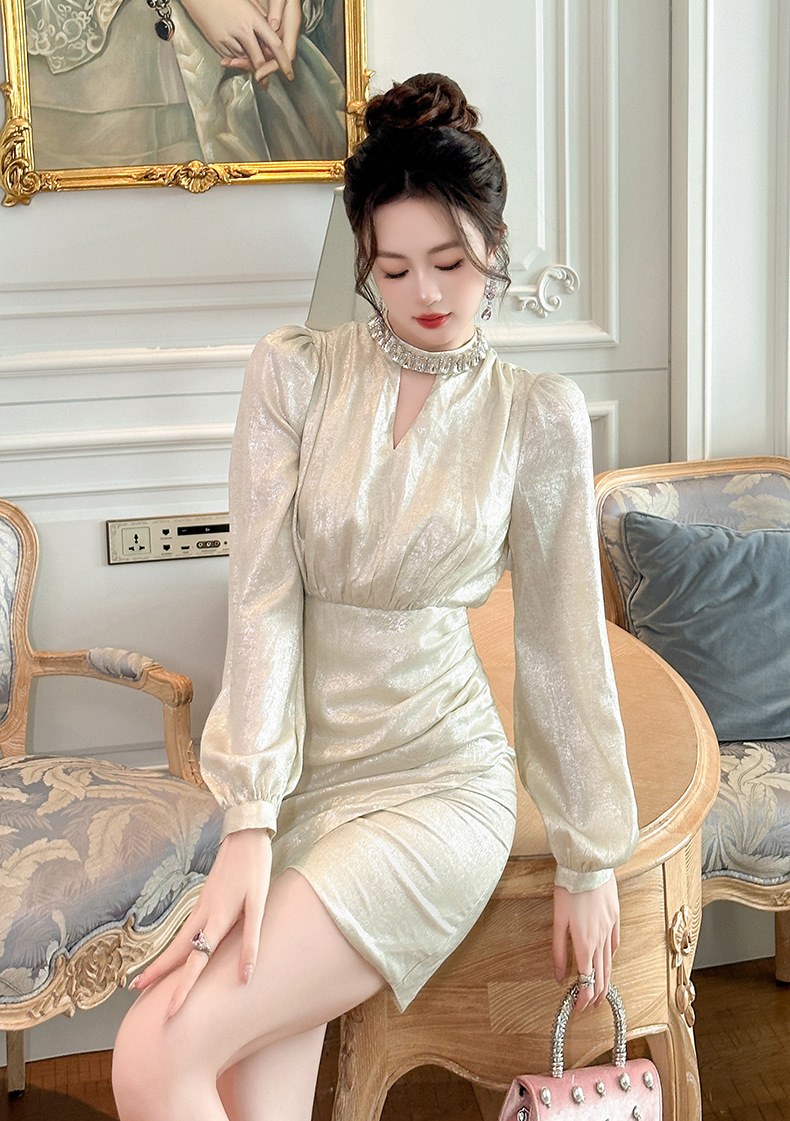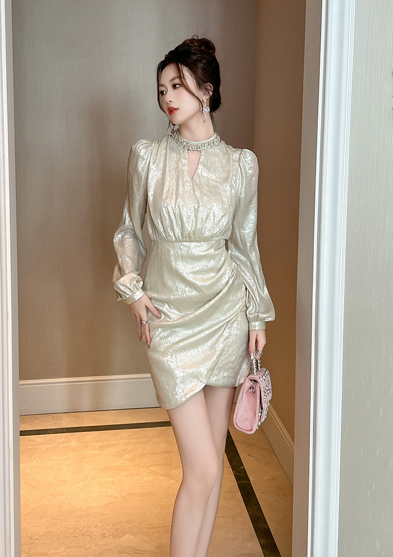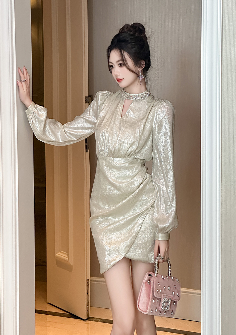 C-3605# 2024秋冬装新款女装重工镶钻圆领镂空收腰不规则包臀连衣裙21471