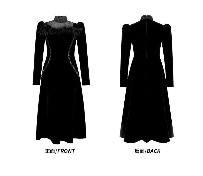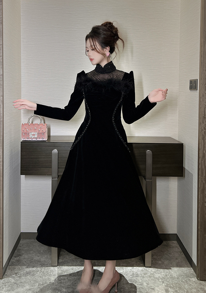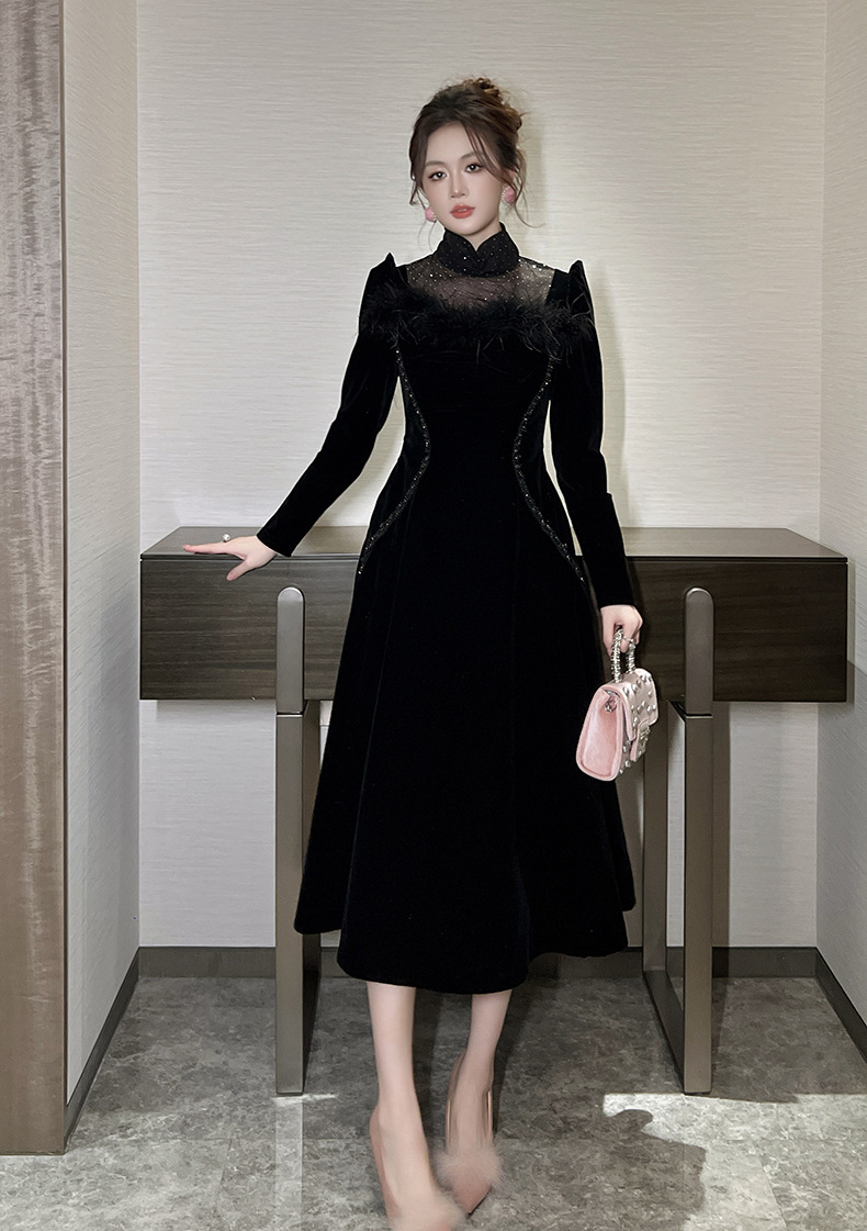 C-3862# O-1620# C-3862# 礼服长裙2025春装新款女装法式气质圆领收腰垂感丝绒连衣裙45068