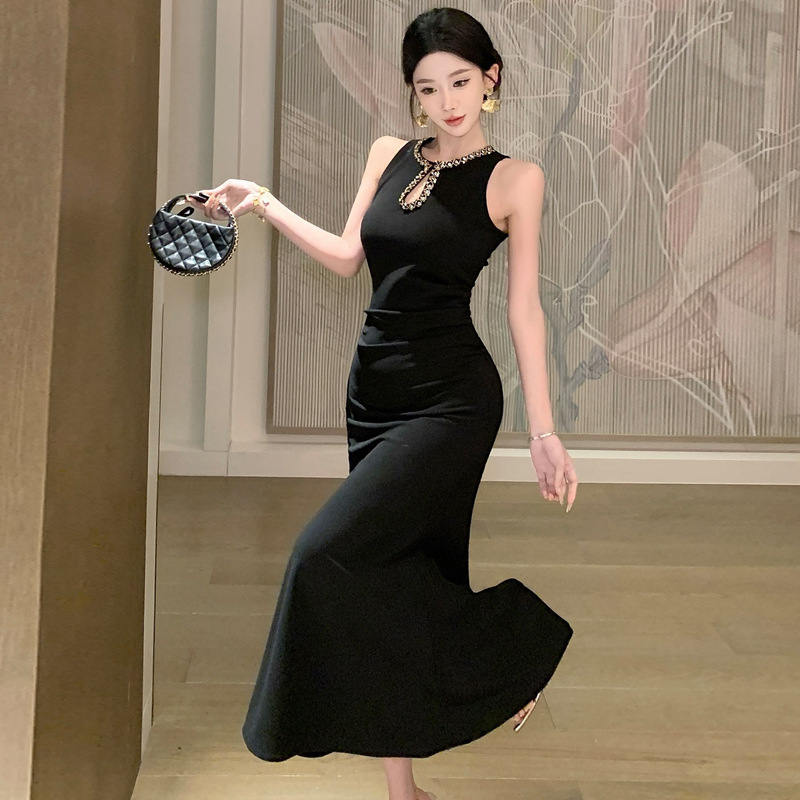 S-7692# WDS5099欧美2025跨境外贸批发轻奢气质无袖钉珠修身礼服连衣长裙