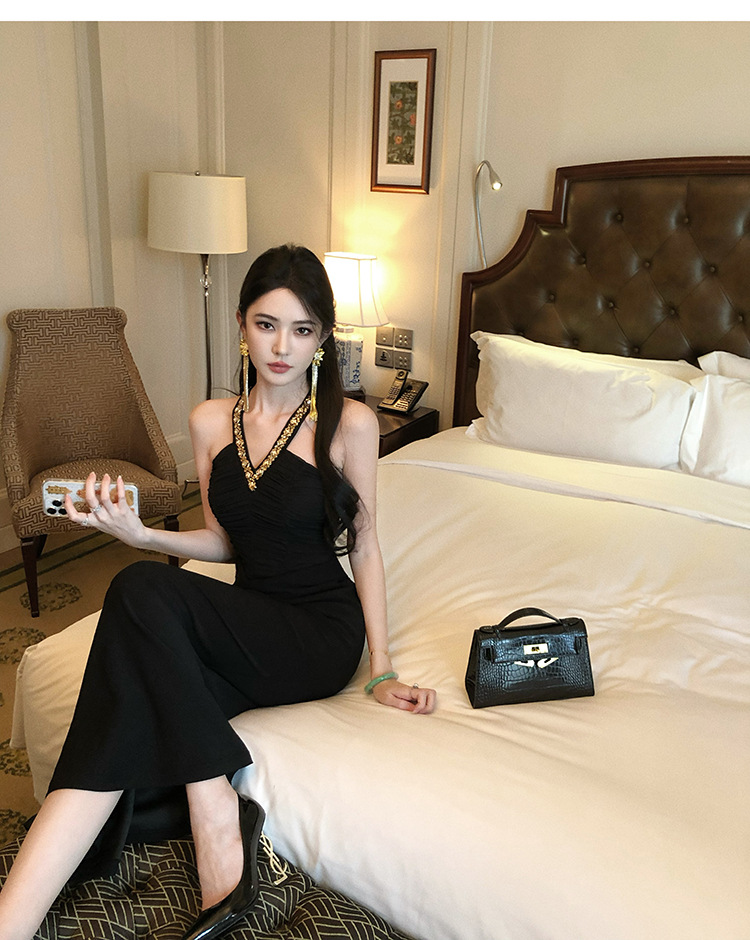 Home > 2025年6月25日---女装新款 > S-7720# WDS5017欧美2025跨境外贸批发轻奢挂脖V领珠片修身包臀礼服连衣裙