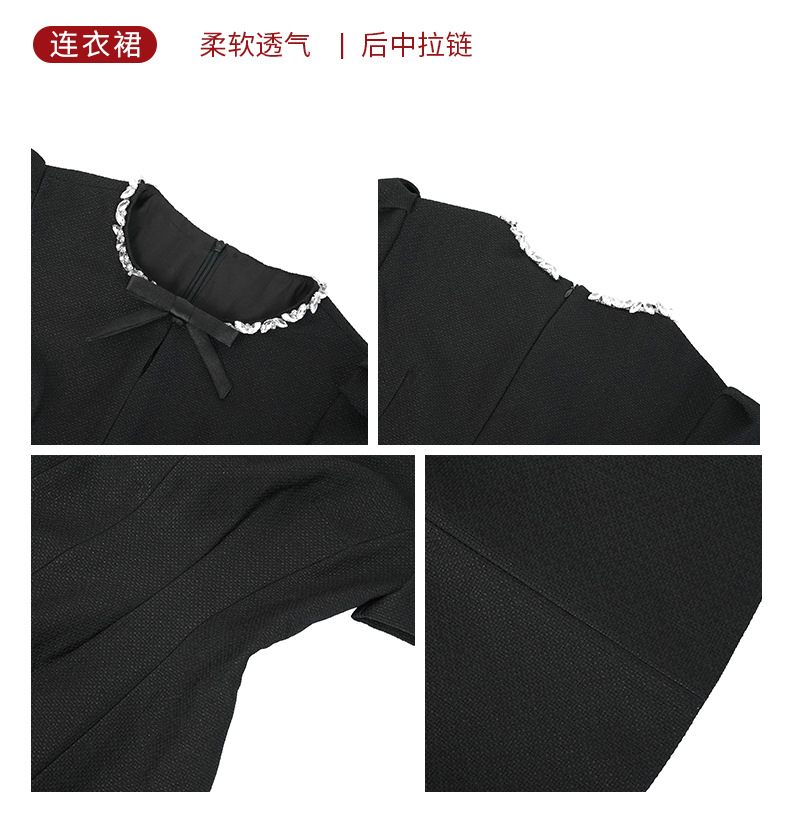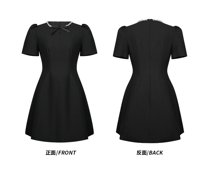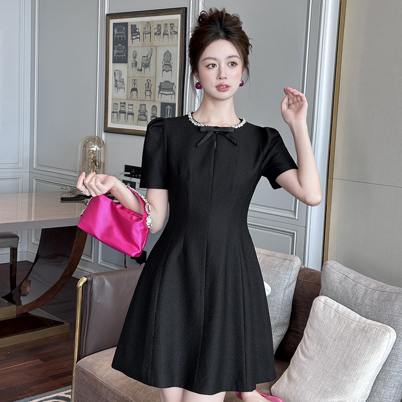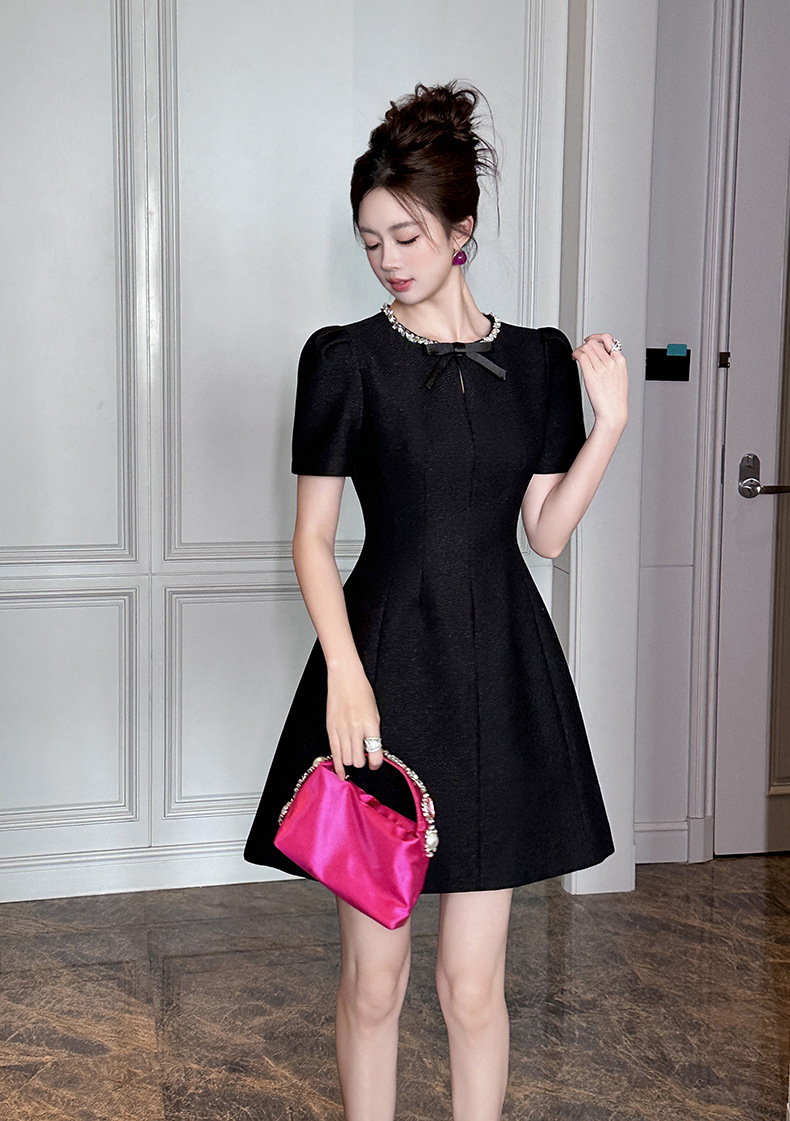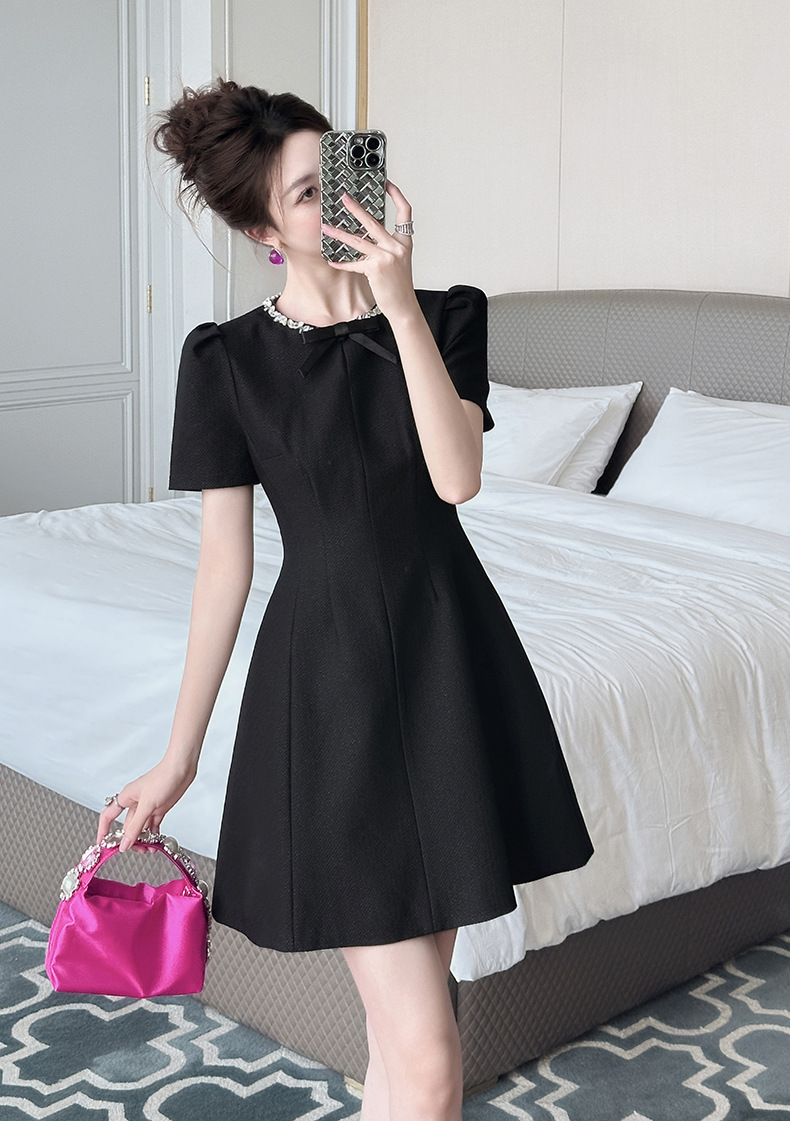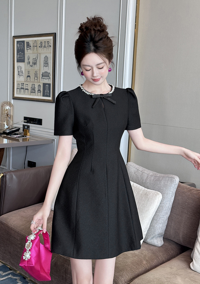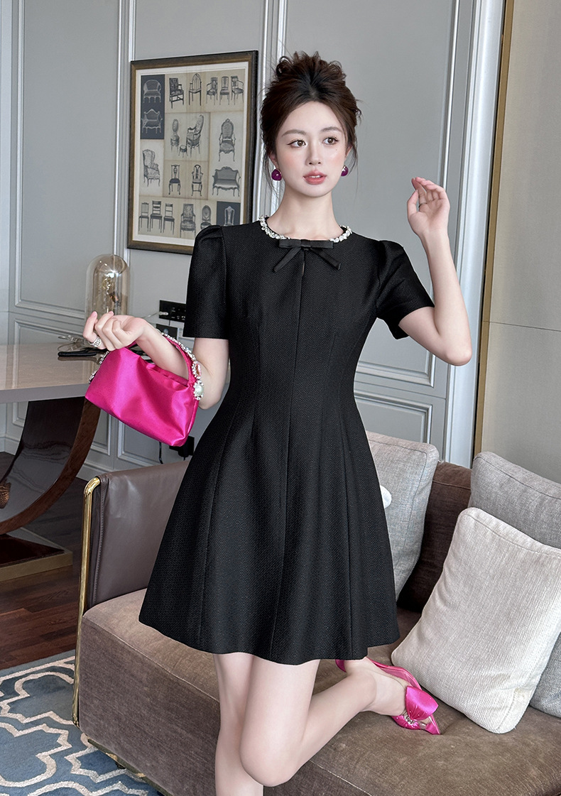 Home > 2025年7月12日---女装新款 > C-4022# 法式赫本风黑色蝴蝶结连衣裙女夏季2025掐腰漂亮a字短裙子9008