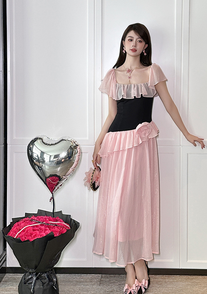 C-4221# 2025夏季新款女装法式方领荷叶边设计感收腰大摆礼服连衣裙51385