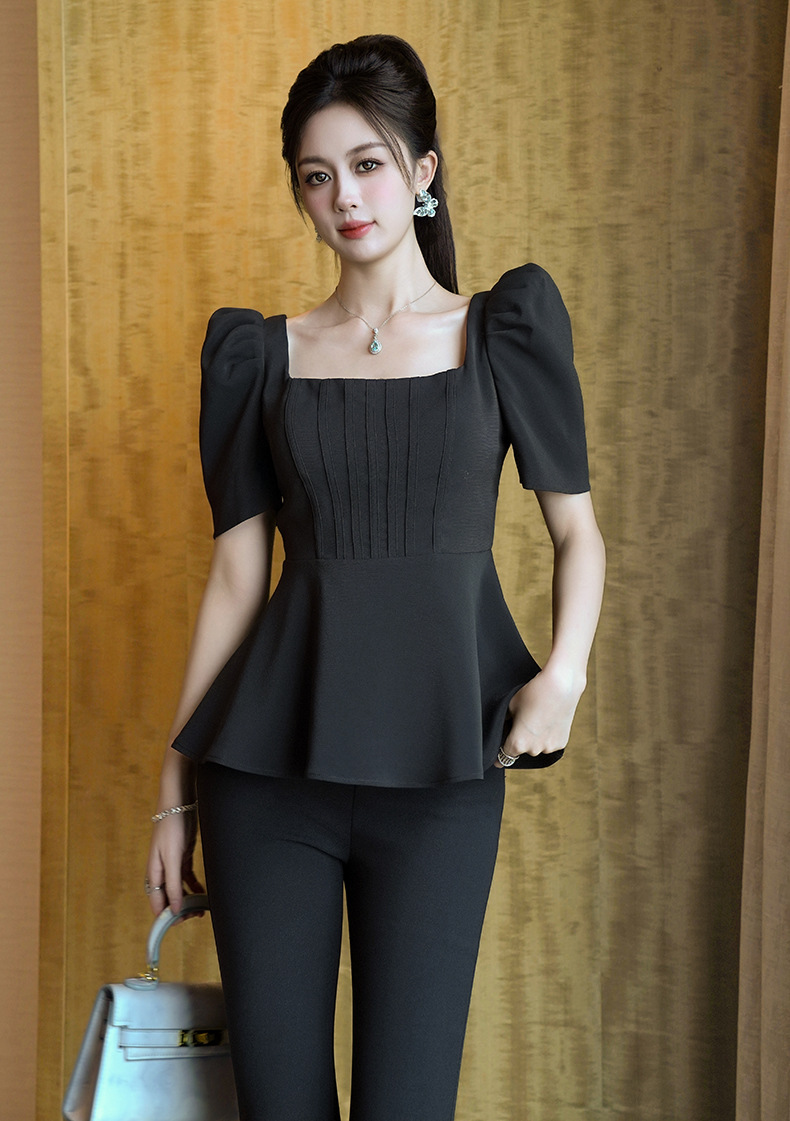 C-4238# 2025夏季新款女装法式方领泡泡袖上衣设计感修身不规则T恤女31262