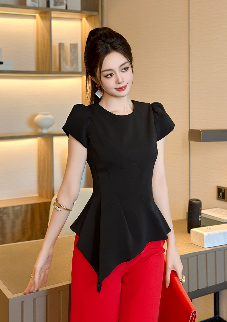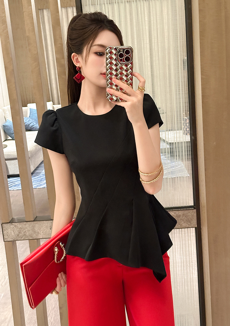 C-4239# 2025年夏季新款百搭气质显瘦圆领压褶减龄设计感小个子上衣45209