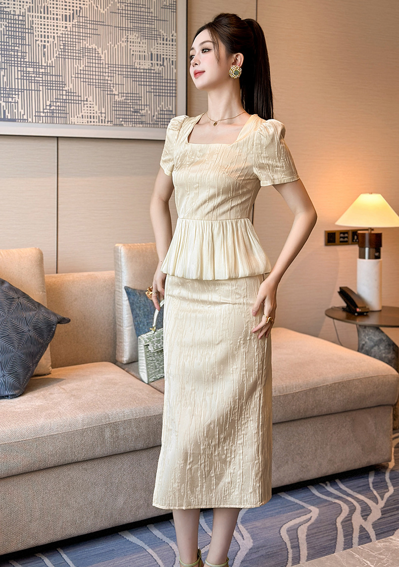 C-4240# 2025夏季新款女装法式方领收腰遮肚假两件包臀开叉连衣裙31231