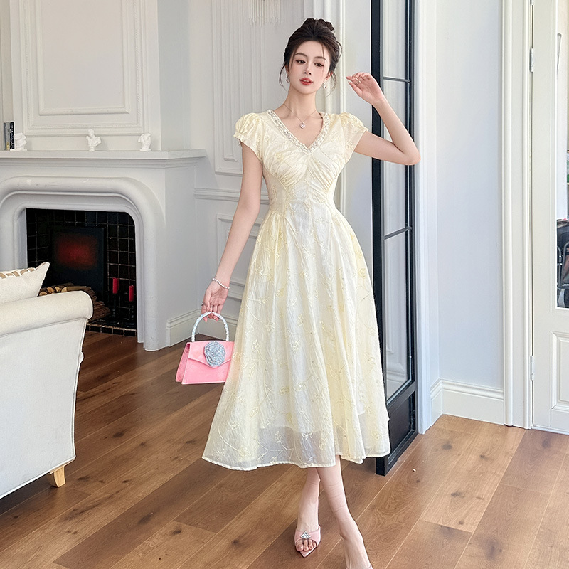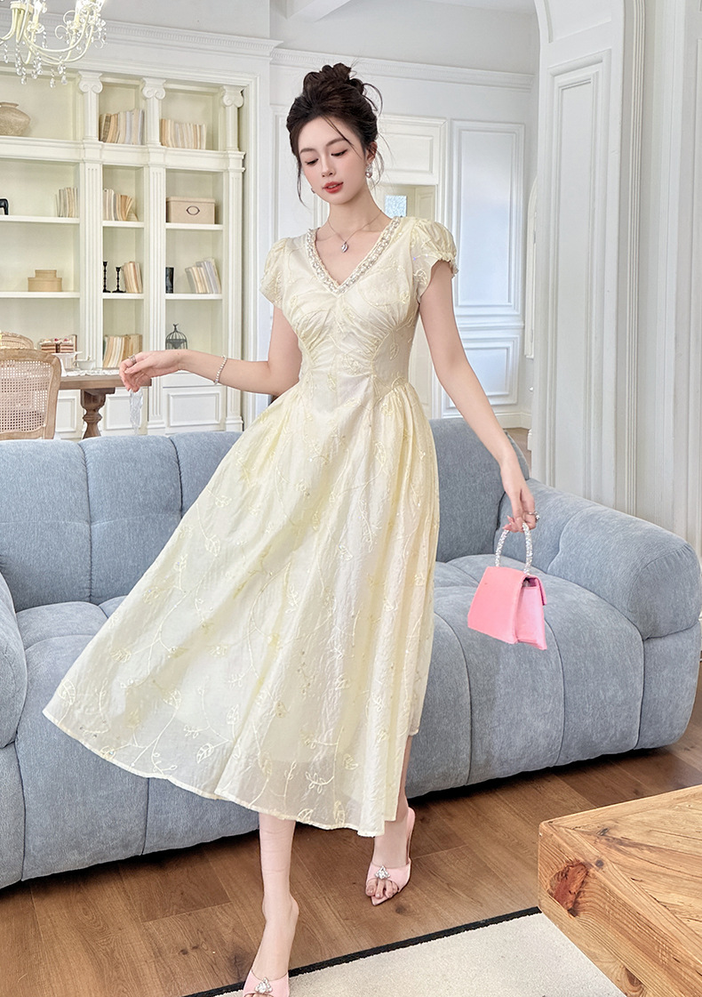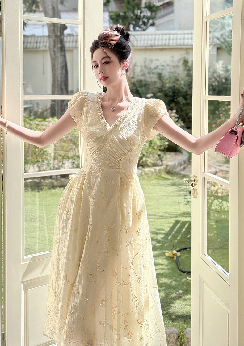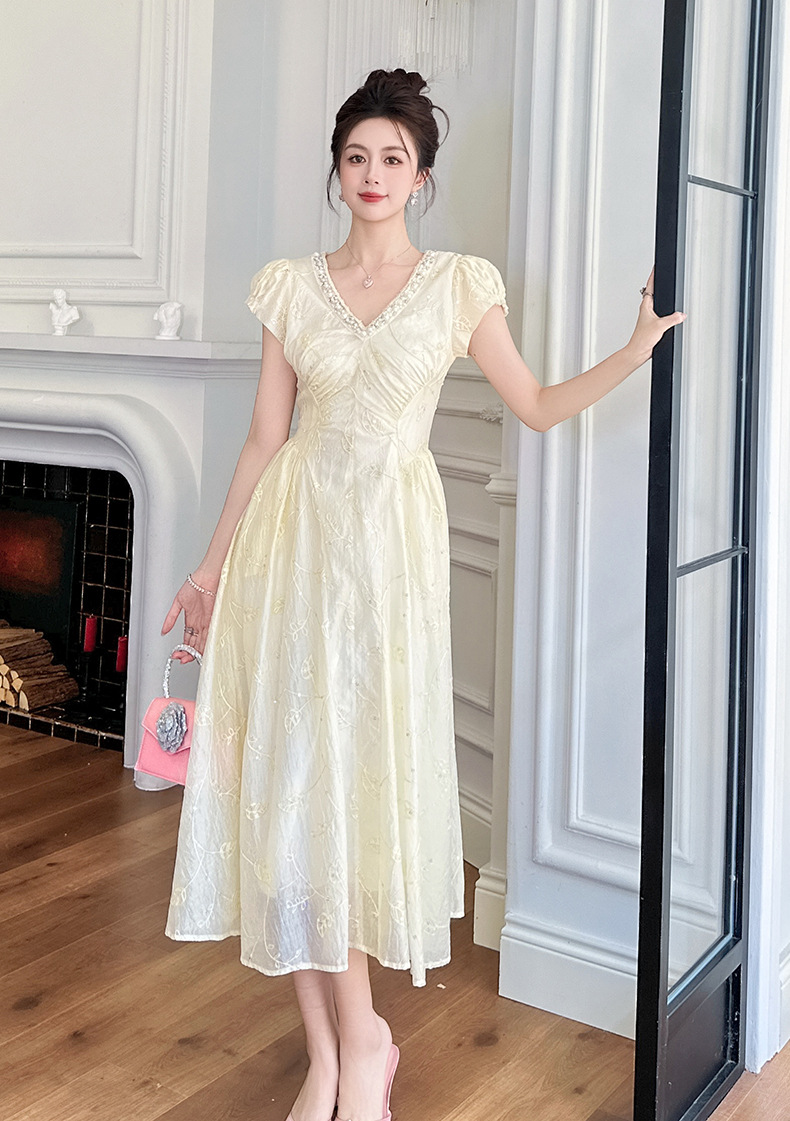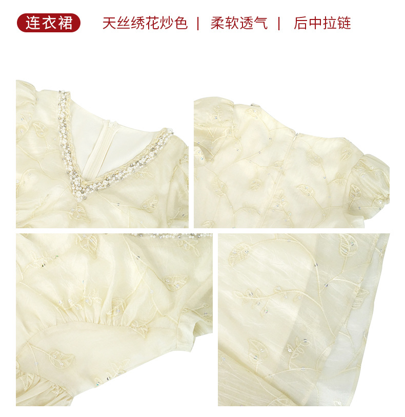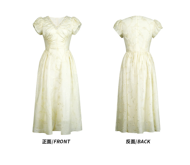 C-4263# 2025夏季新款女装重工镶钻V领收腰大摆杏色连衣裙茶歇长裙45208