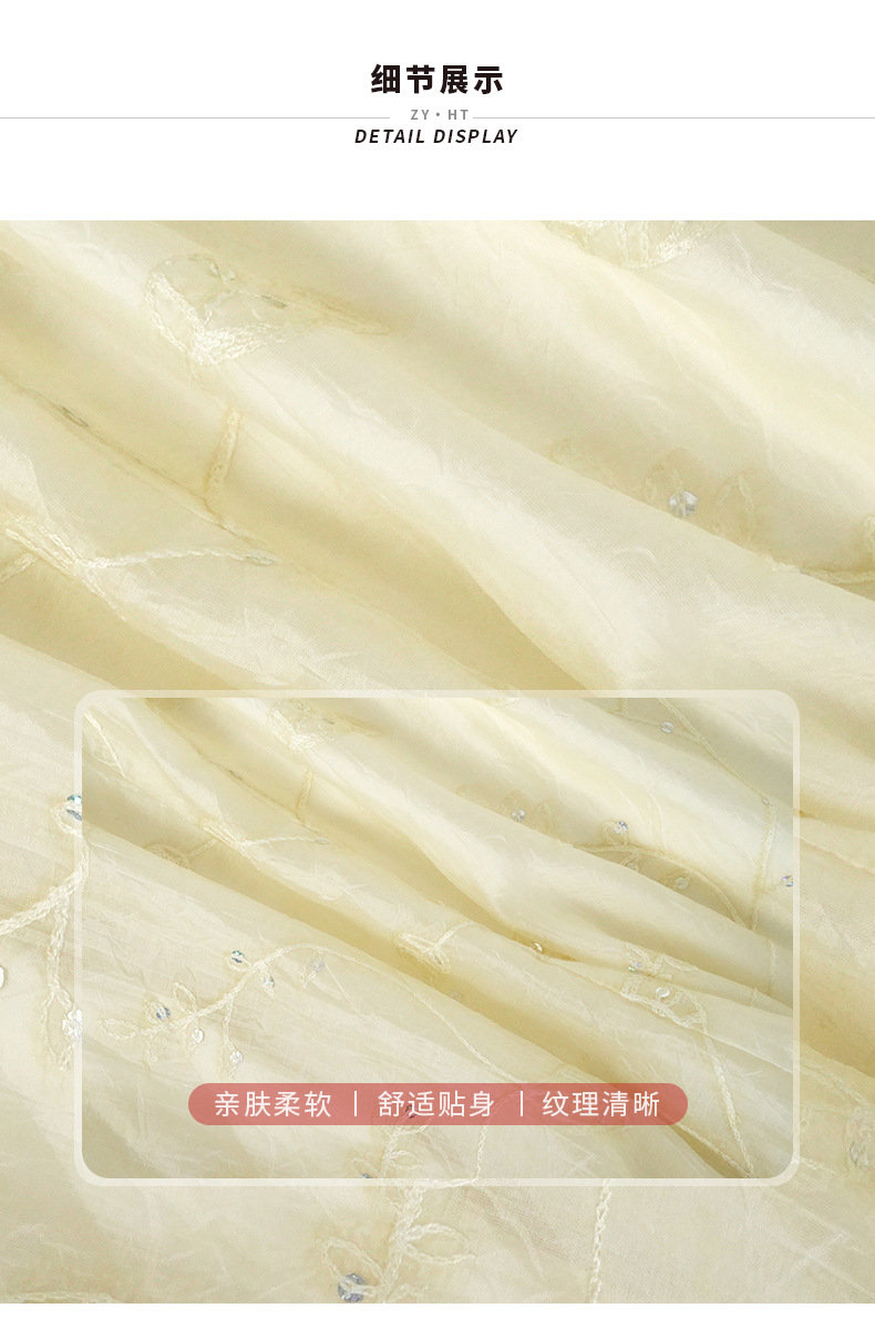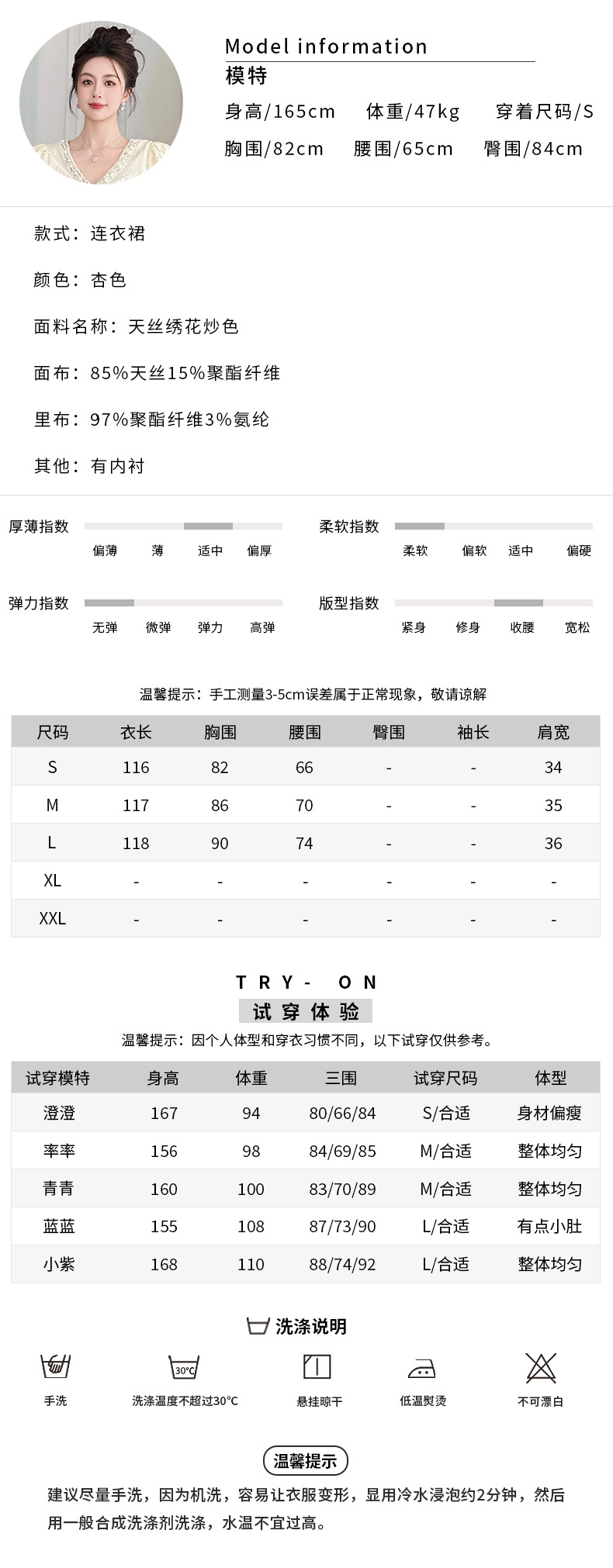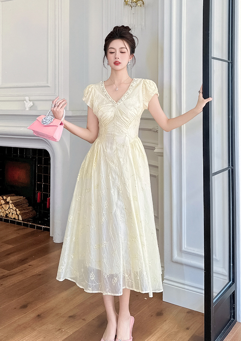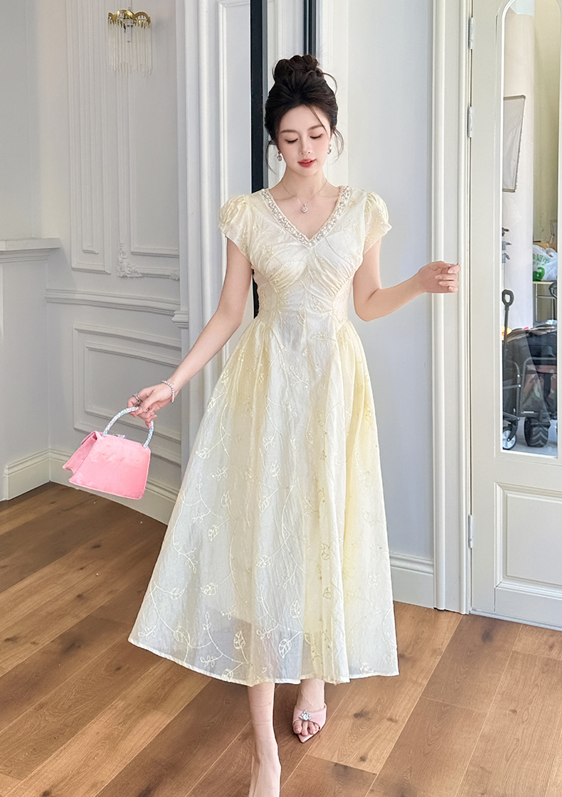 C-4263# 2025夏季新款女装重工镶钻V领收腰大摆杏色连衣裙茶歇长裙45208