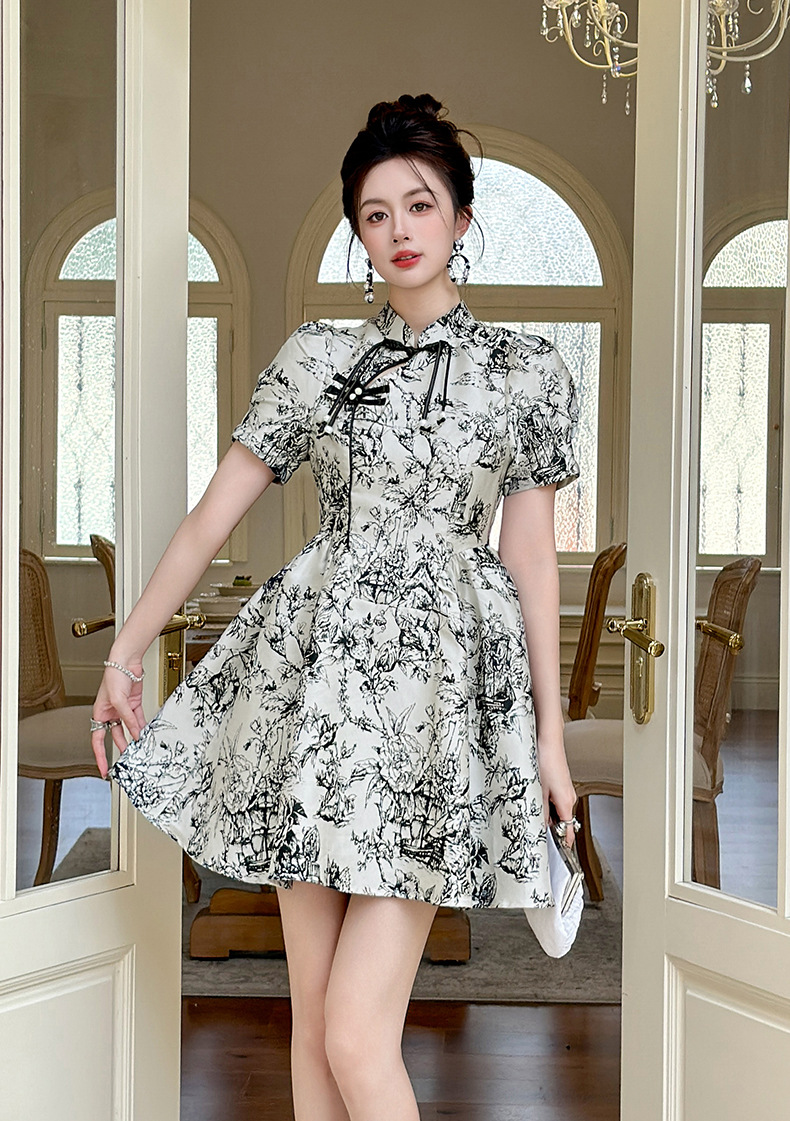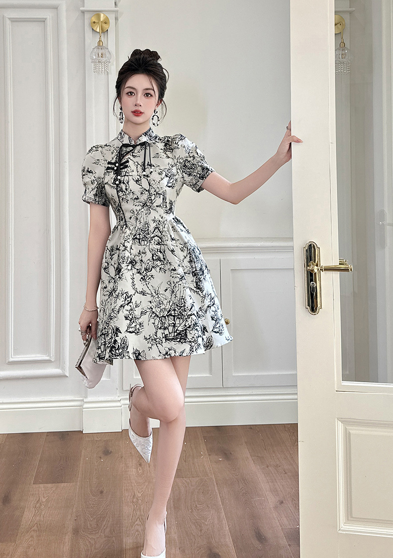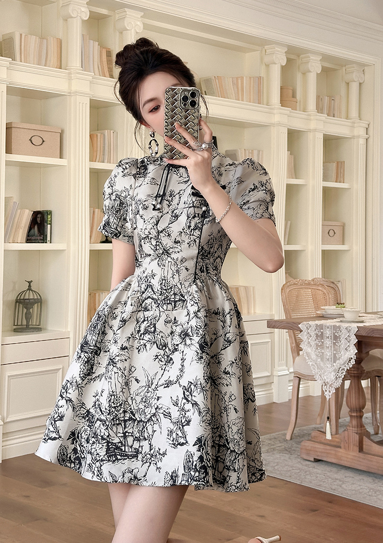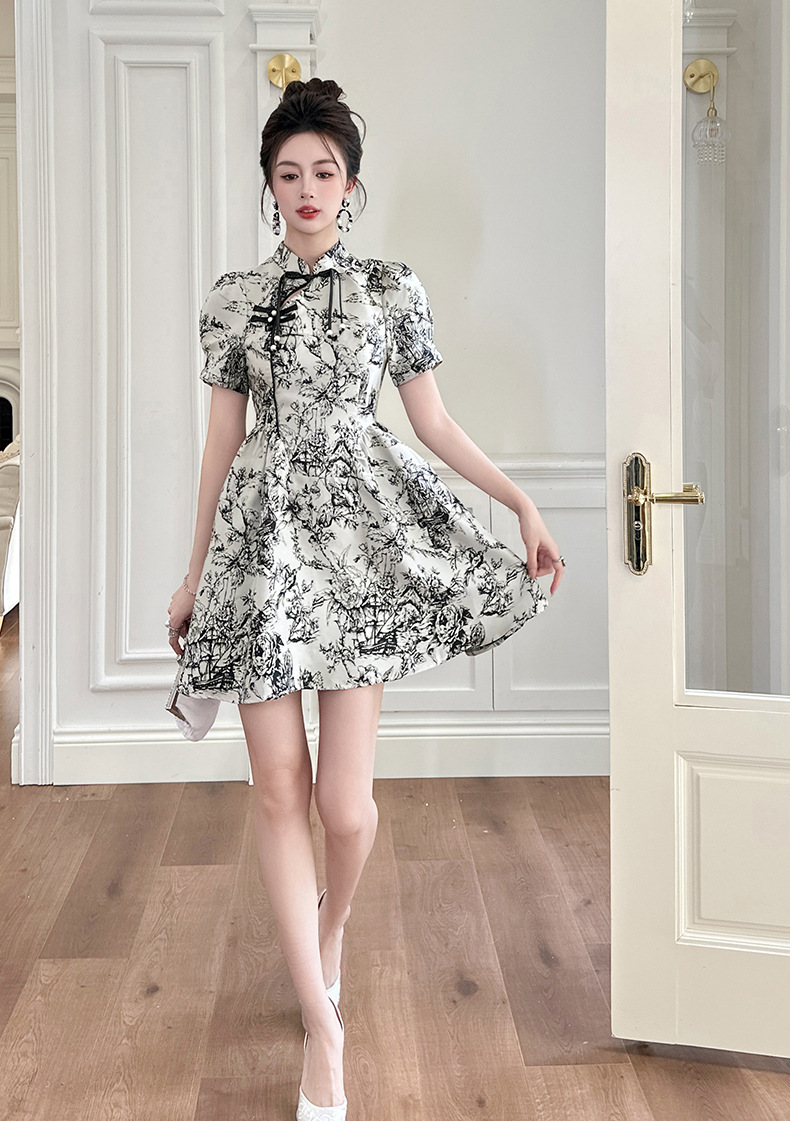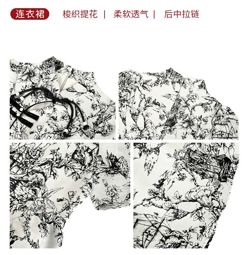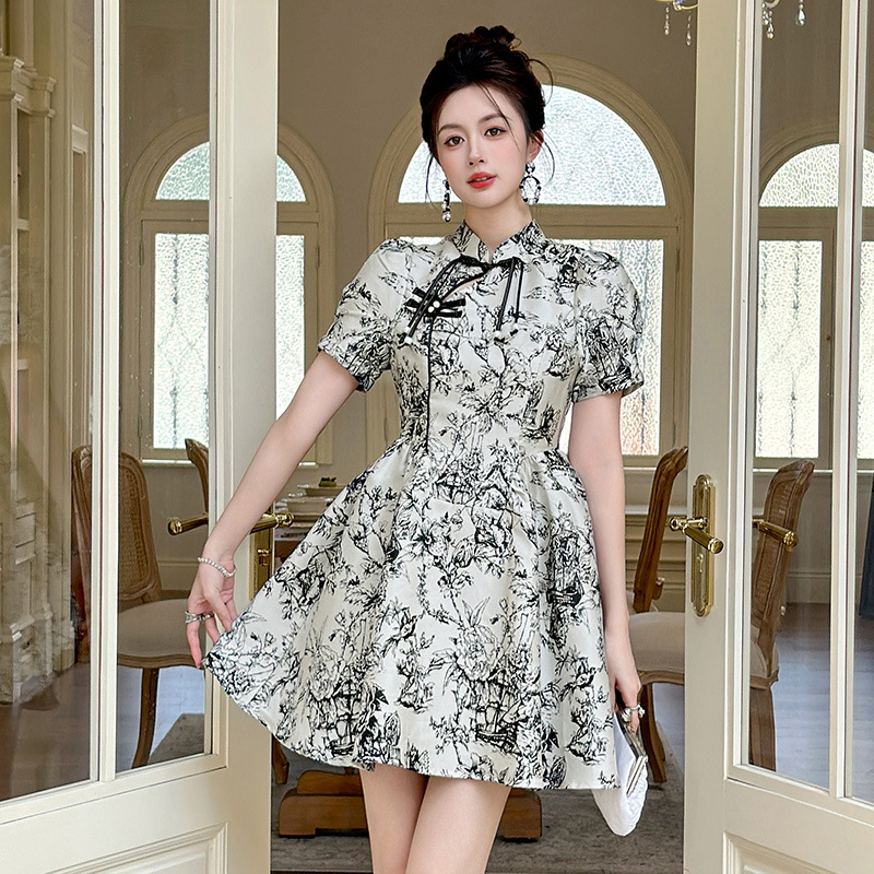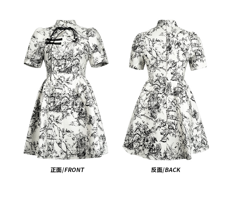C-4265# 2025夏季新款女装中国风新中式旗袍水墨画收腰显瘦a字连衣裙61878