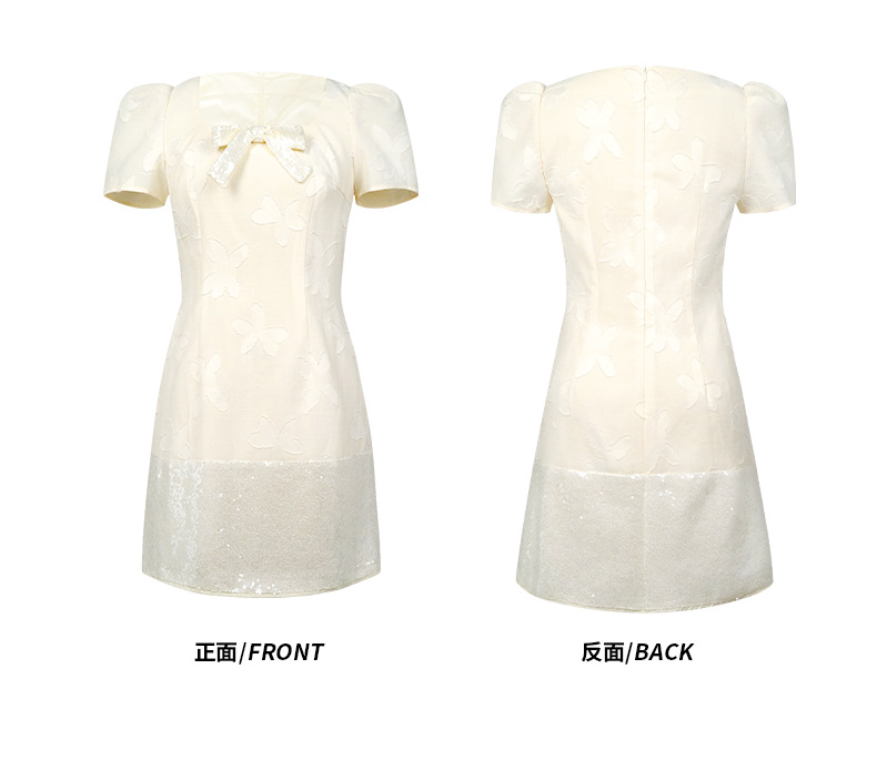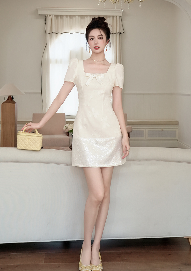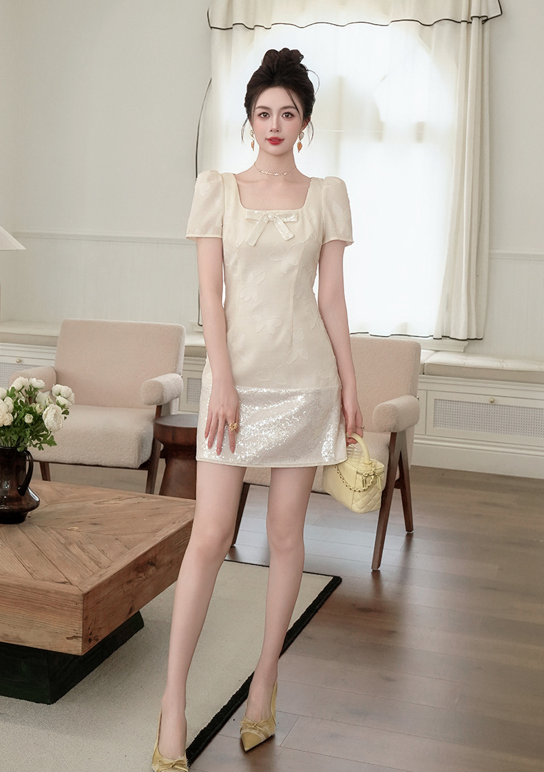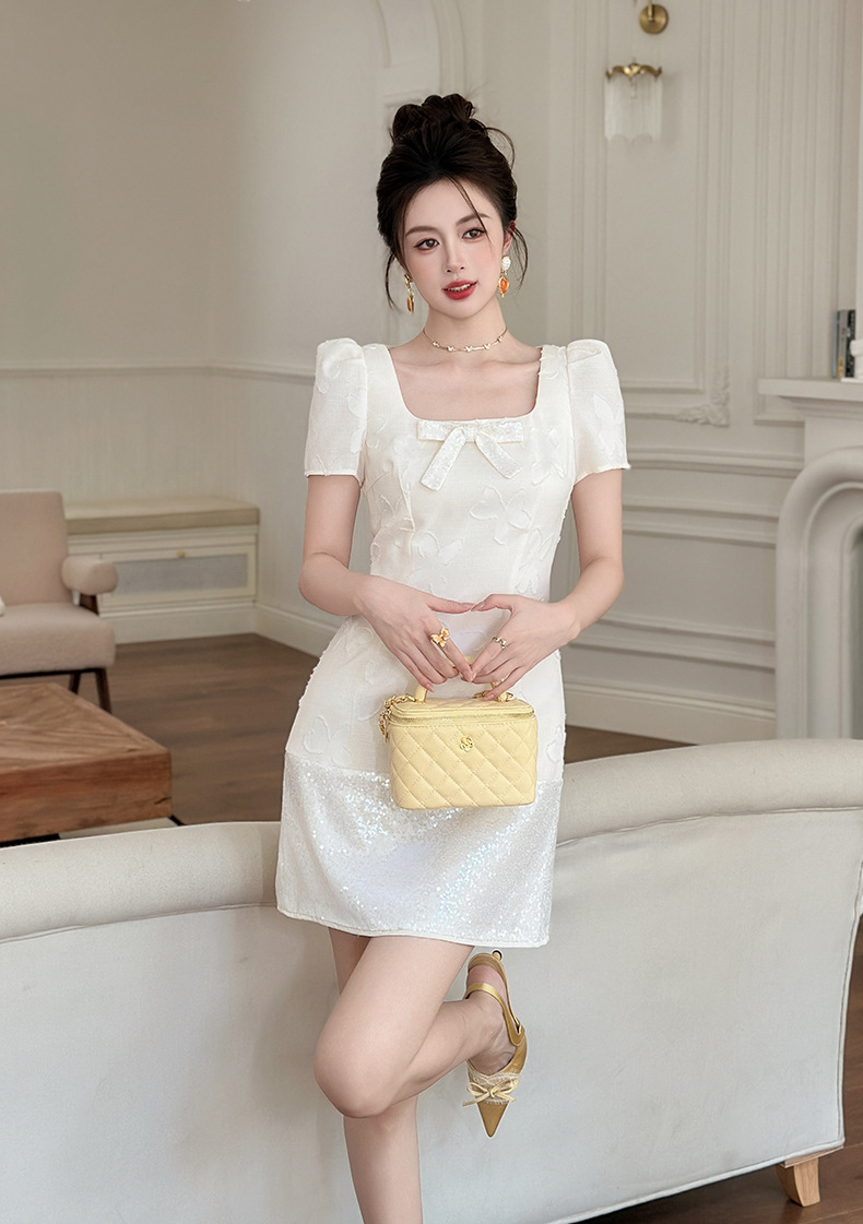 C-4271# 2025夏季新款女装法式方领蝴蝶结减龄修身包臀小个子连衣裙11568