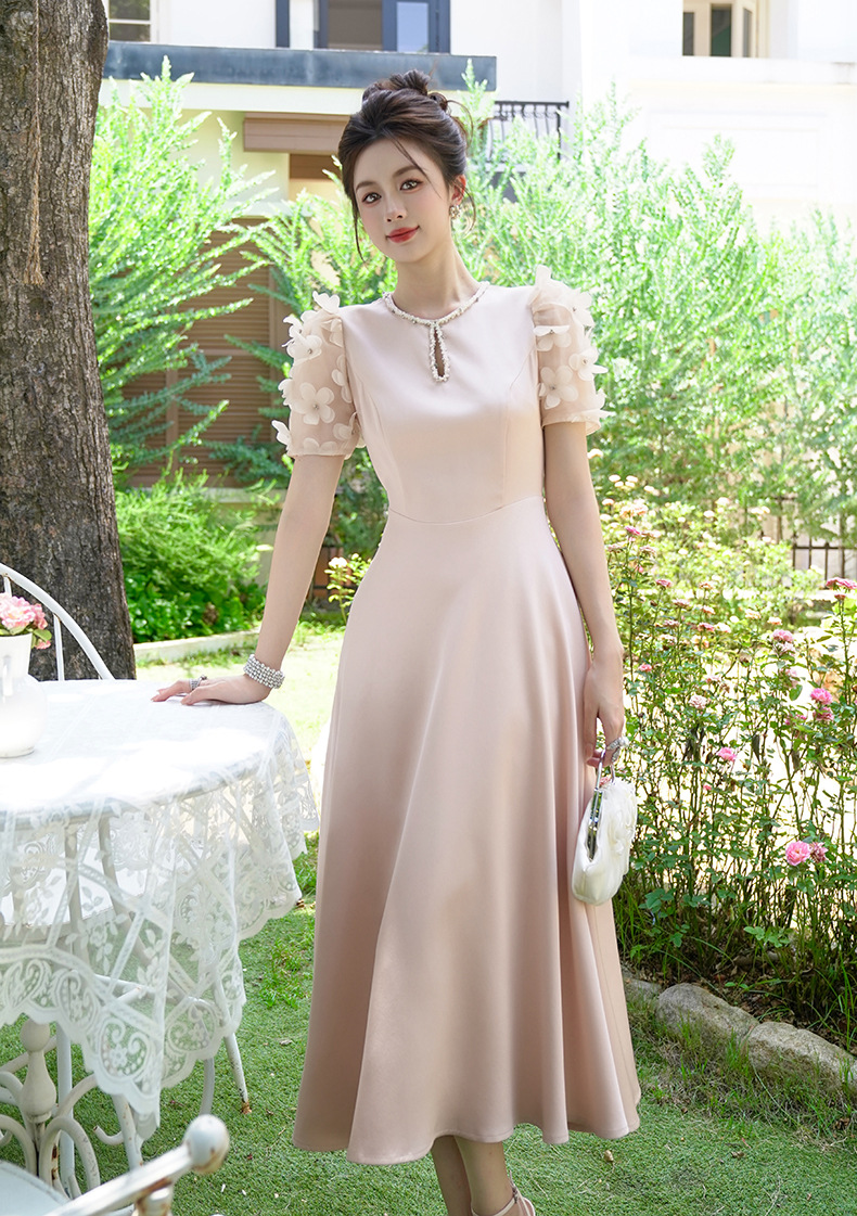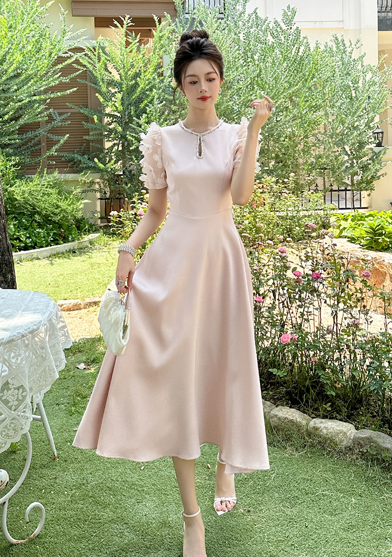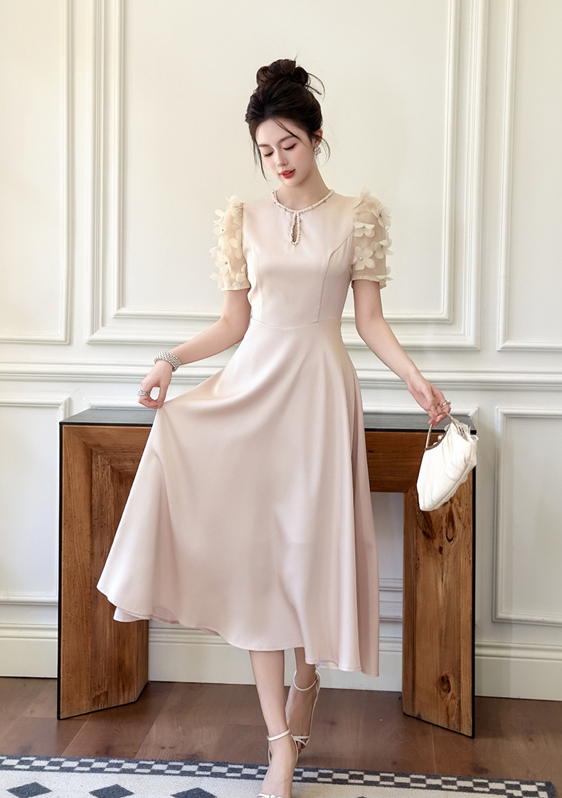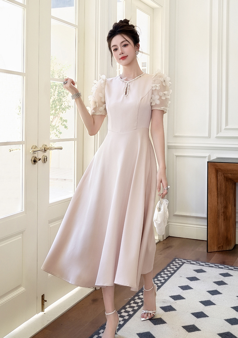 C-4278# 2025夏季新款法式圆领镂空花瓣袖修身收腰蓬蓬大摆连衣裙女51351