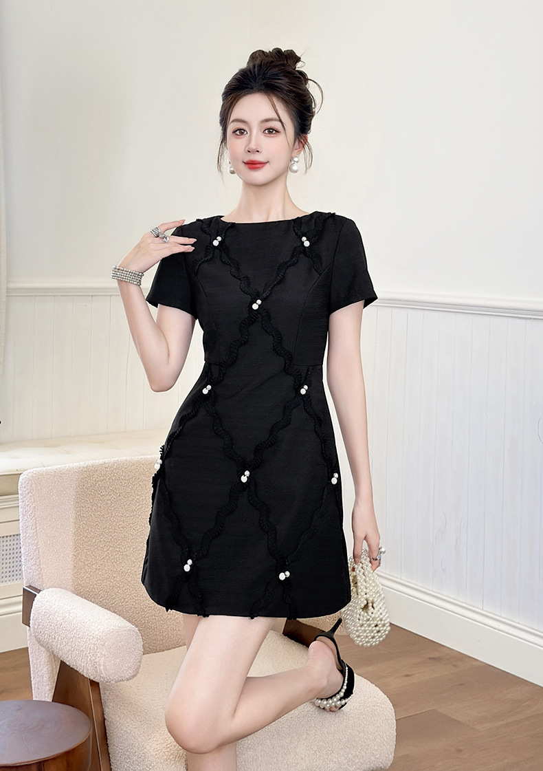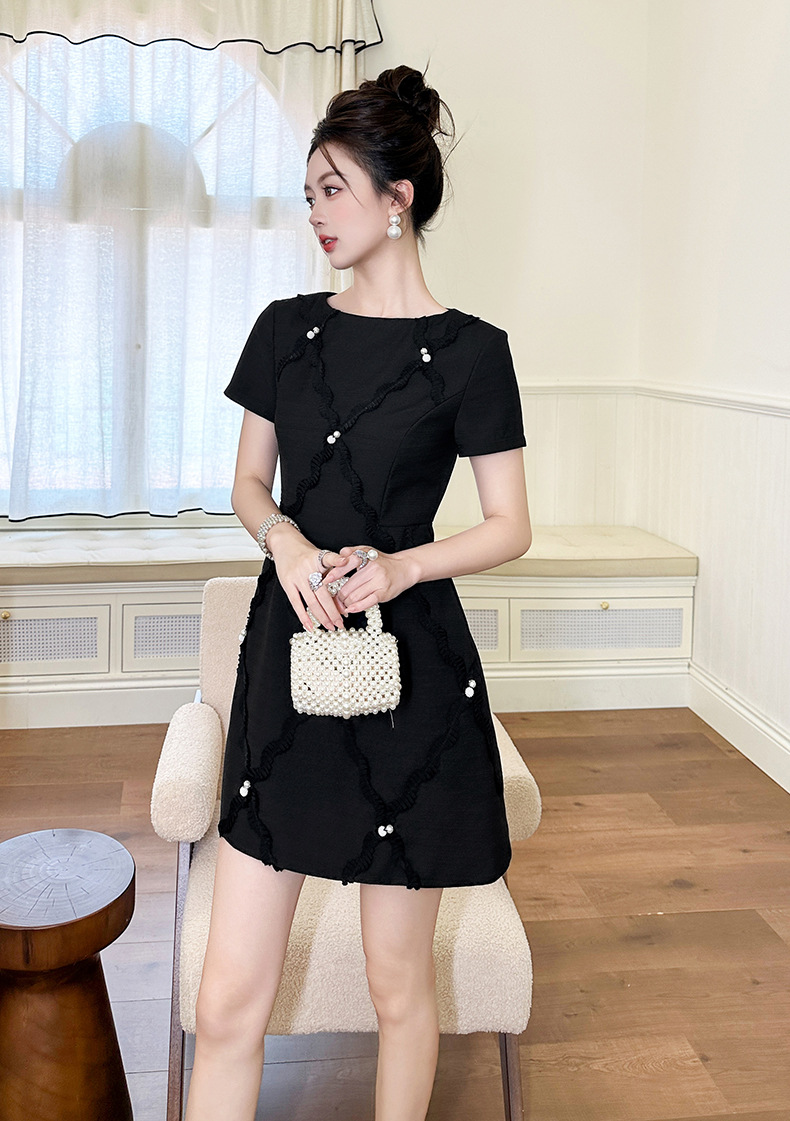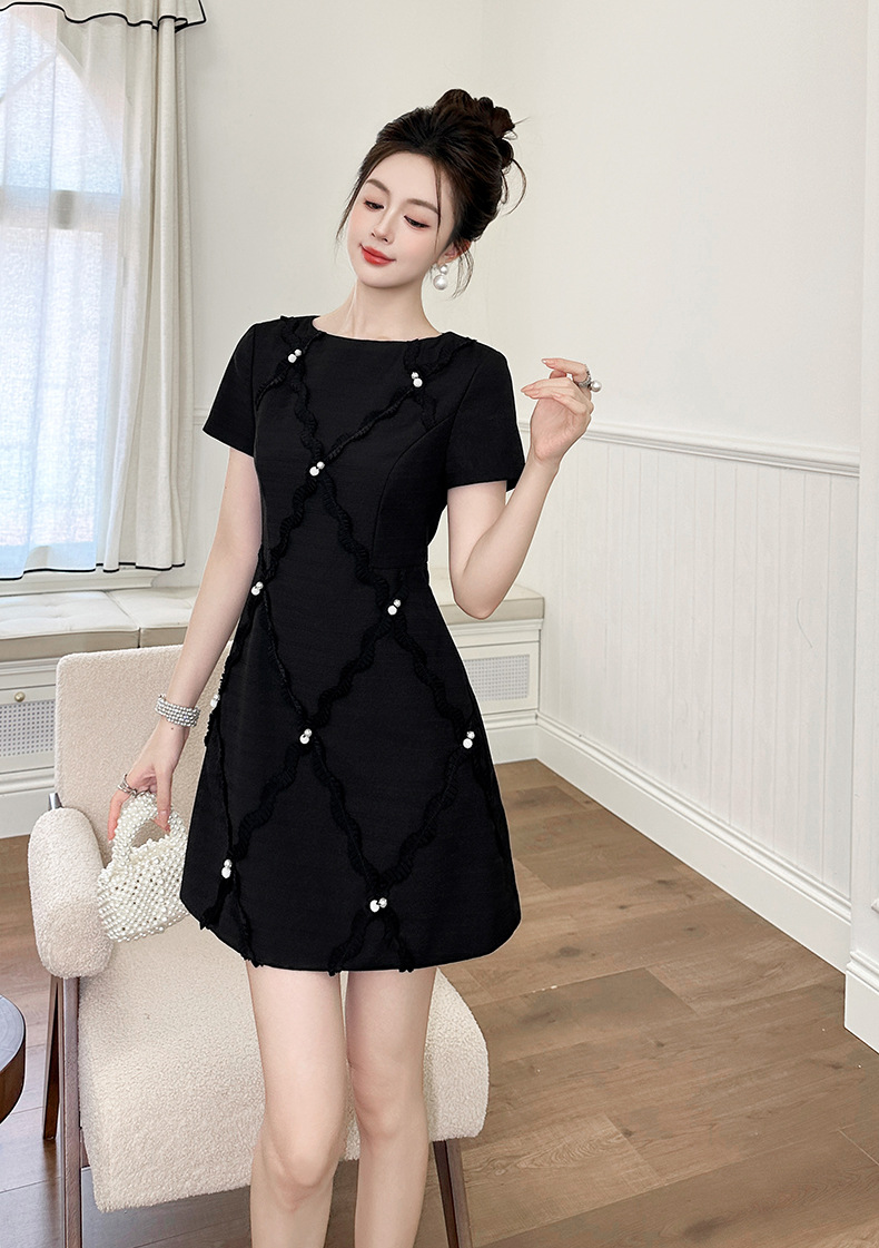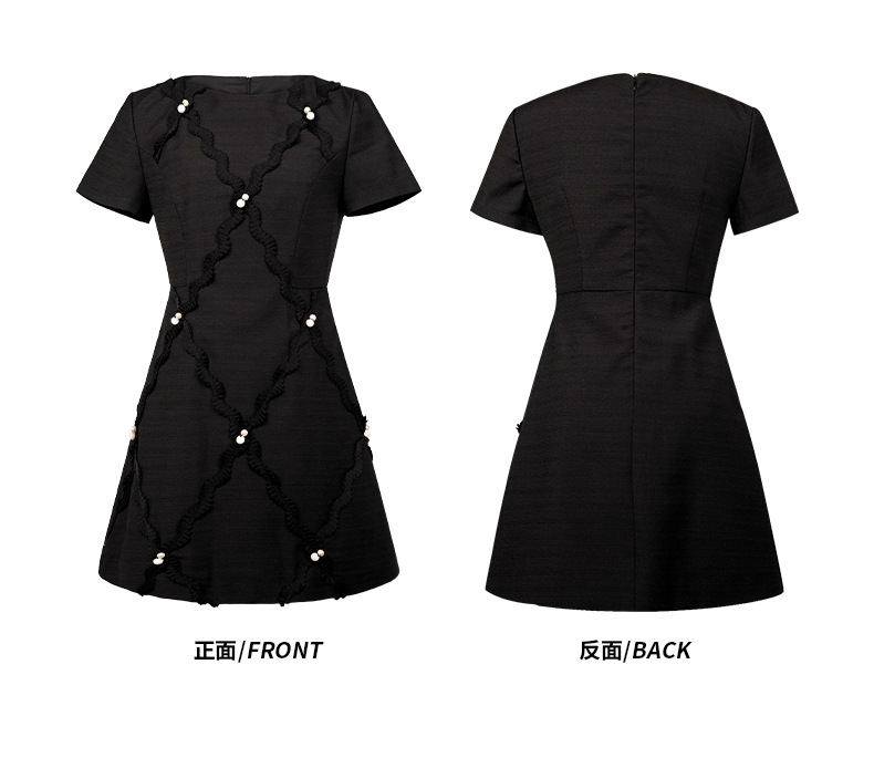 C-4279# 2025夏季新款女装小香风气质圆领设计感菱格钉珠A字连衣裙21726