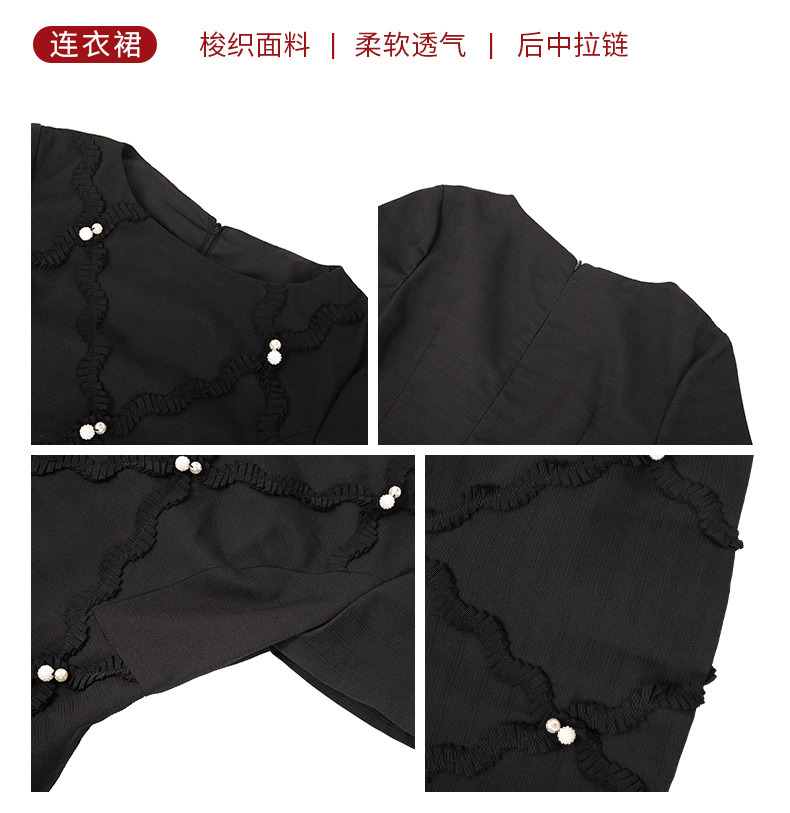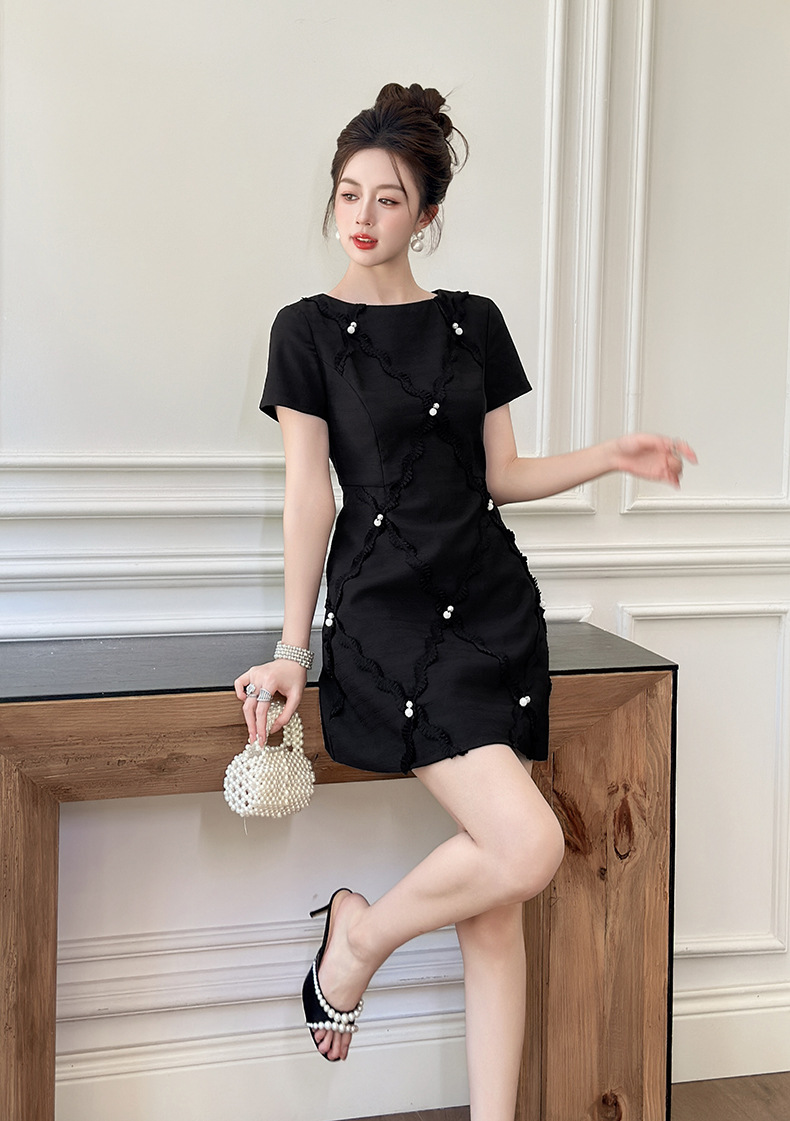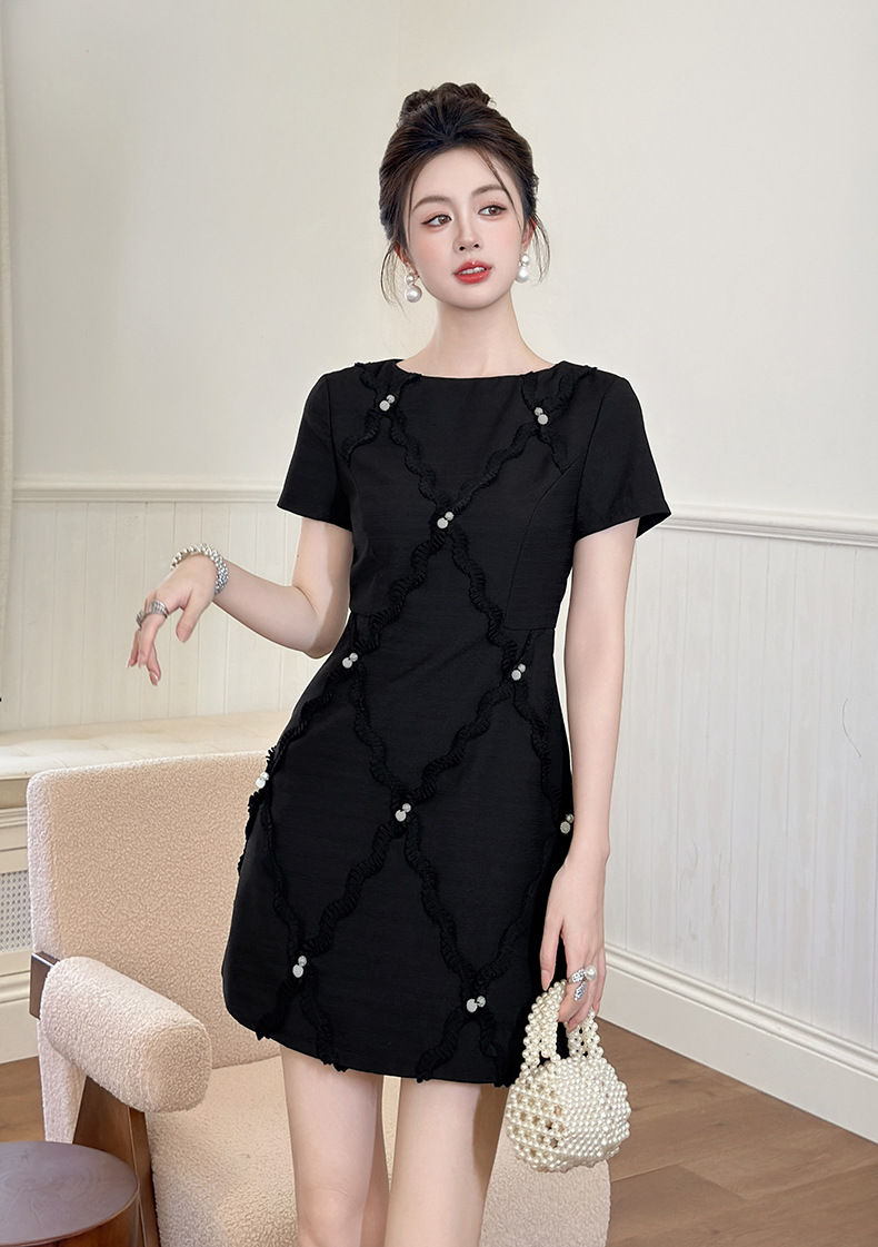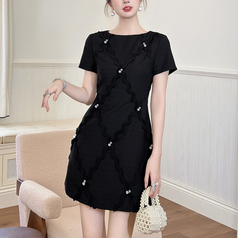 C-4279# 2025夏季新款女装小香风气质圆领设计感菱格钉珠A字连衣裙21726