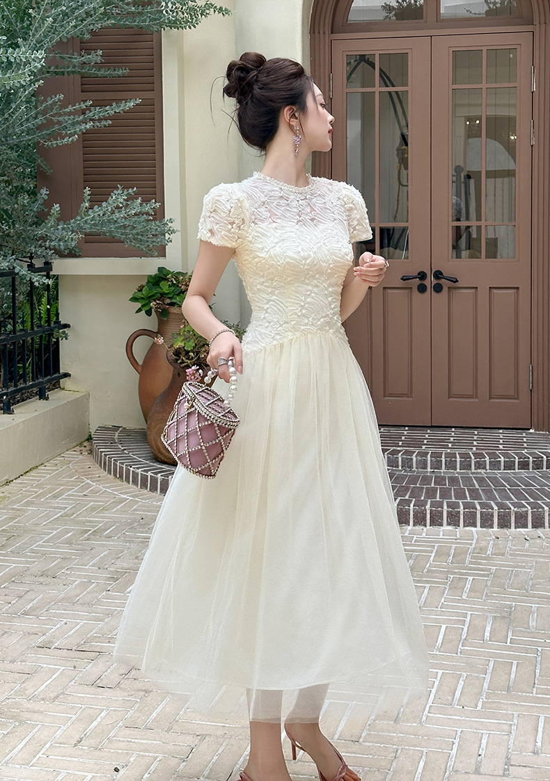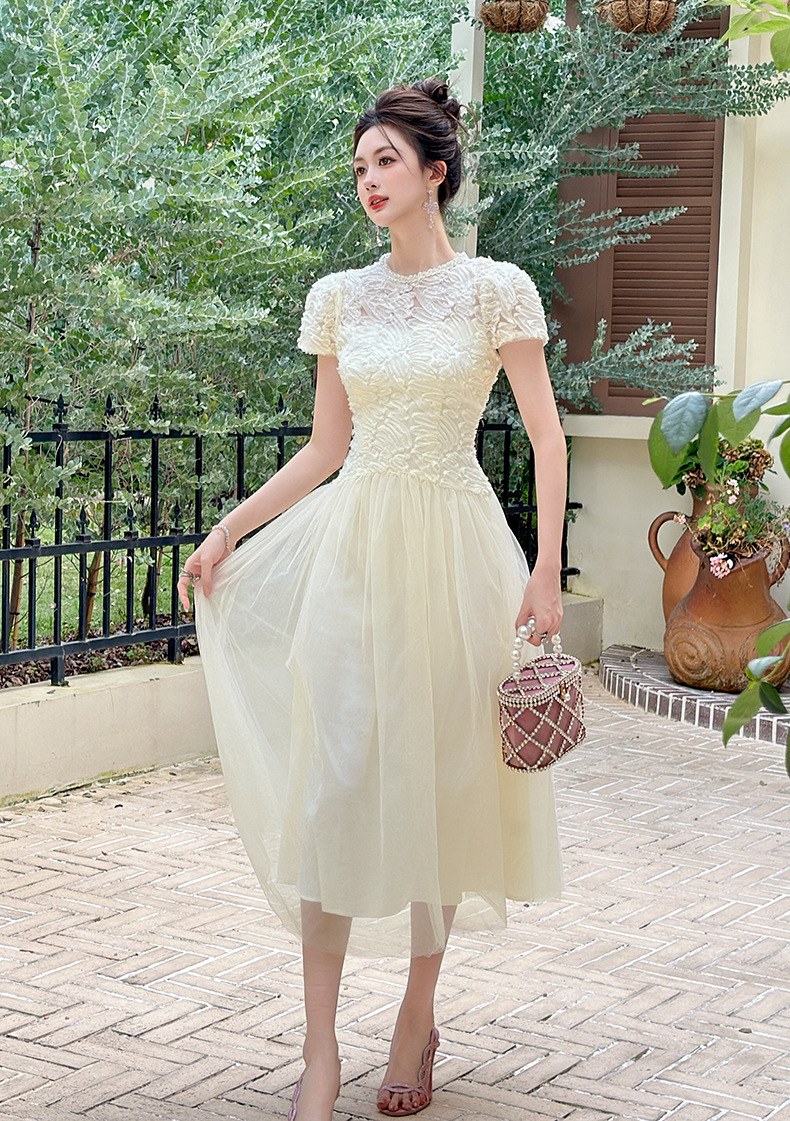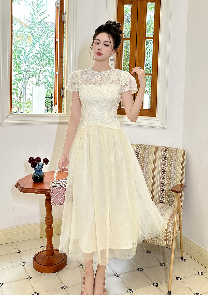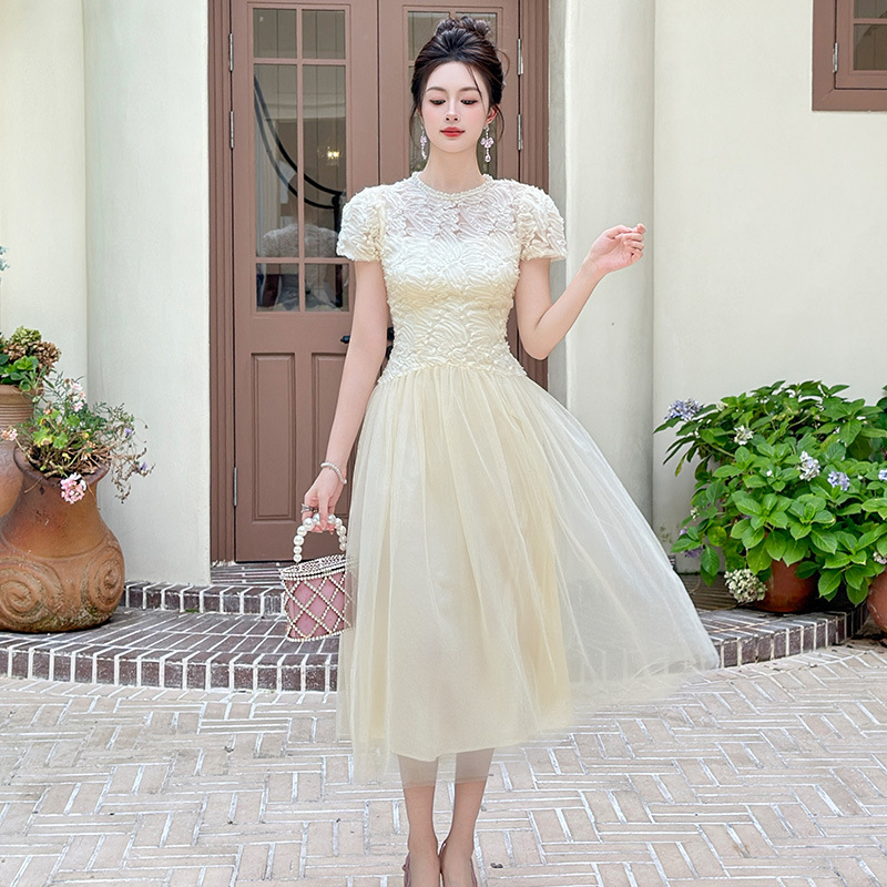 C-4282# 2025夏季新款女装法式重工蕾丝拼接收腰网纱仙女长款连衣裙15416