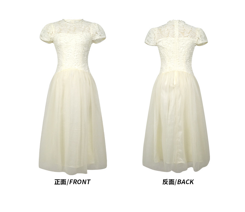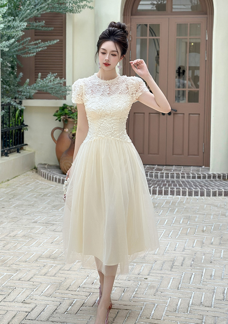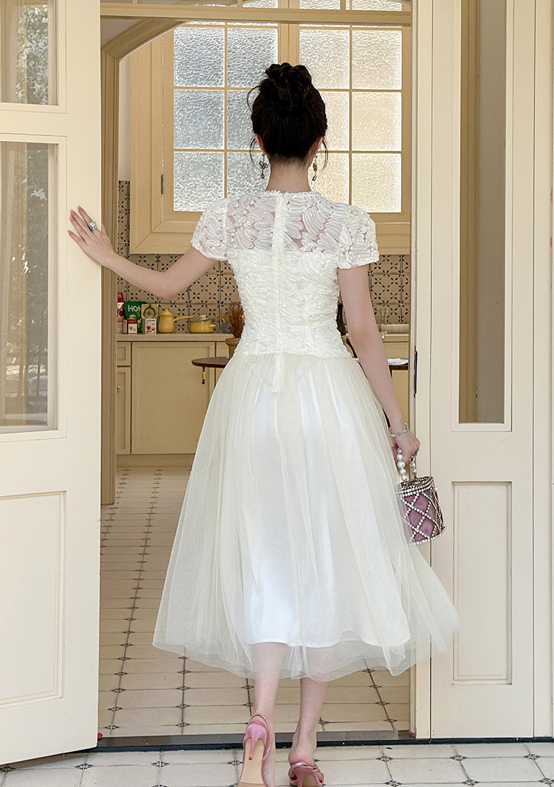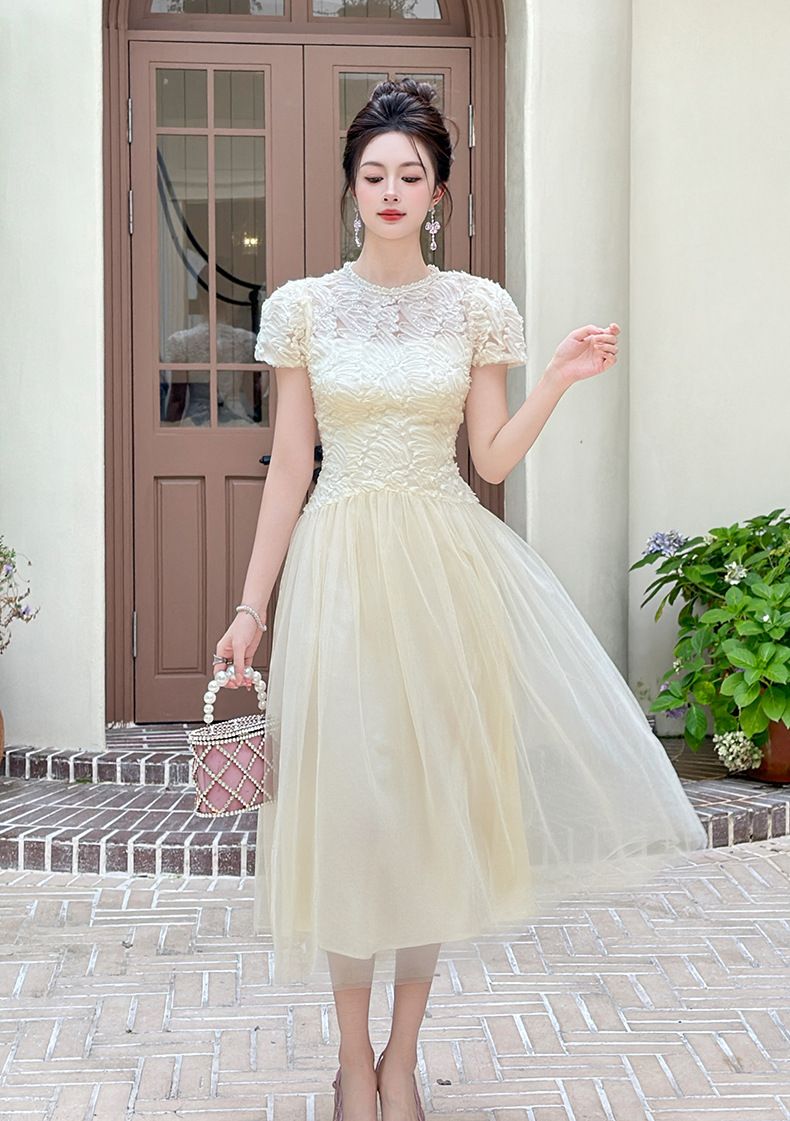C-4282# 2025夏季新款女装法式重工蕾丝拼接收腰网纱仙女长款连衣裙15416