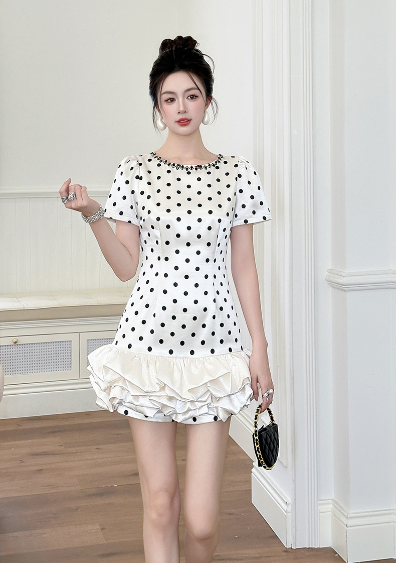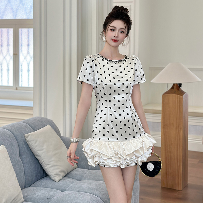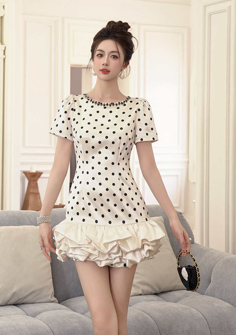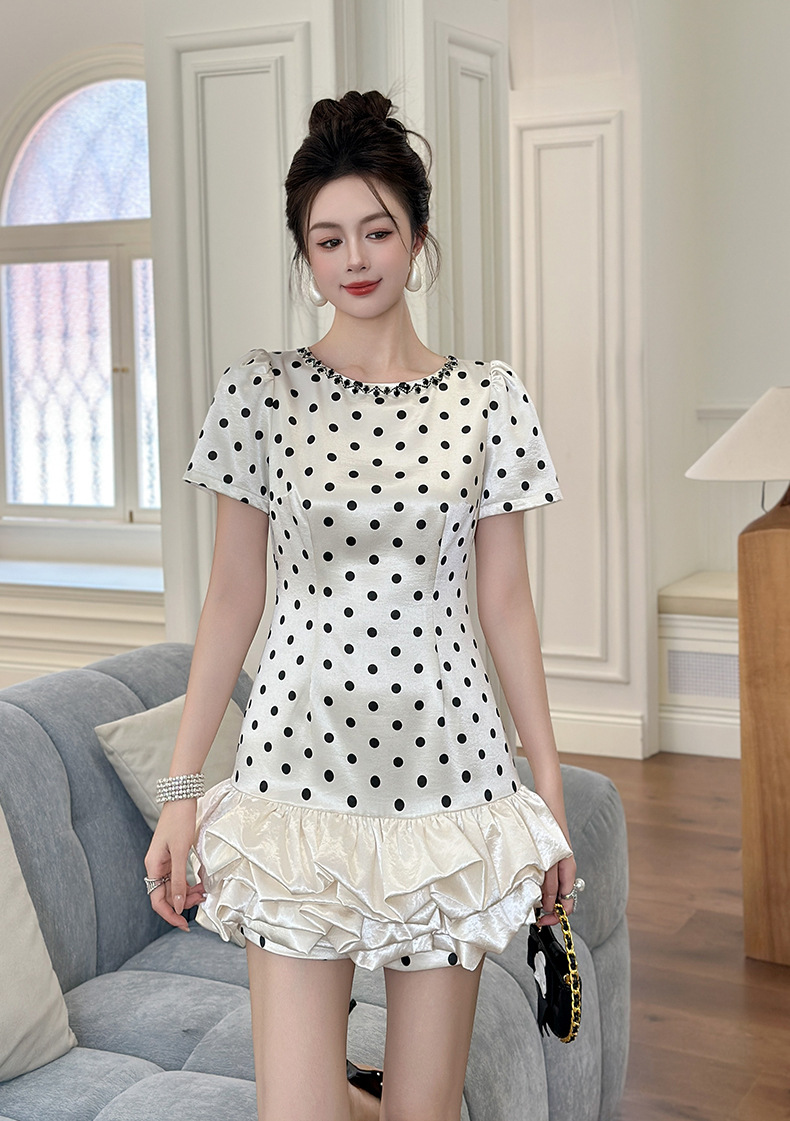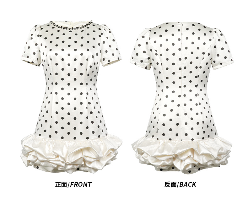 C-4290# 2025夏季新款女装复古气质镶钻圆领设计感荷叶边波点连衣裙65387