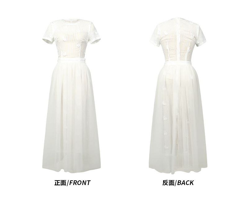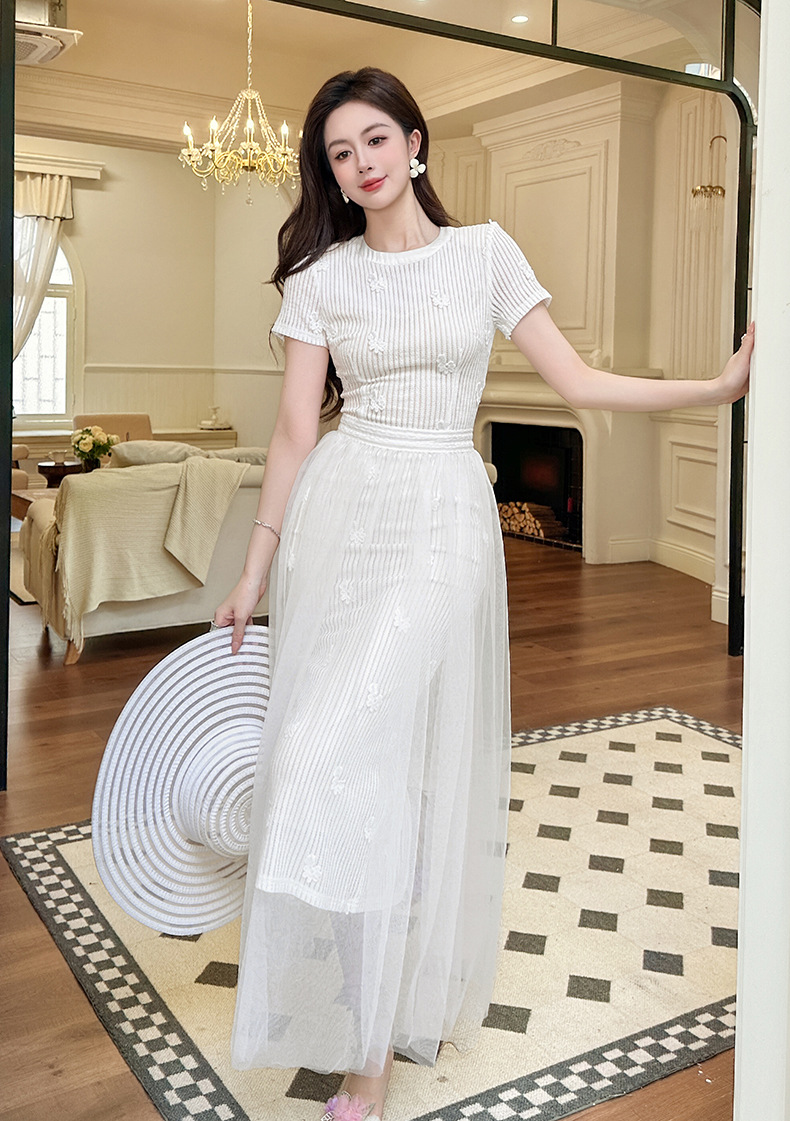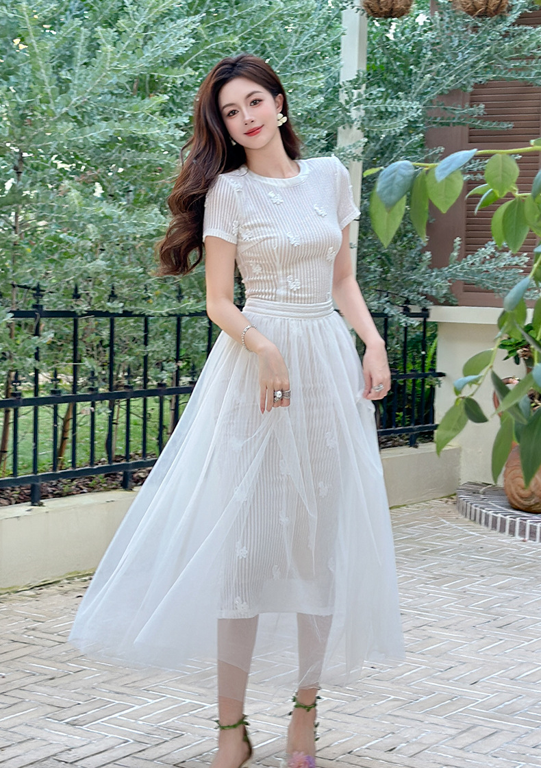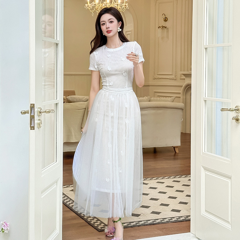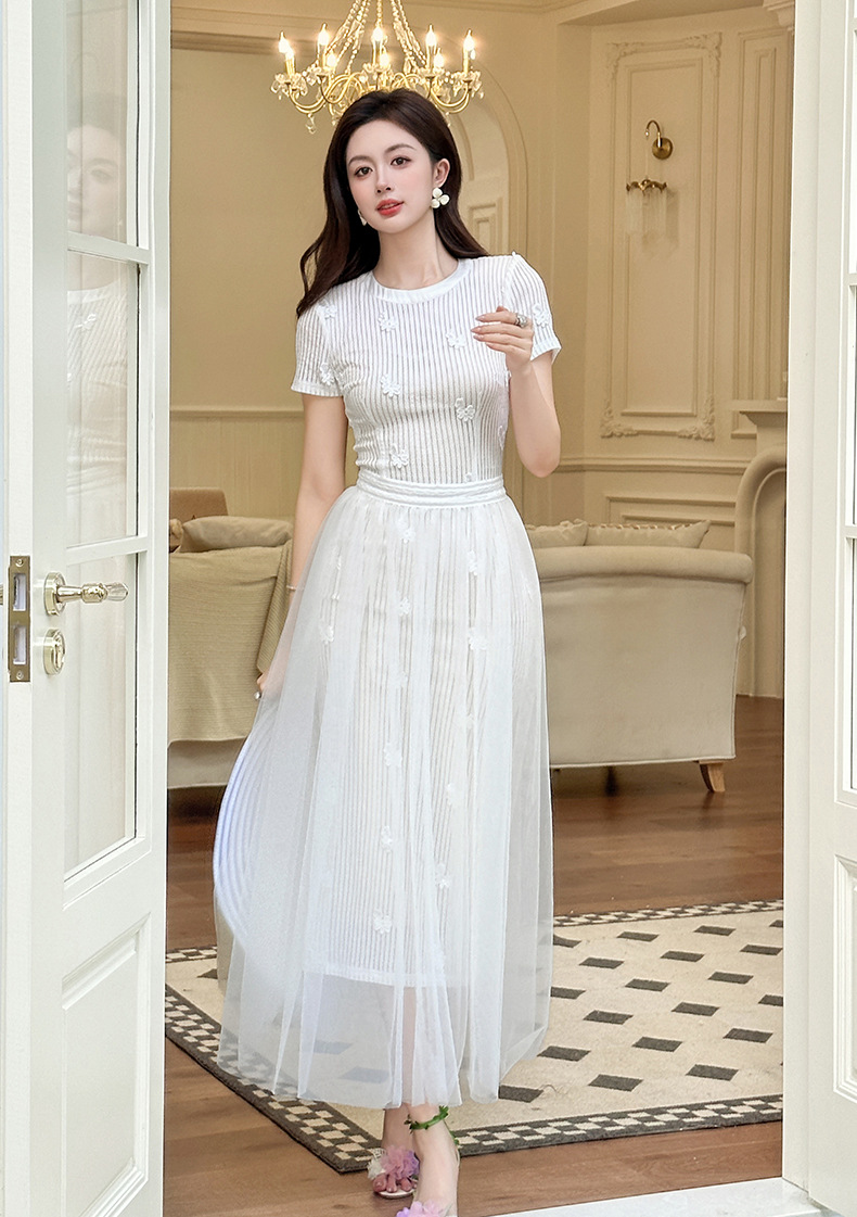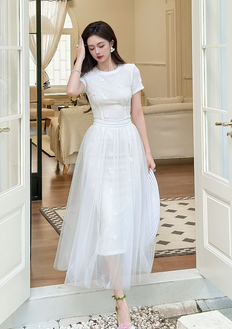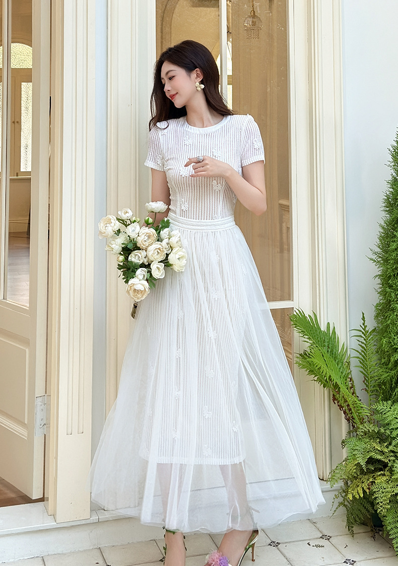 C-4291# 2025夏季新款女装法式设计感立体花朵镂空网纱白色连衣裙21754