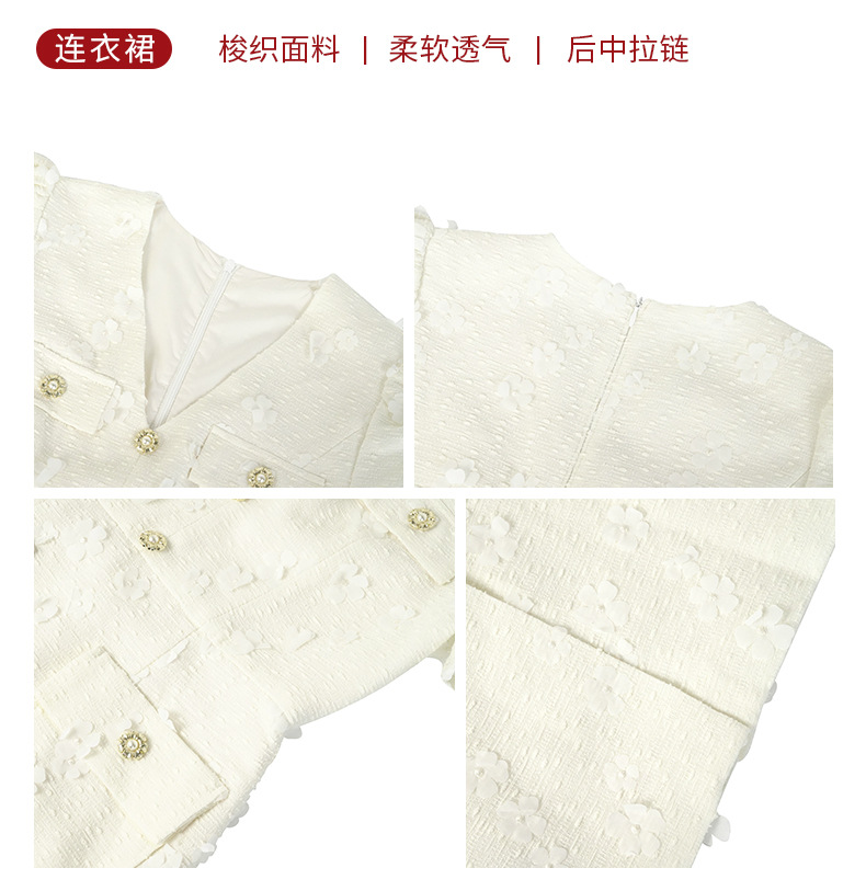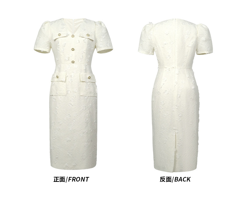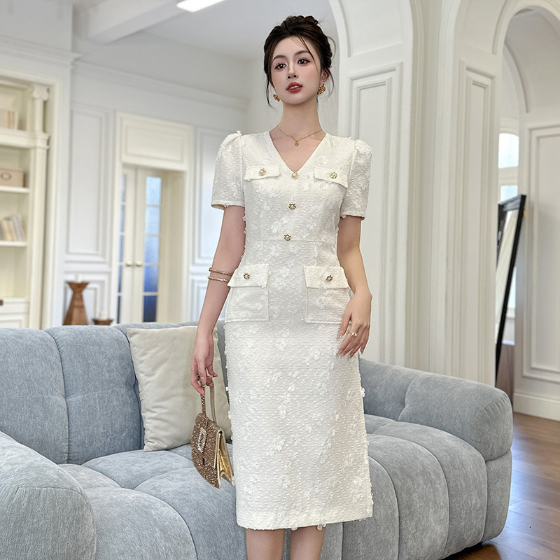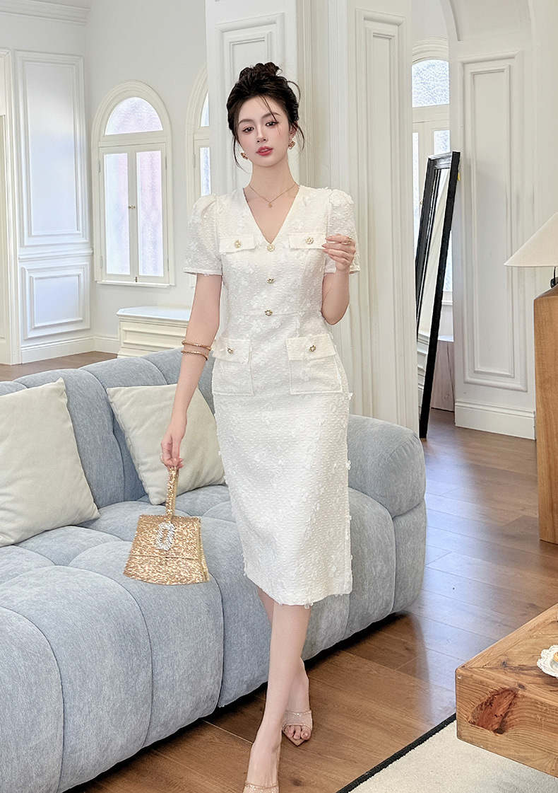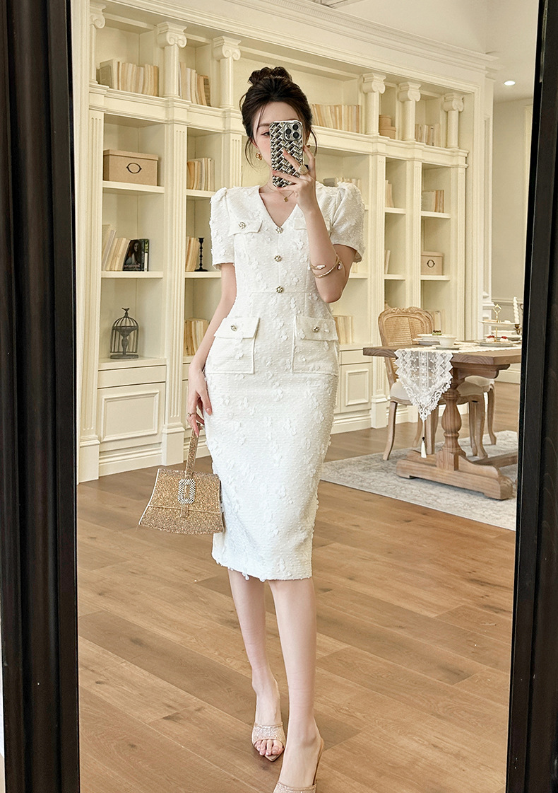 C-4295# 2025夏季新款女装小香风气质V领修身包臀正式场合白色连衣裙21784
