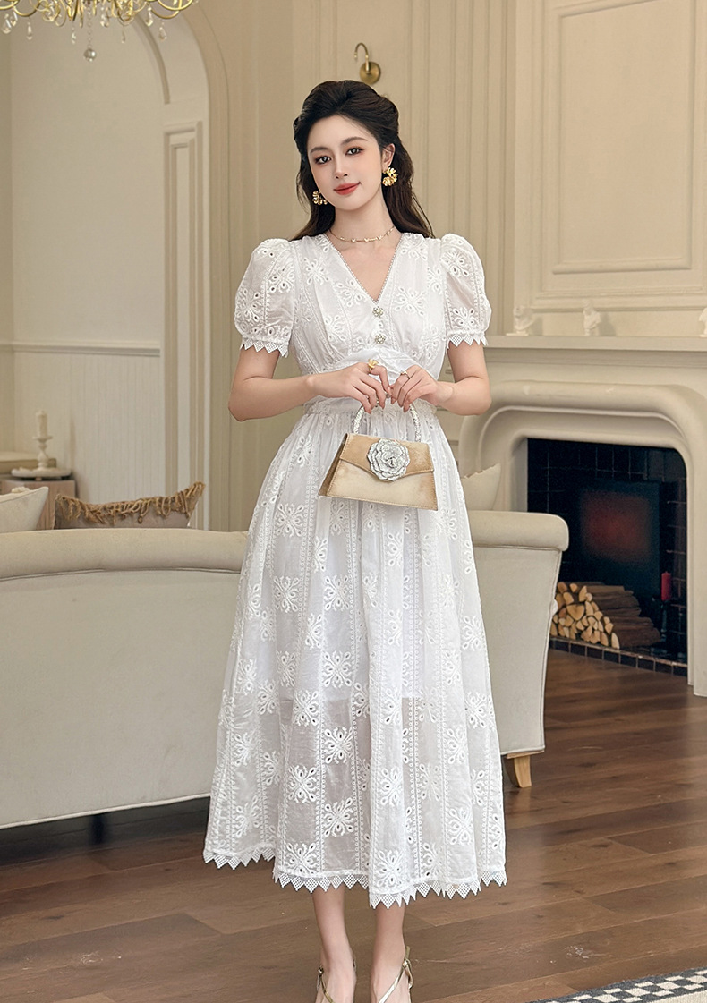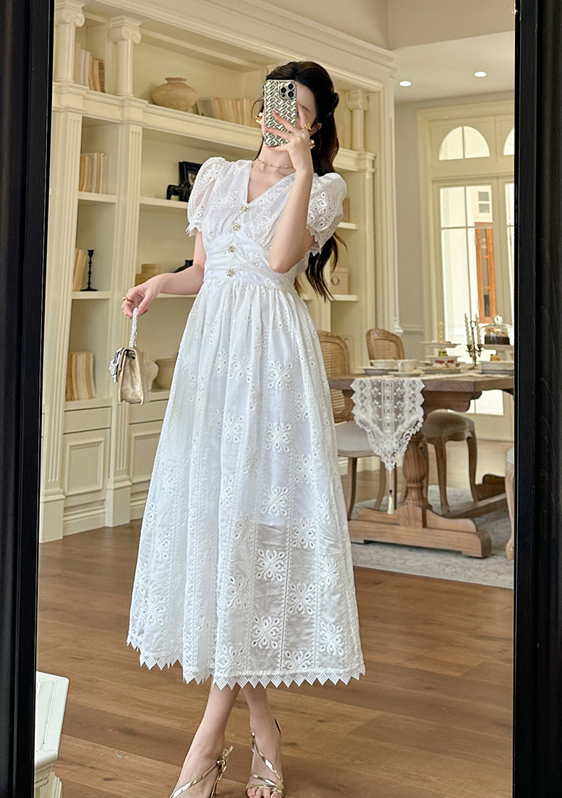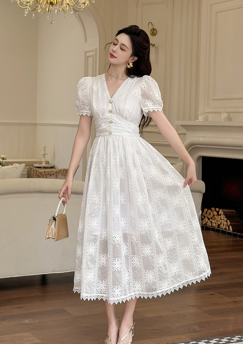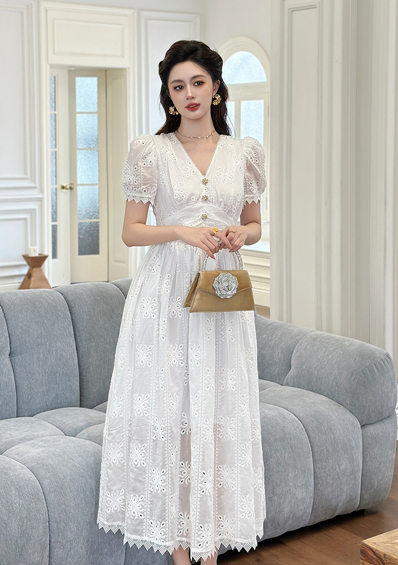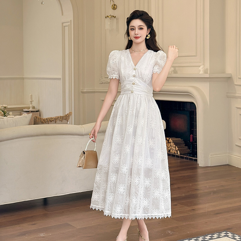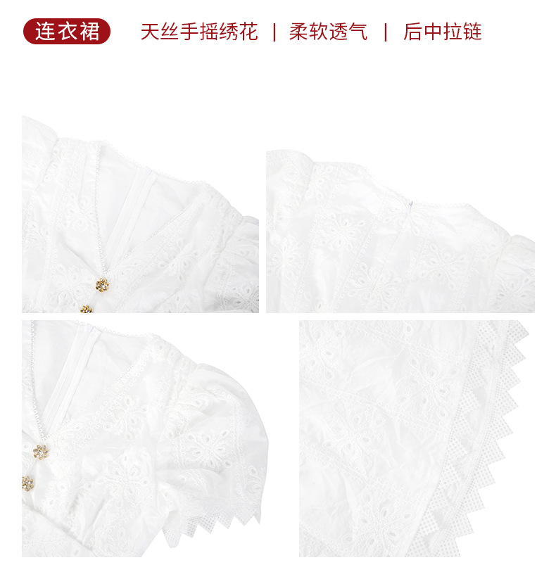 C-4320# 夏季新款女装法式气质V领收腰白色蕾丝连衣裙温柔风小仙女裙45223