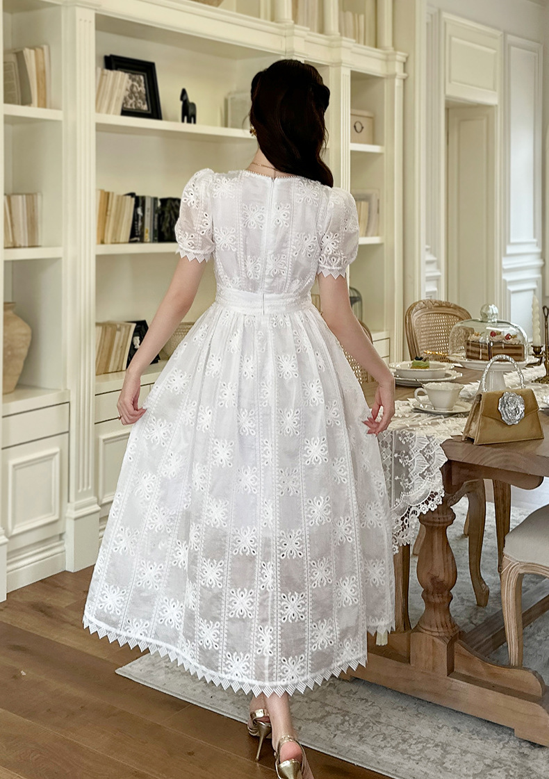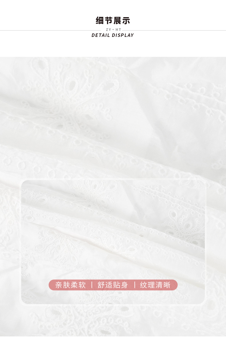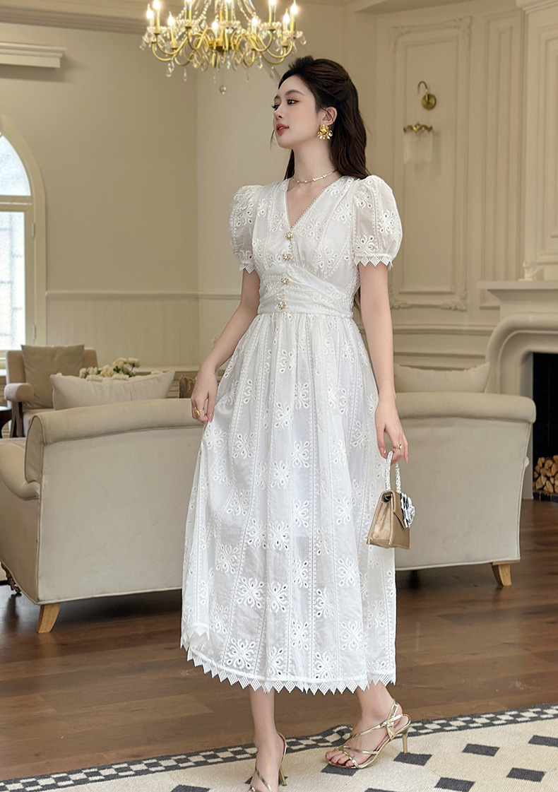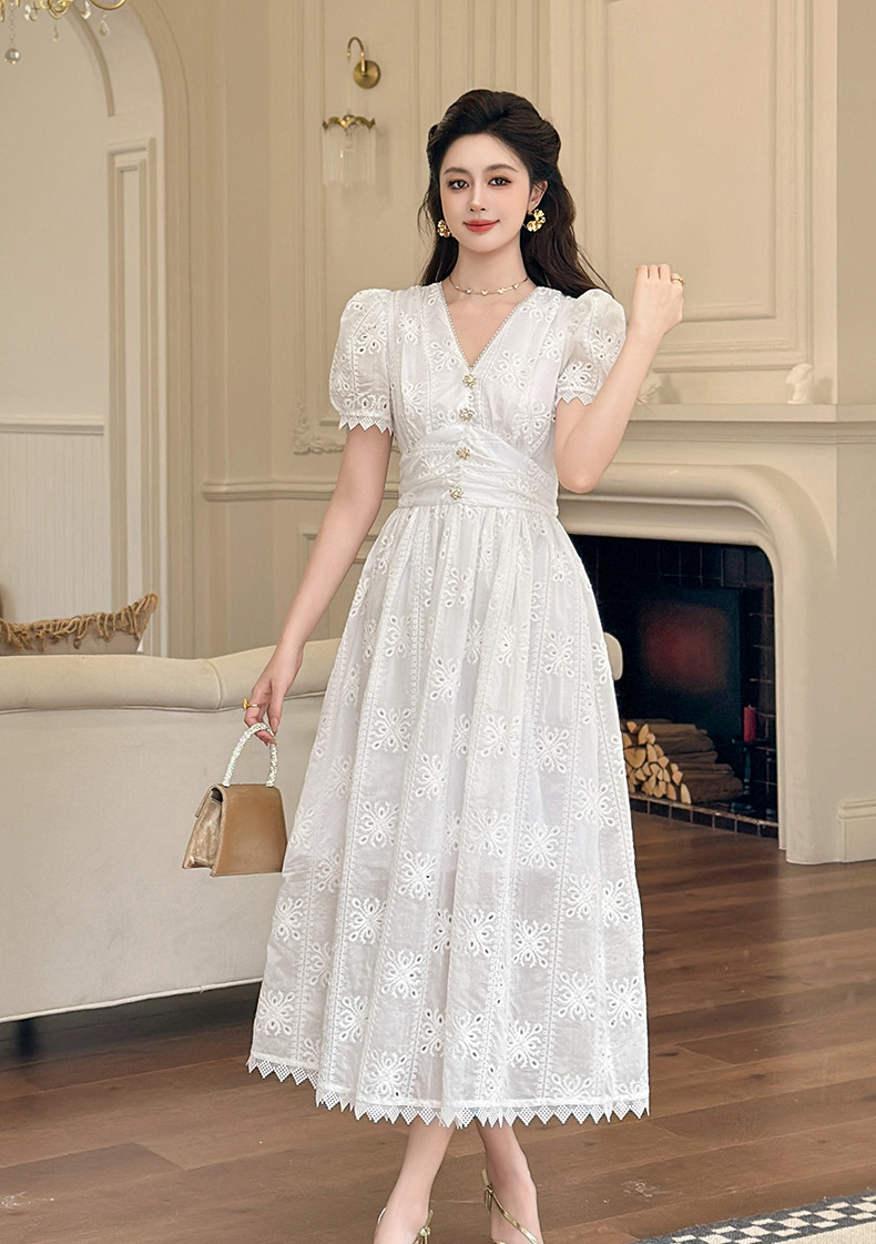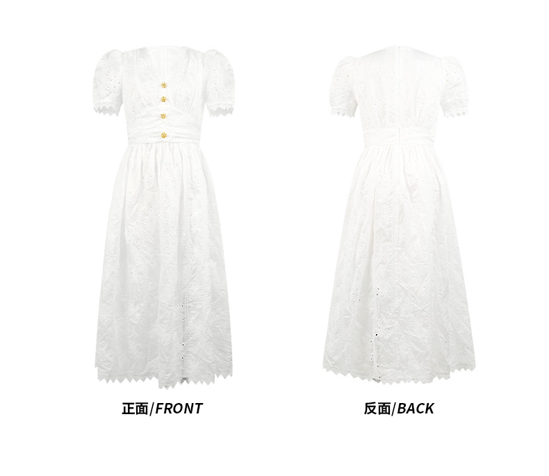 C-4320# 夏季新款女装法式气质V领收腰白色蕾丝连衣裙温柔风小仙女裙45223