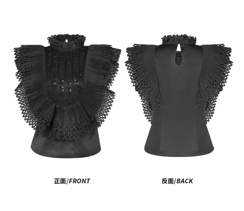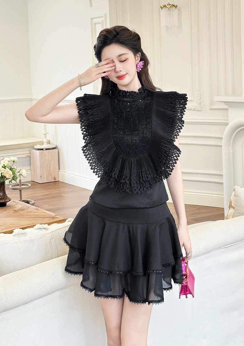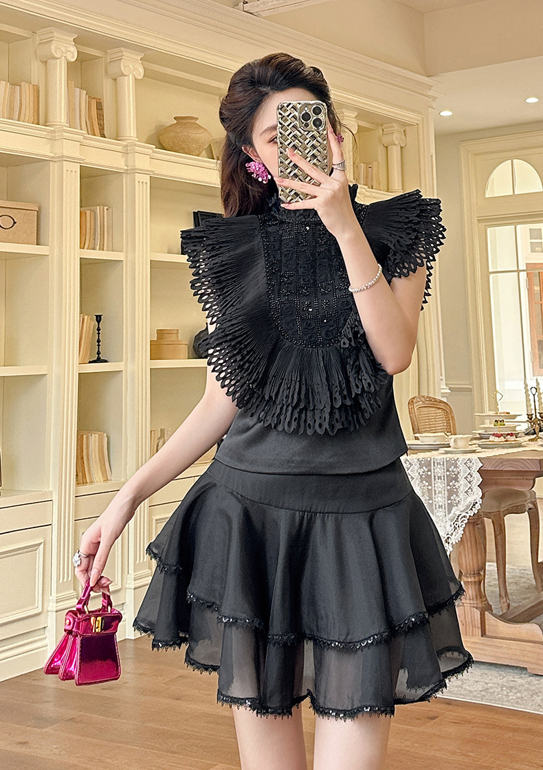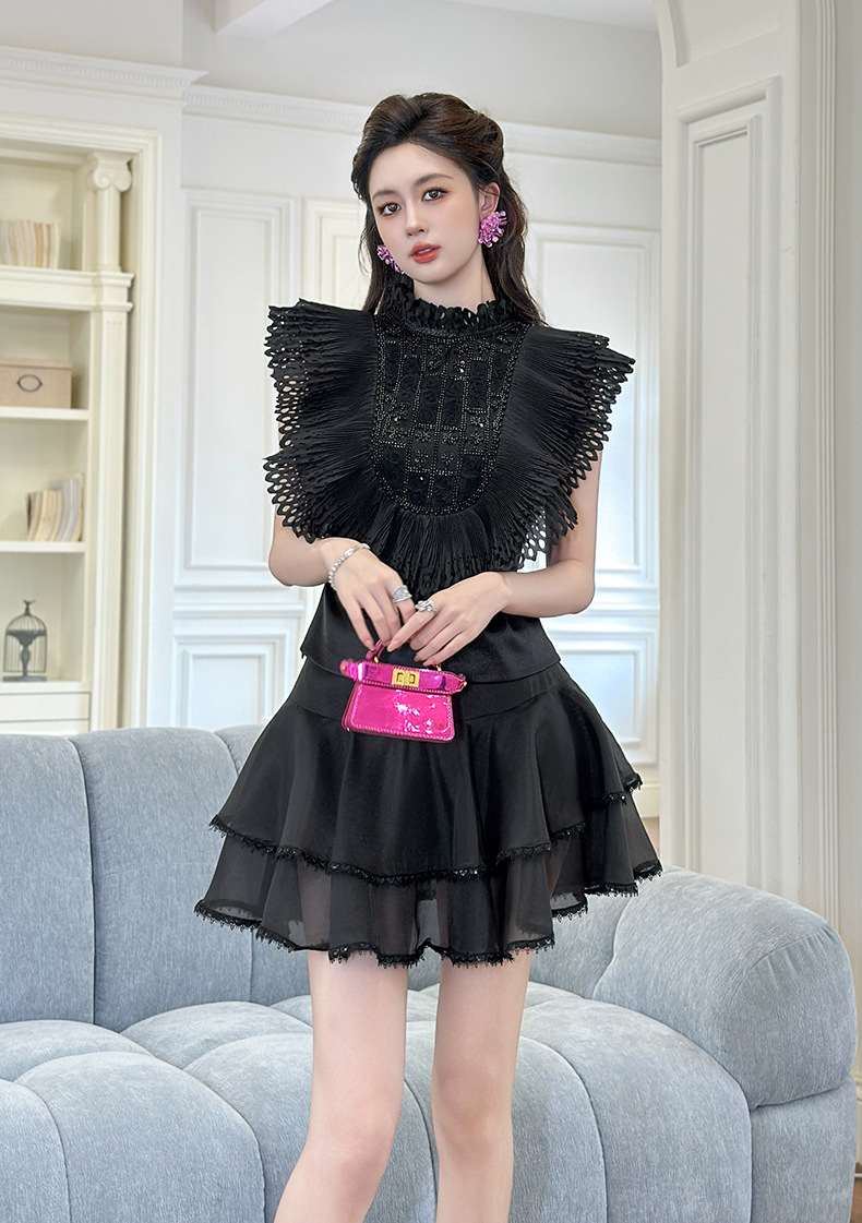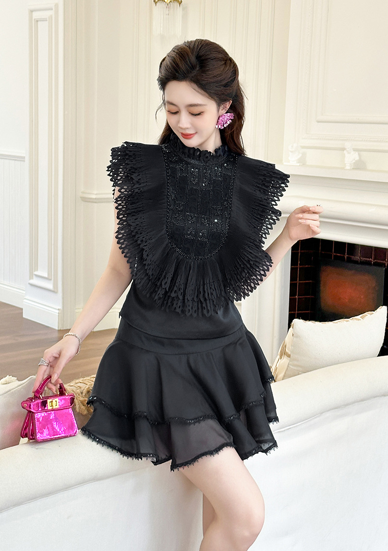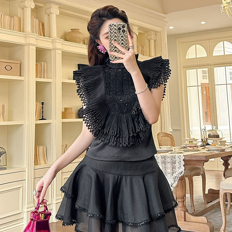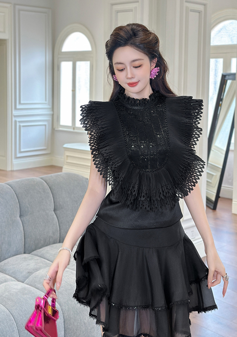 C-4322# 2025夏季新款女法式重工钉珠设计感荷叶边修身显瘦衬衫上衣91621