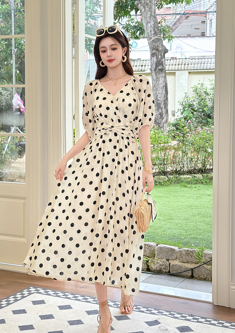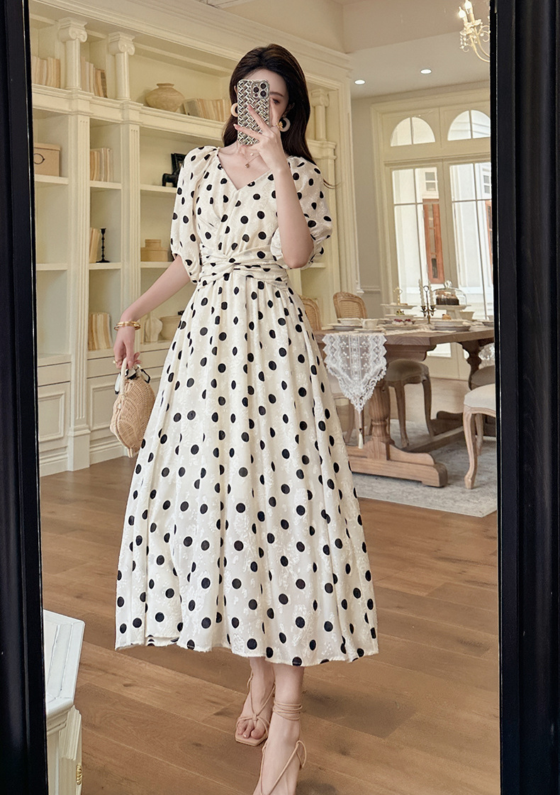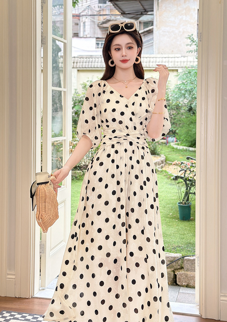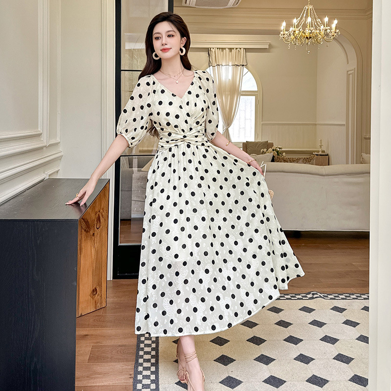 C-4327# 2025夏季新款女装法式V领收腰显高五分袖波点连衣裙茶歇长裙45237
