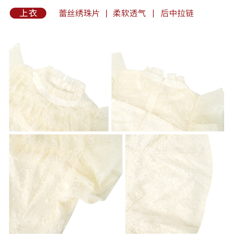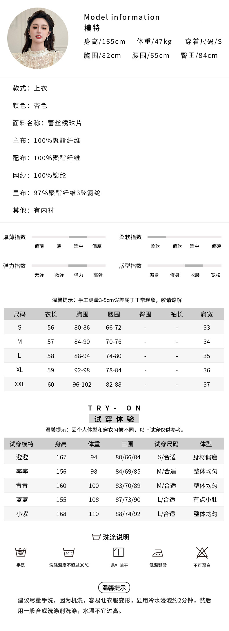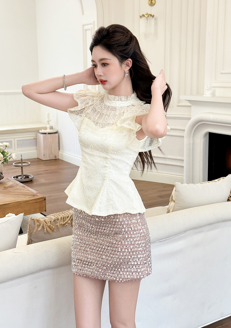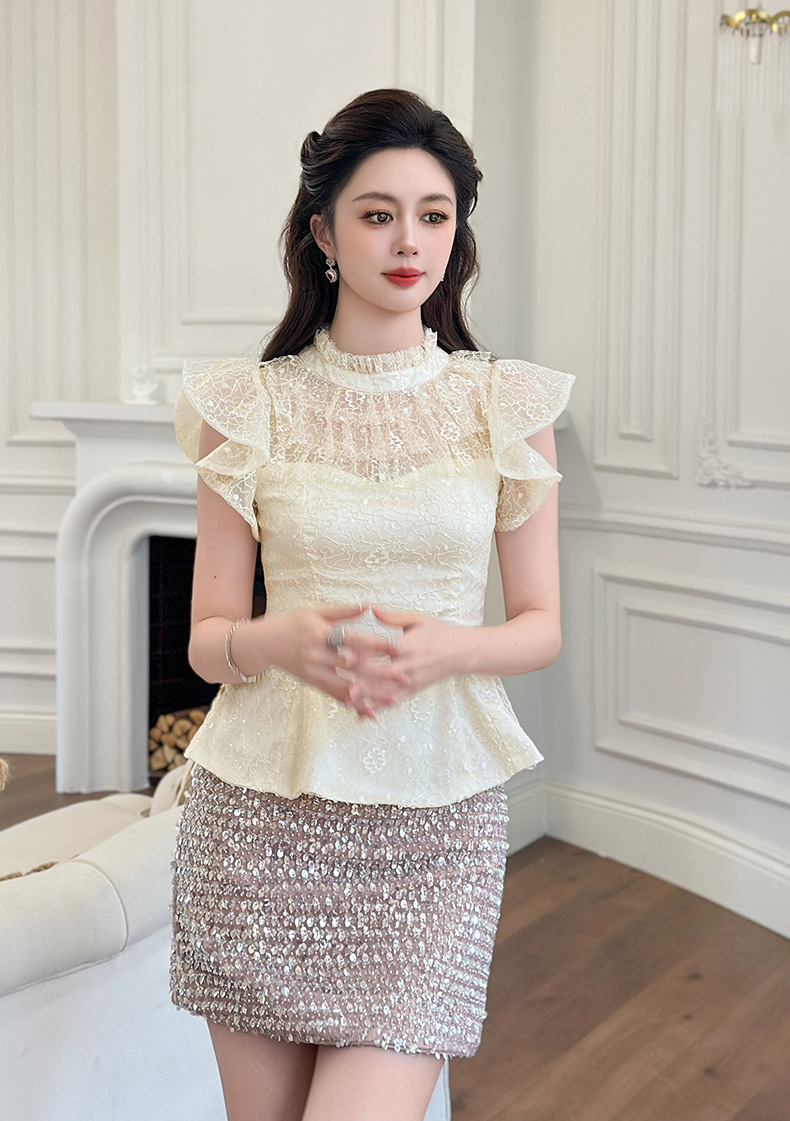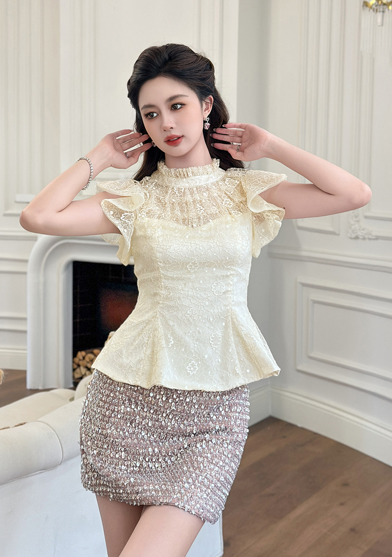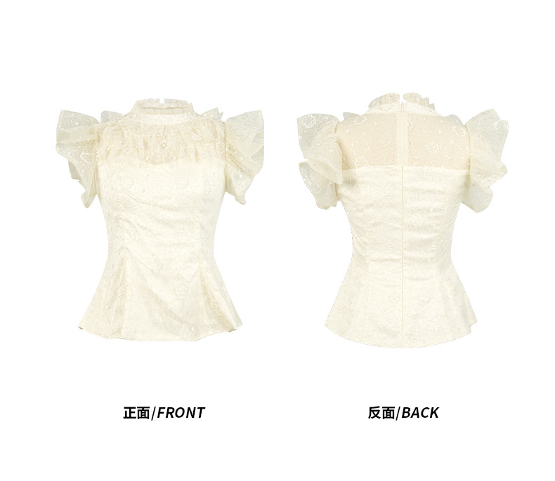 C-4328# 2025夏季新款甜美气质千金风立领荷叶边短袖修身蕾丝上衣女11581