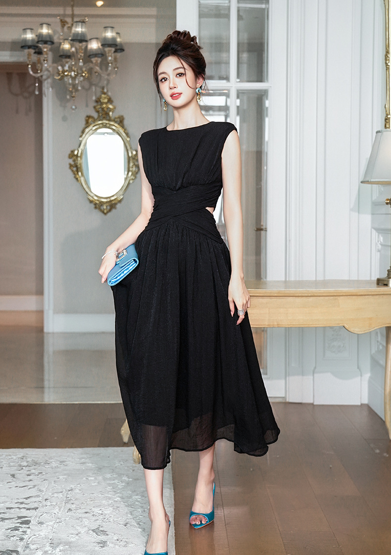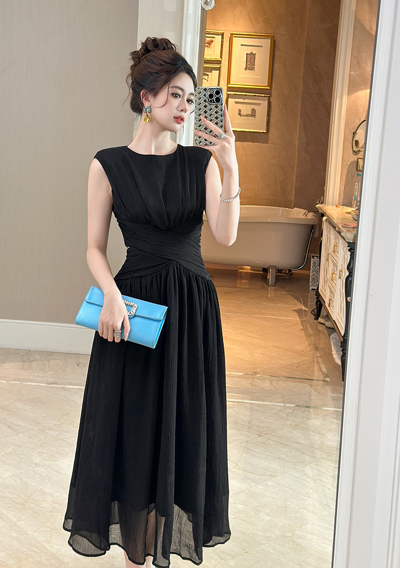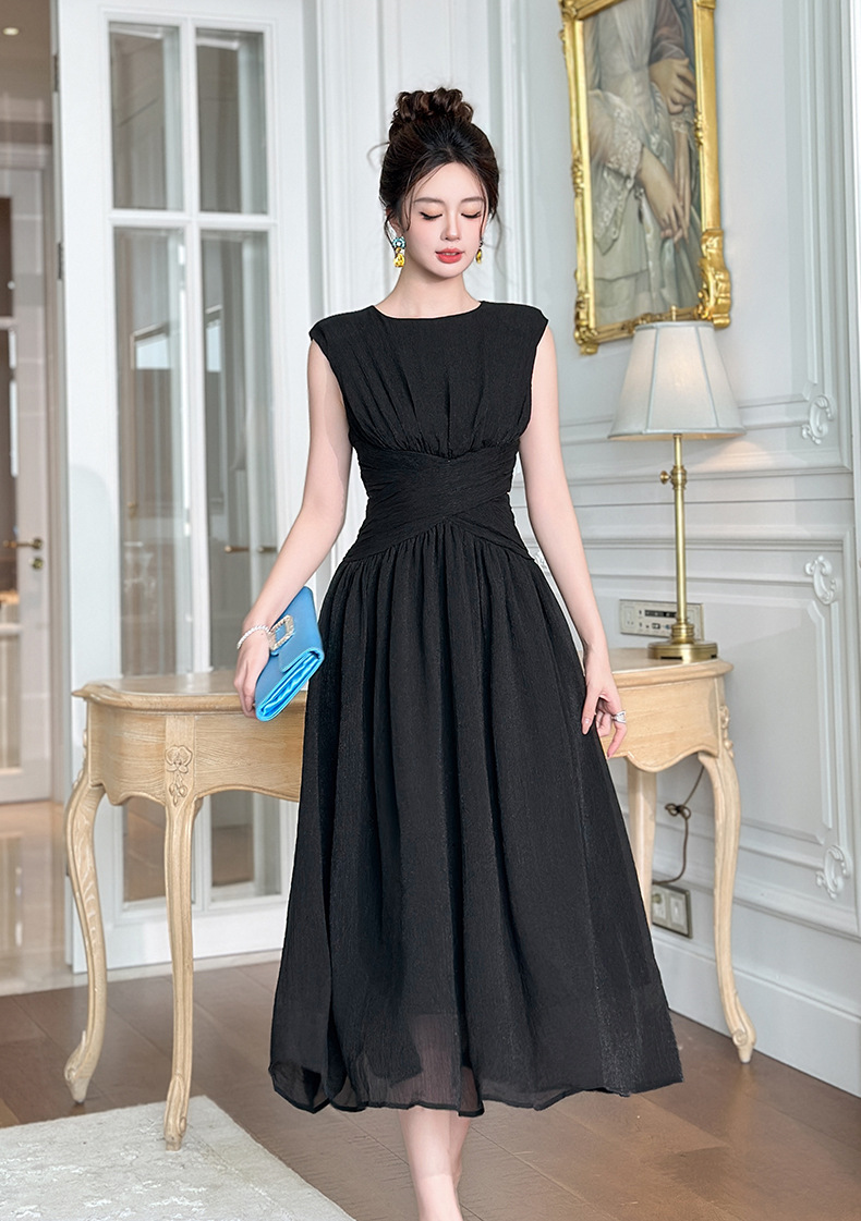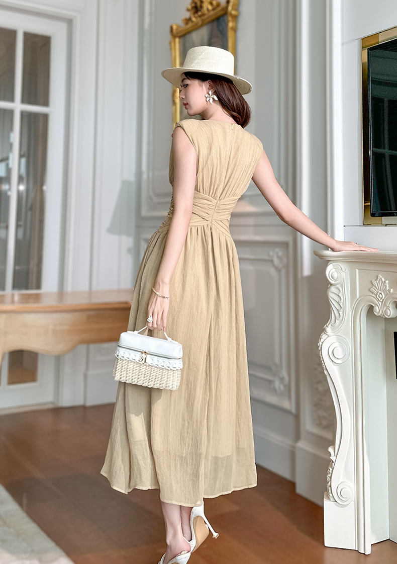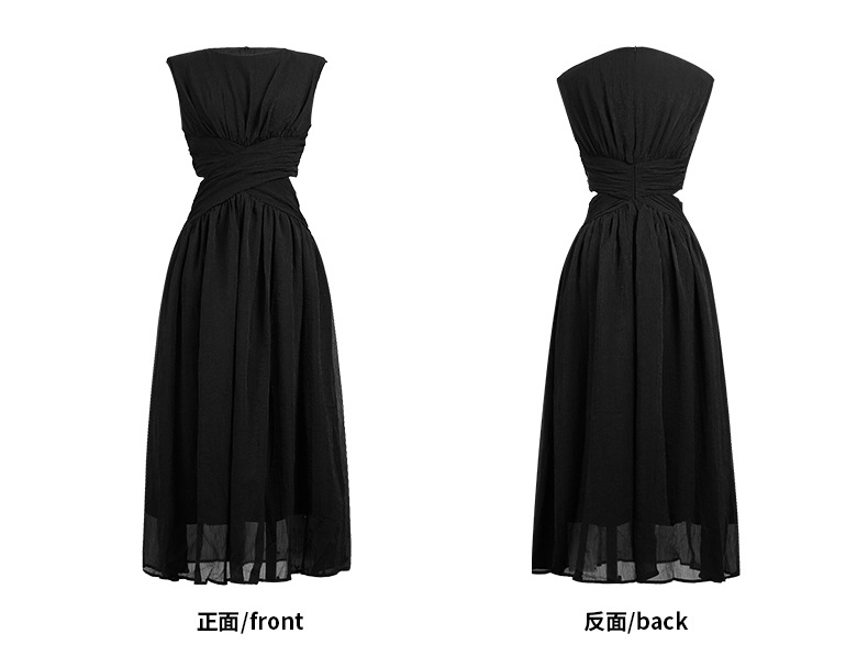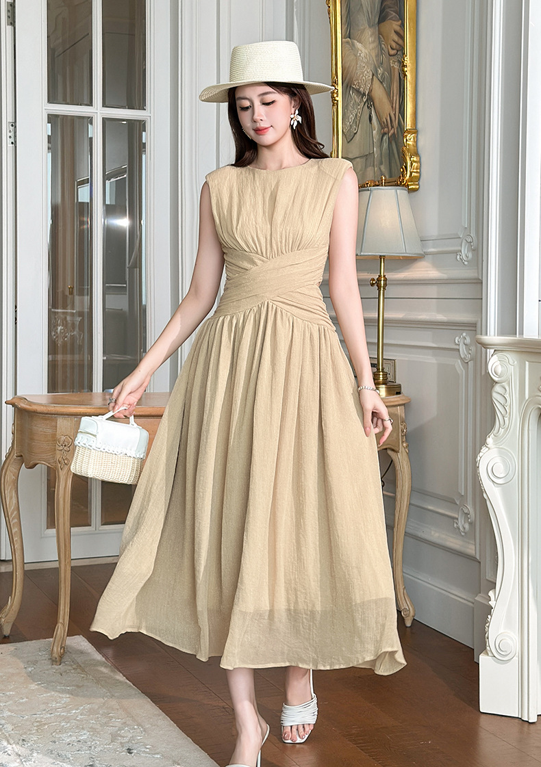 C-4335# 2025夏季新款女装温柔风气质设计感交叉收腰无袖长款连衣裙9886
