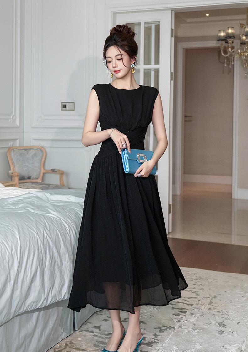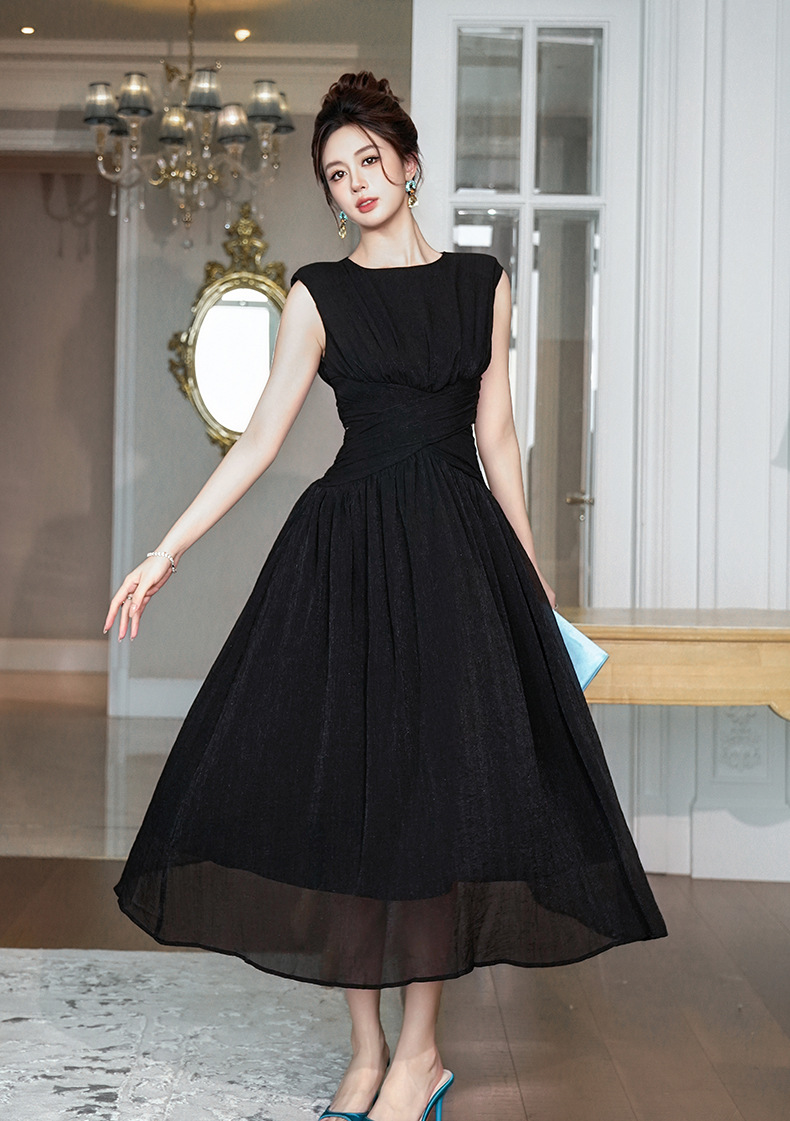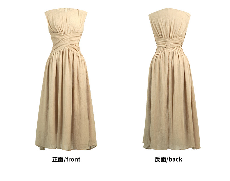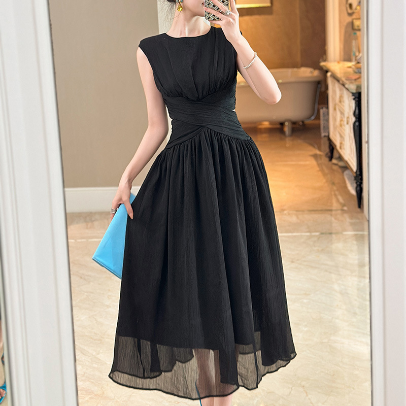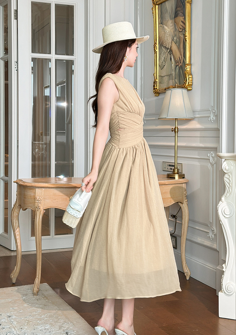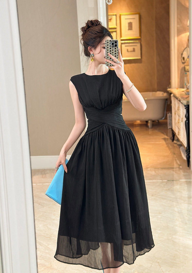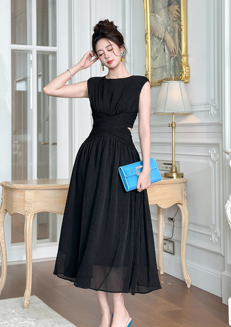 C-4335# 2025夏季新款女装温柔风气质设计感交叉收腰无袖长款连衣裙9886