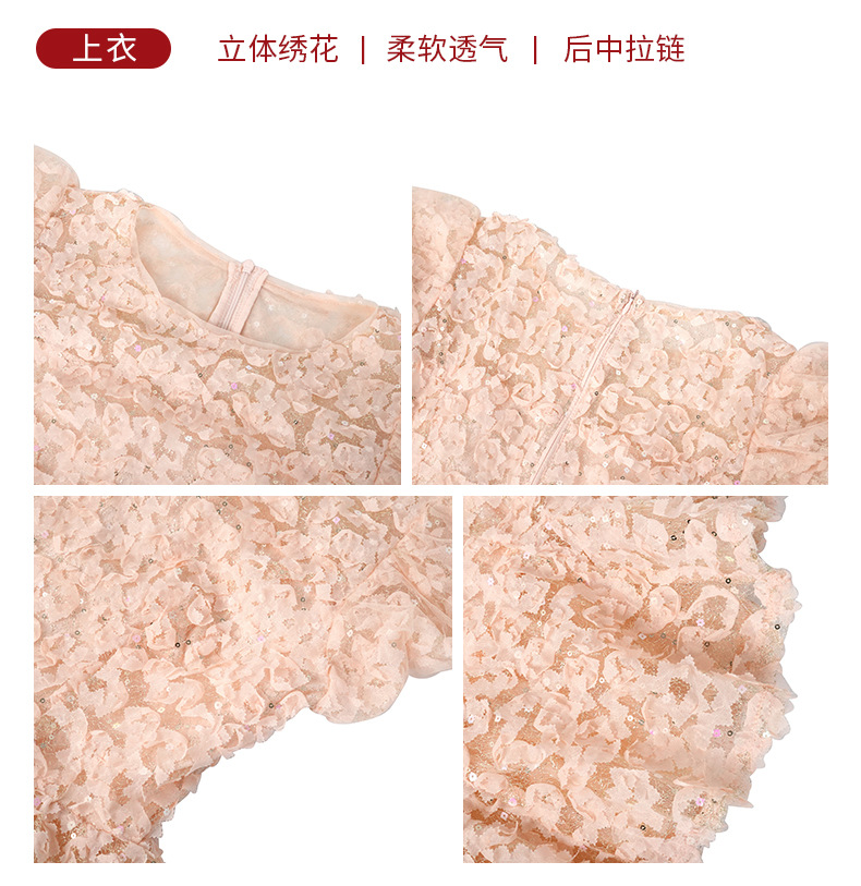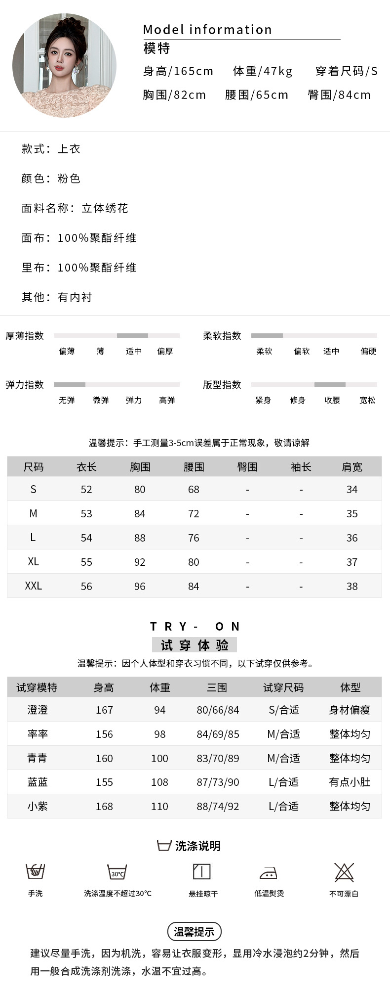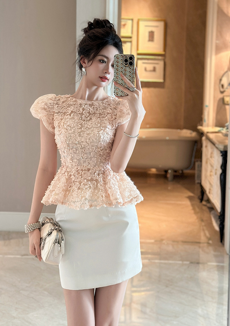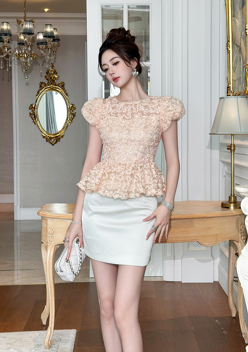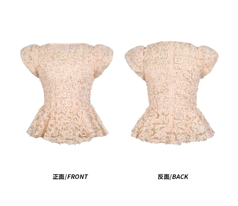 C-4337# 2025夏季新款女法式圆领泡泡袖收腰立体花朵荷叶边蕾丝上衣11612