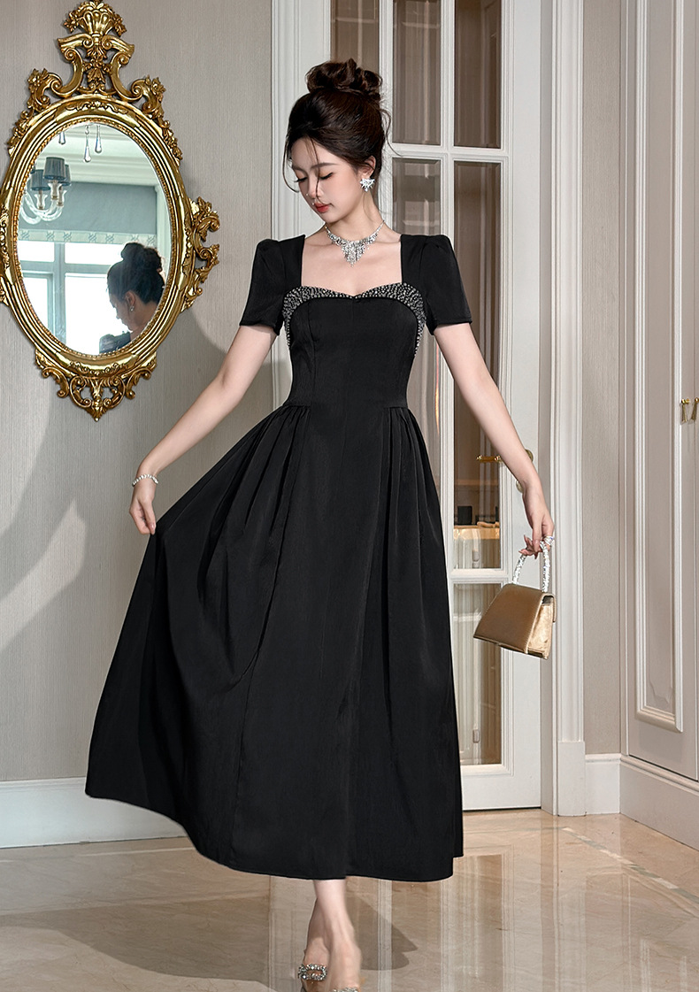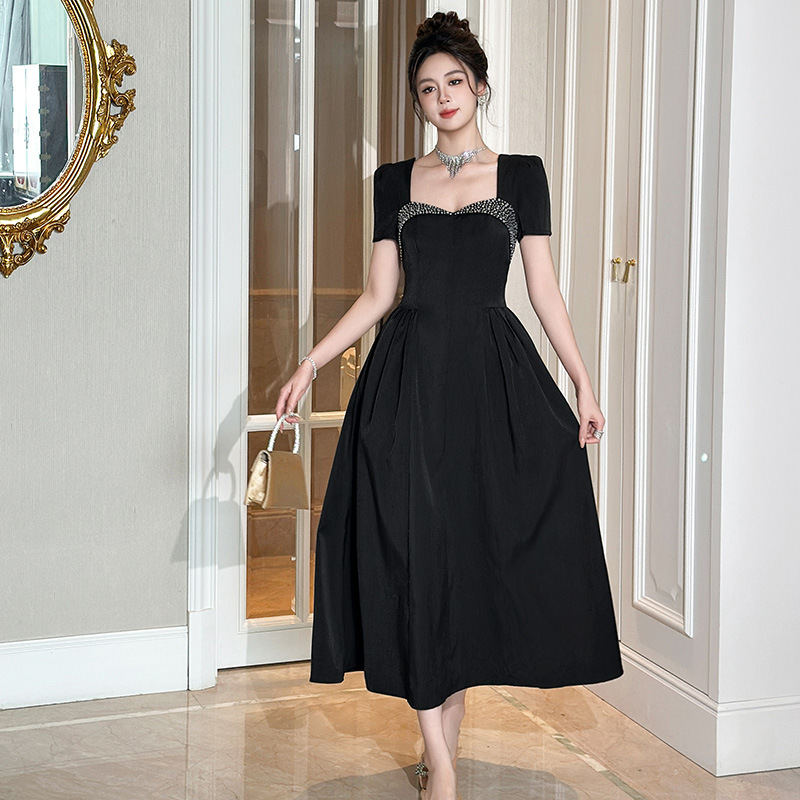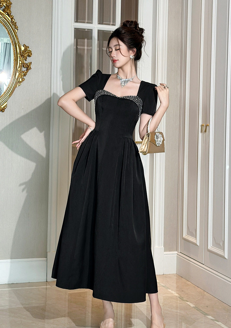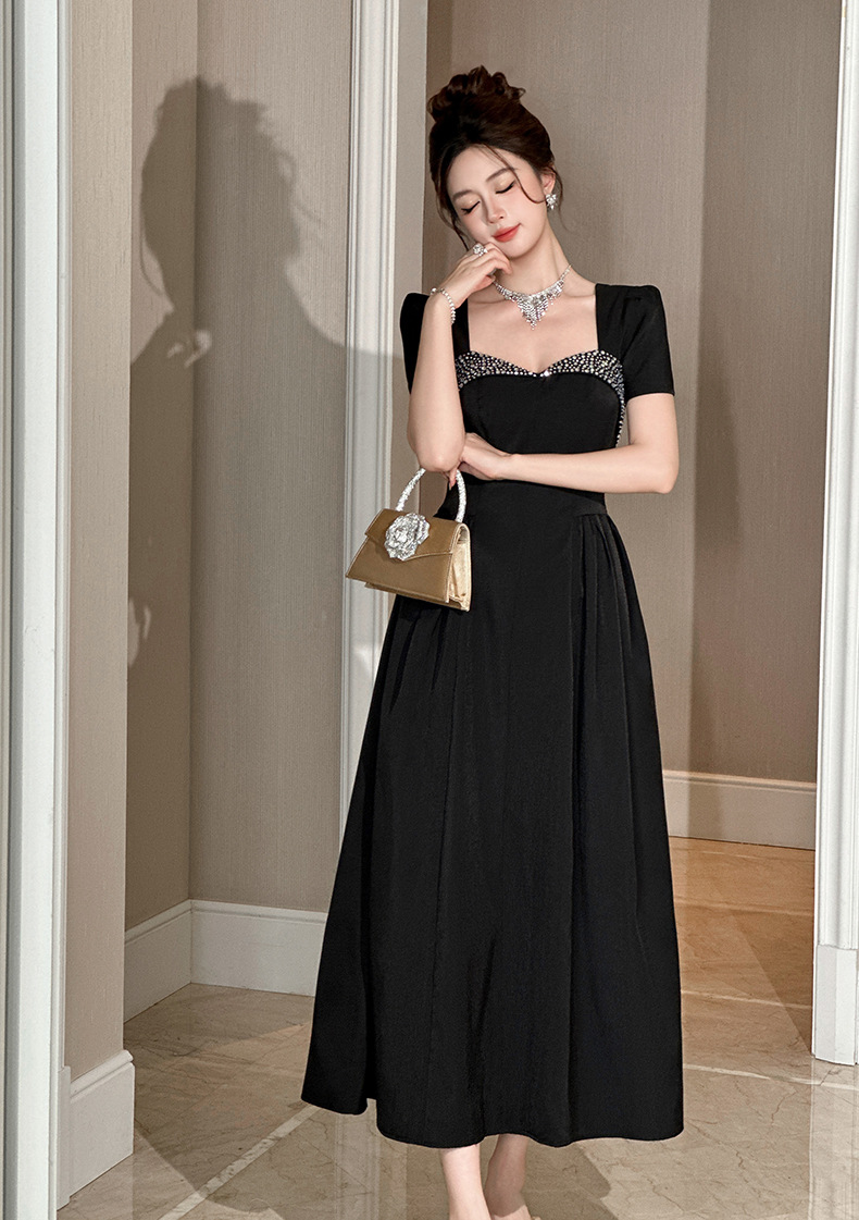 C-4356# 2025夏季新款女装重工设计感镶钻收腰大摆连衣裙赫本风长裙9053