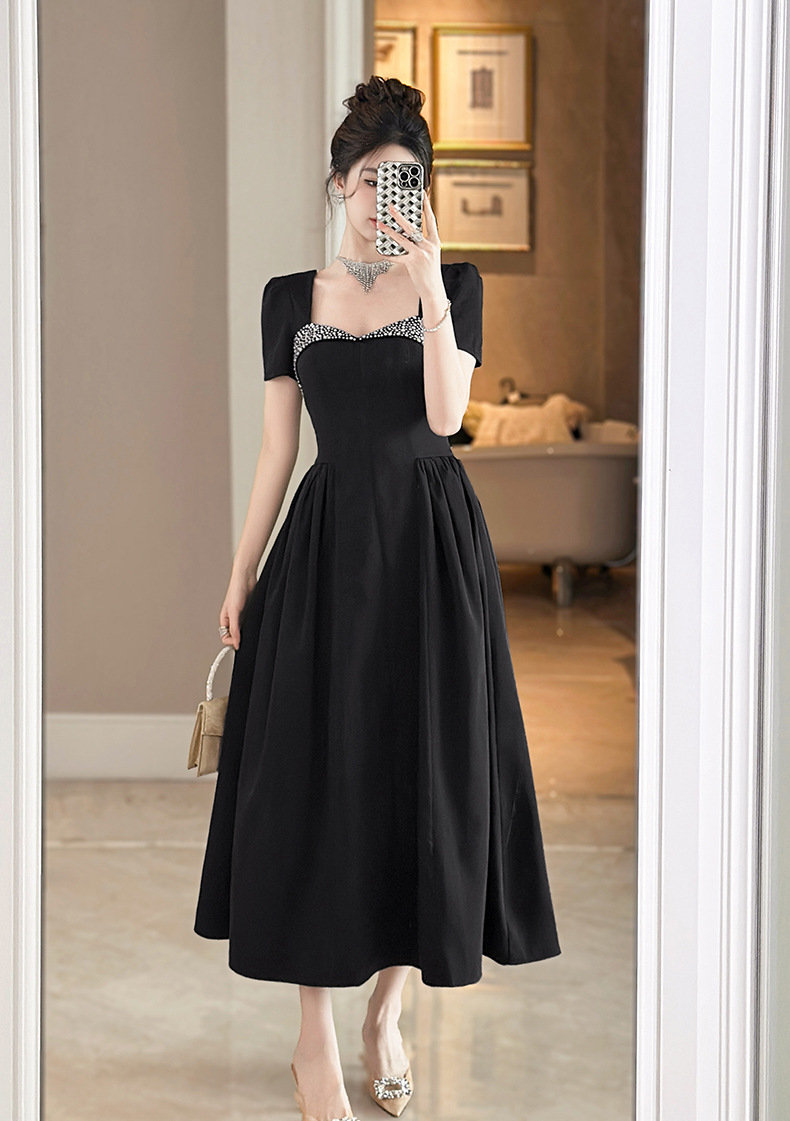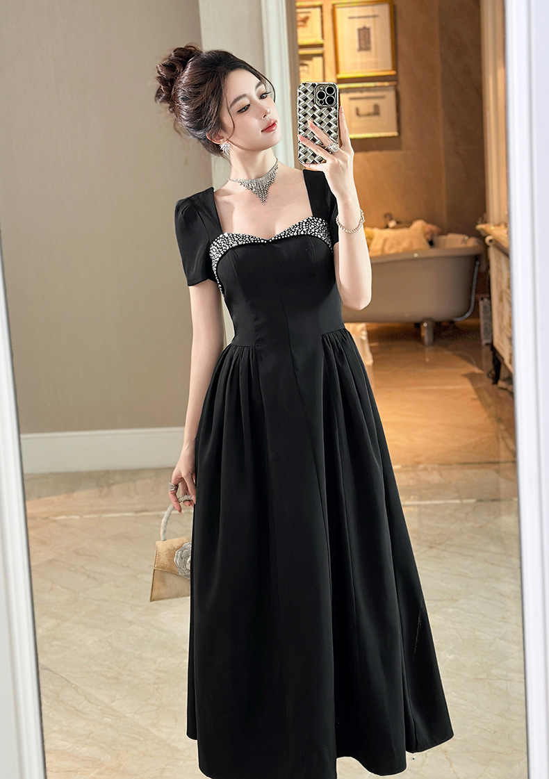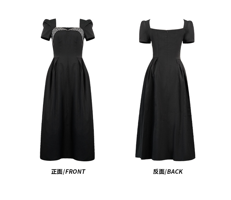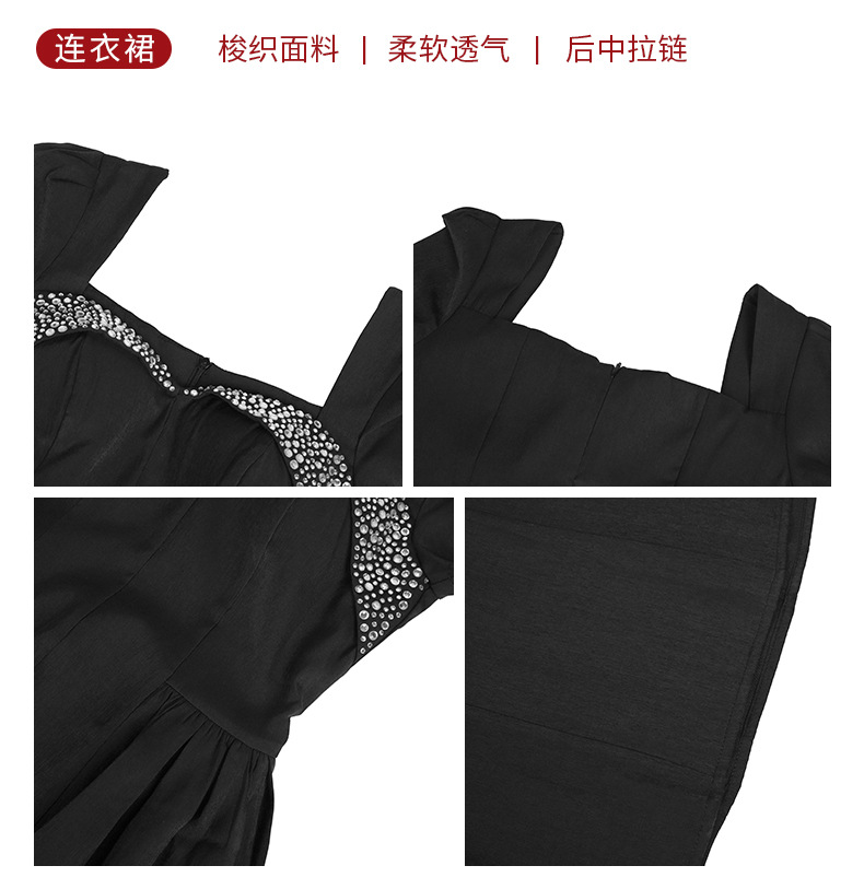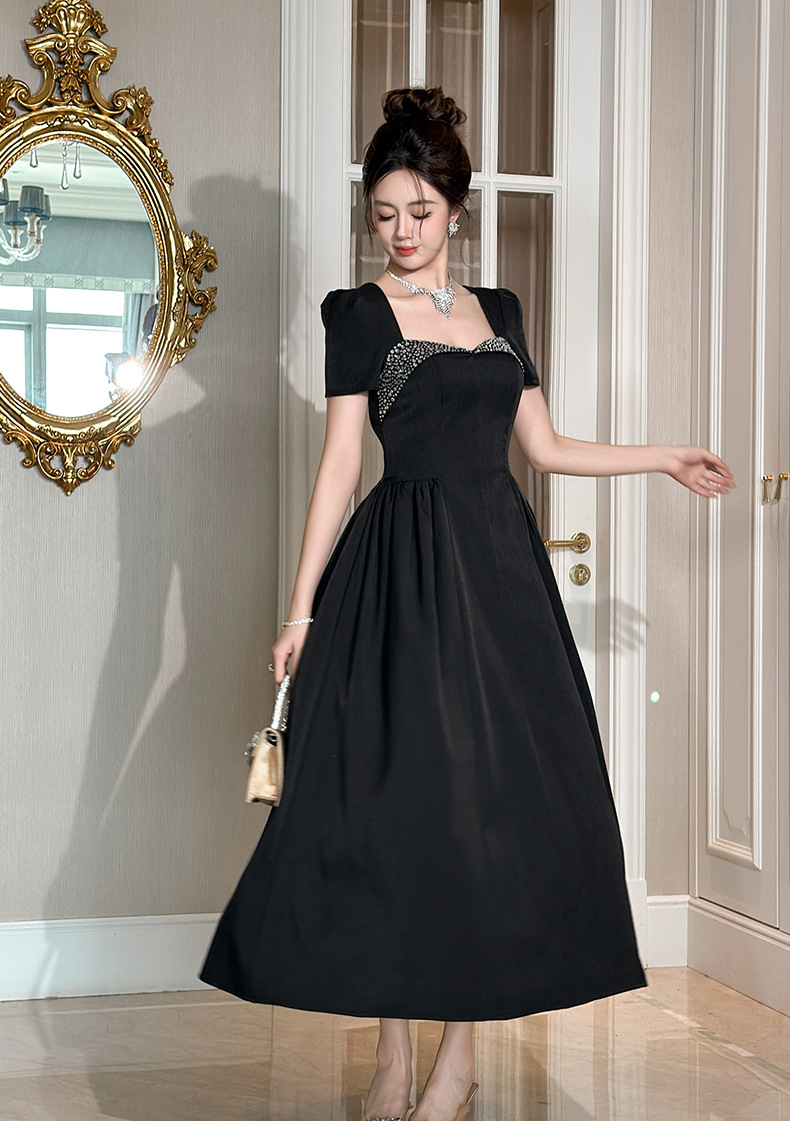 C-4356# 2025夏季新款女装重工设计感镶钻收腰大摆连衣裙赫本风长裙9053