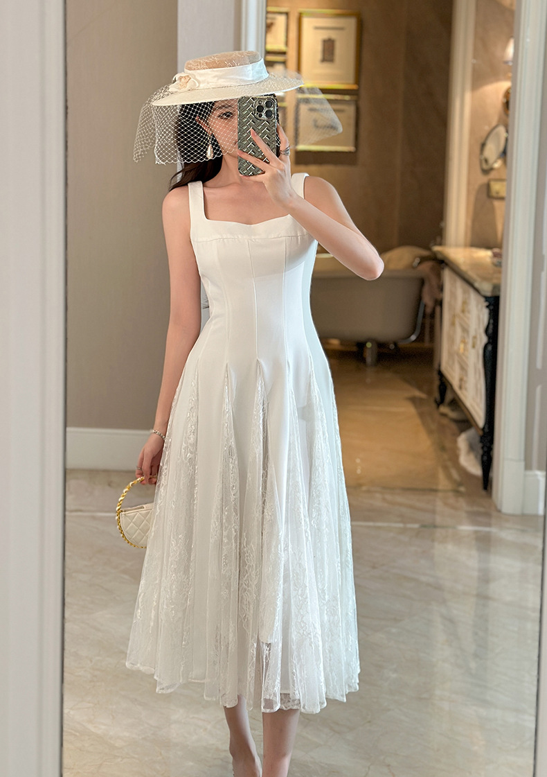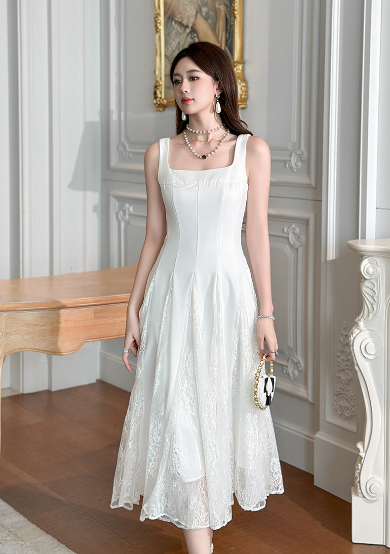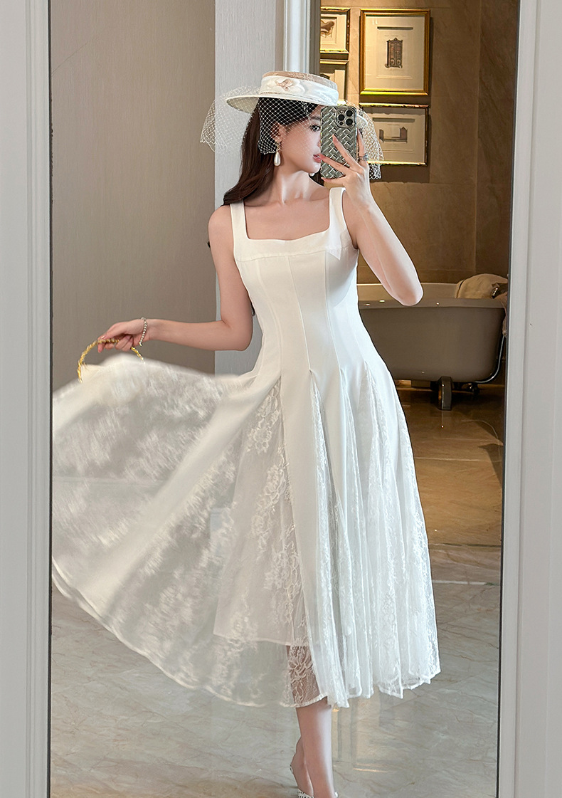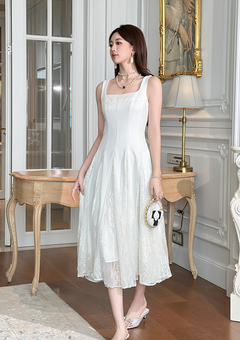 C-4357# 2025夏季新款女装法式方领收腰设计感蕾丝拼接大摆吊带连衣裙9741
