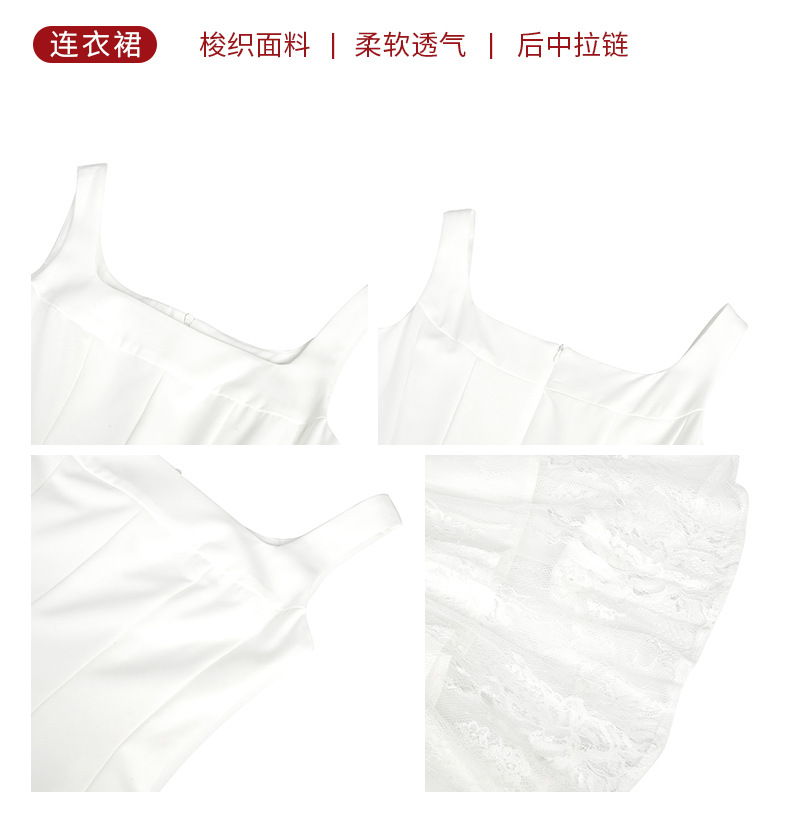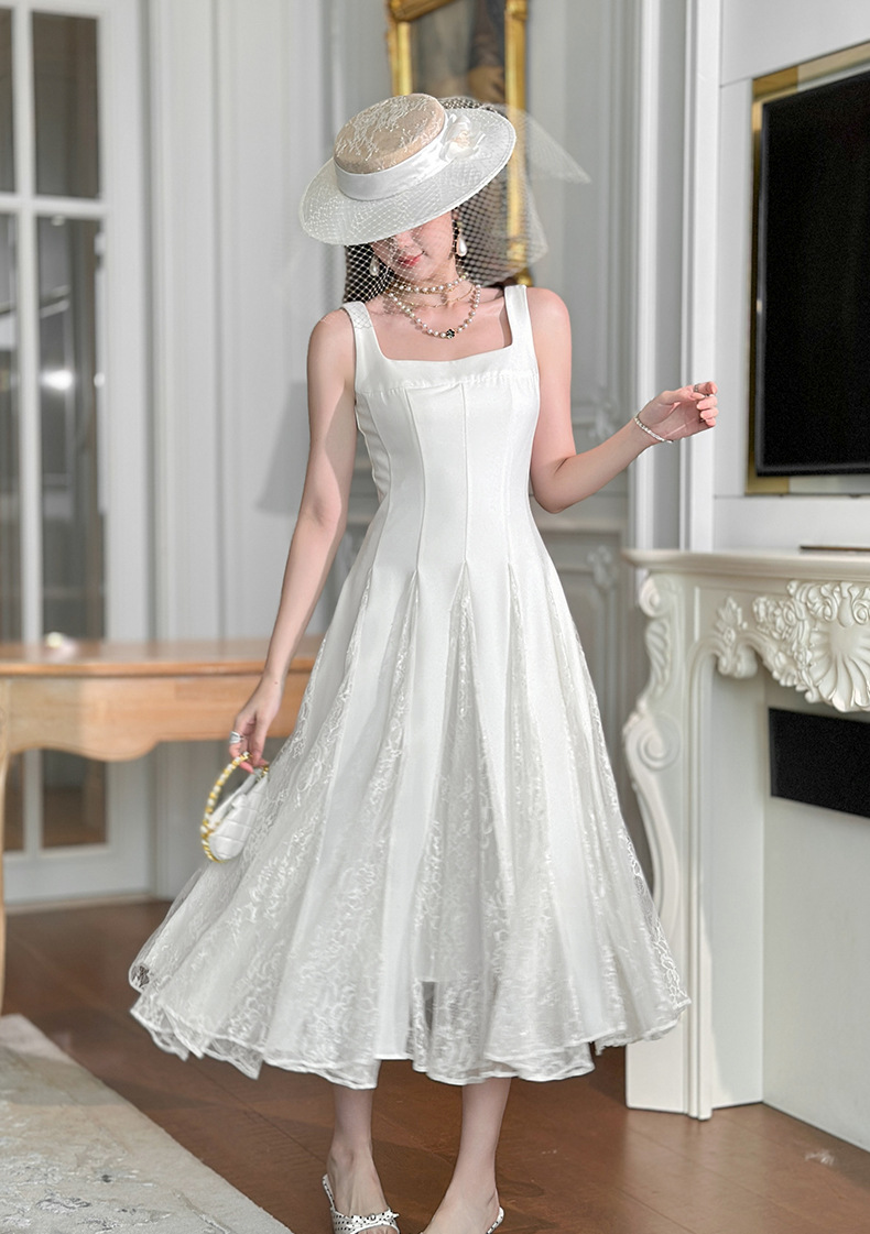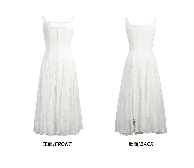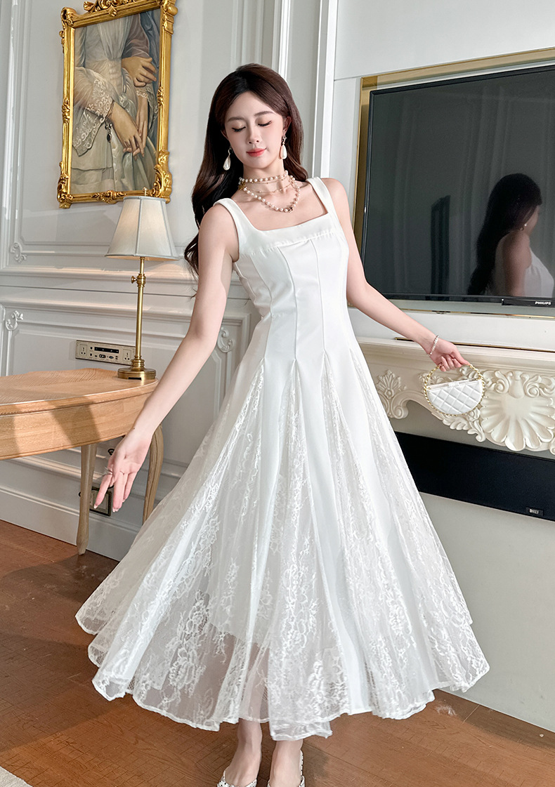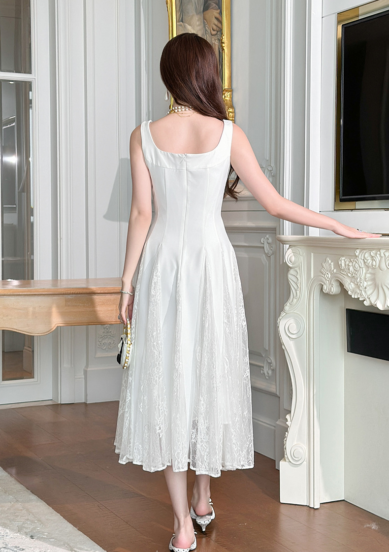 C-4357# 2025夏季新款女装法式方领收腰设计感蕾丝拼接大摆吊带连衣裙9741